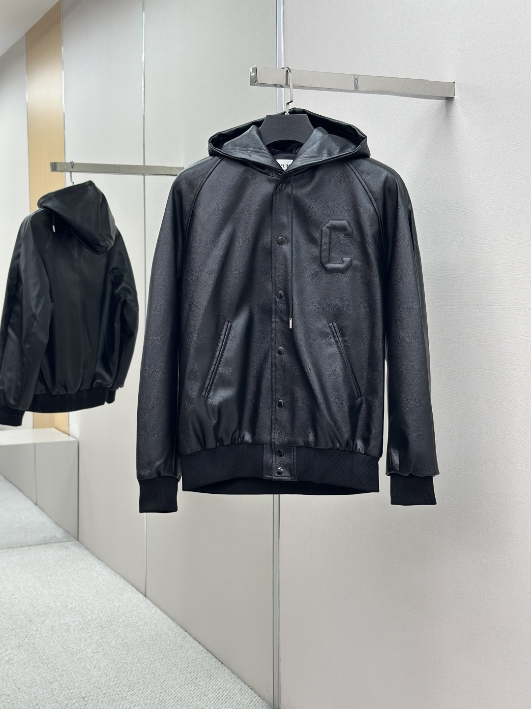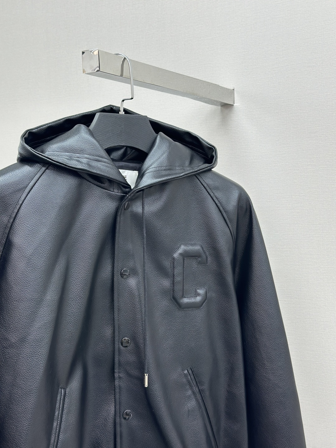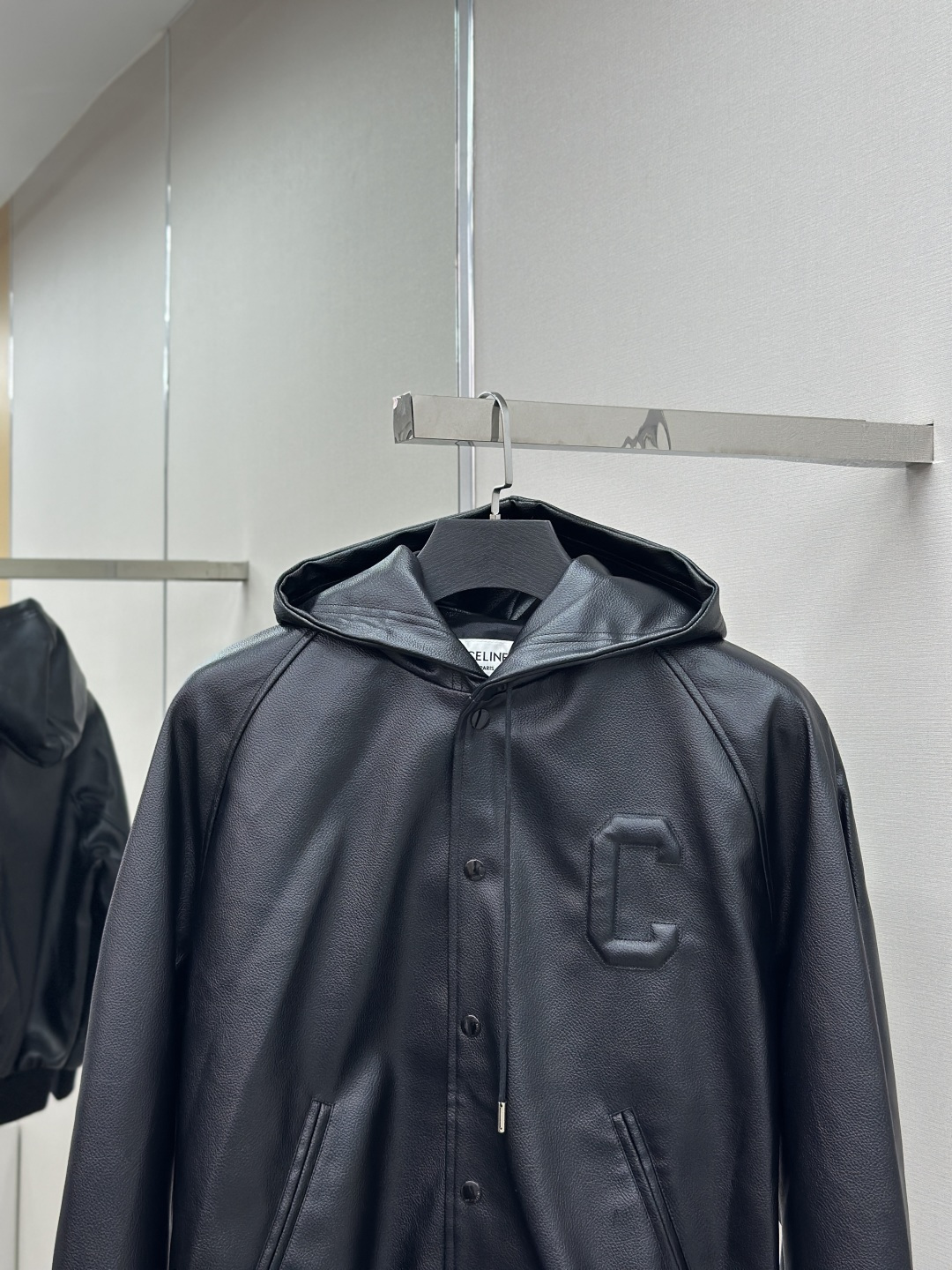 Celine leather hoodie. Custom calfskin leather and premium tencel lining. Natural sheen, iconic "C" logo. Black, elegant, versatile. Laser cutting, adhesive bonding, infrared positioning, template pocket. Custom pendant, snap buttons, label. Slim fit. Sizes 46-52. Style 24071-D10.