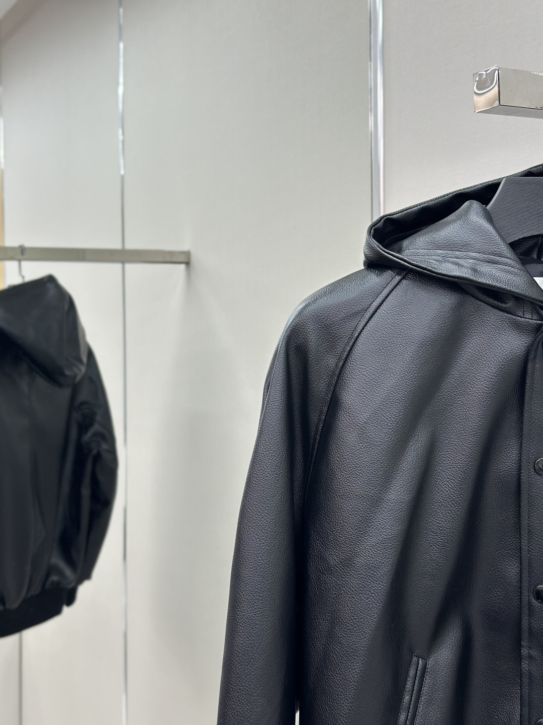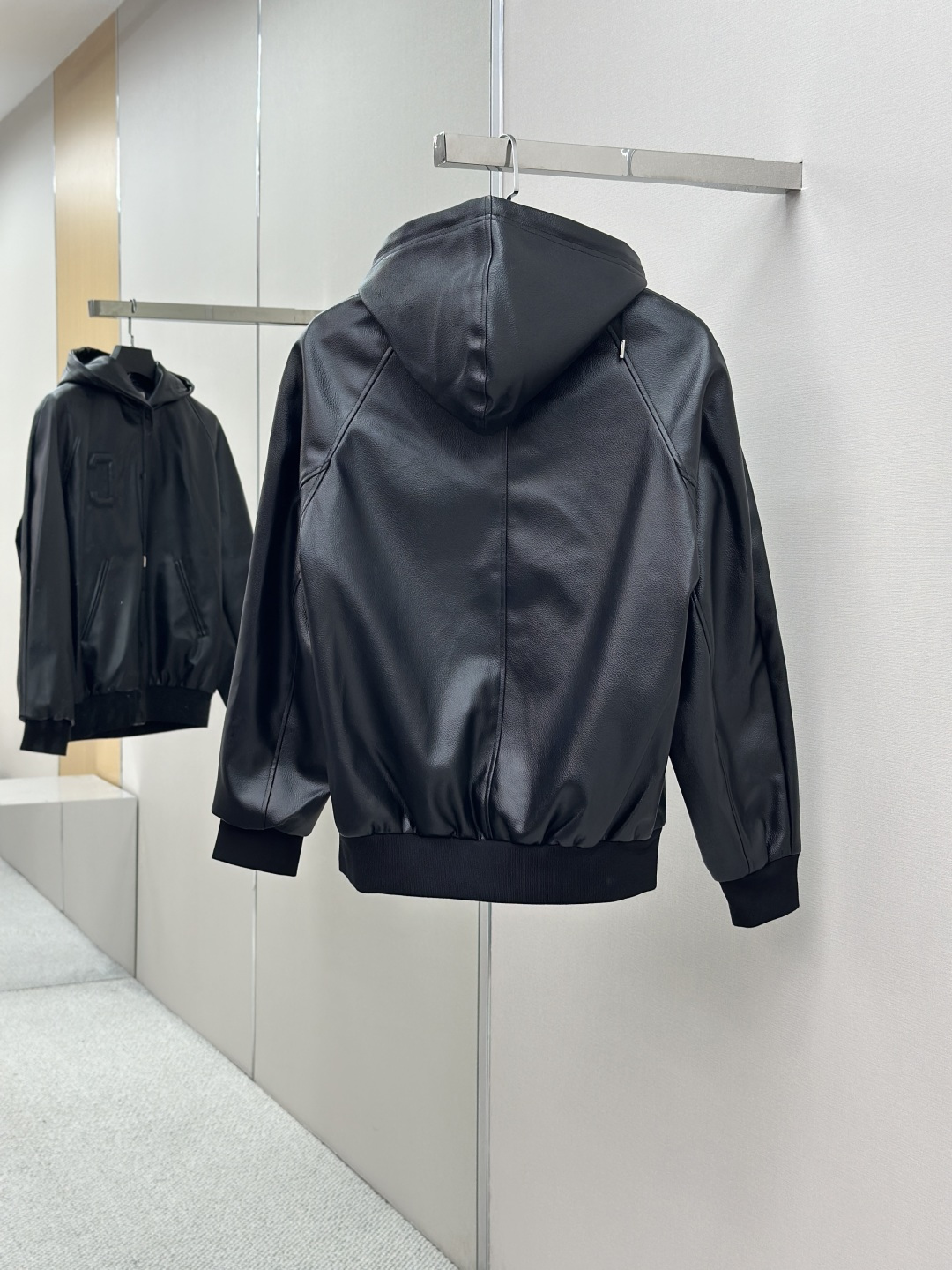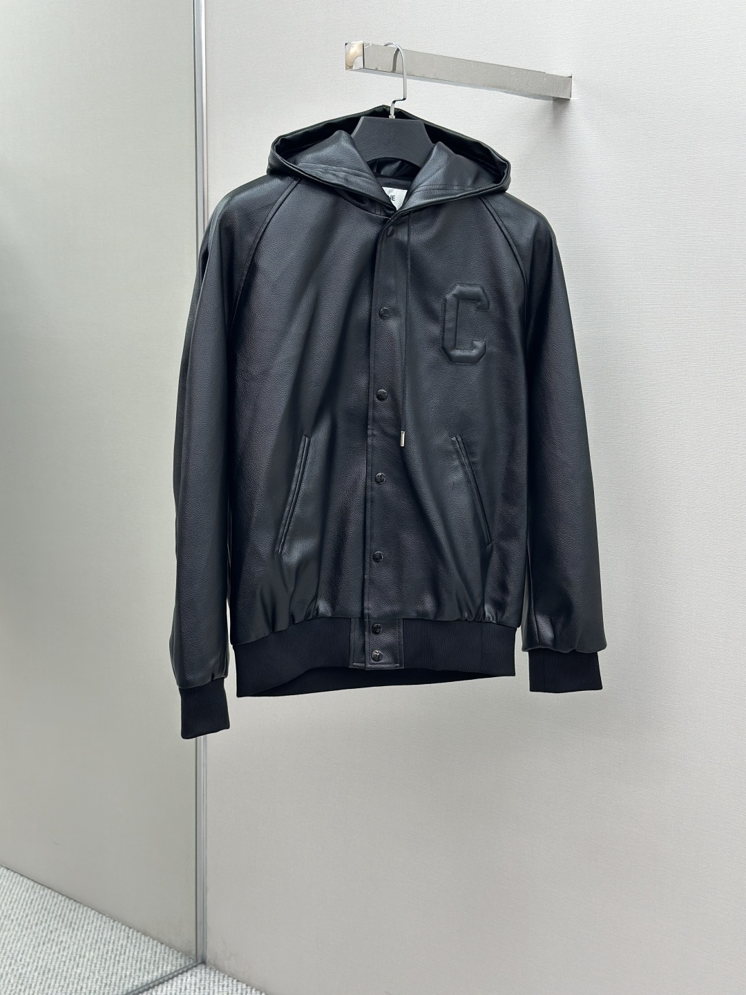 Celine leather hoodie. Custom calfskin leather and premium tencel lining. Natural sheen, iconic "C" logo. Black, elegant, versatile. Laser cutting, adhesive bonding, infrared positioning, template pocket. Custom pendant, snap buttons, label. Slim fit. Sizes 46-52. Style 24071-D10.