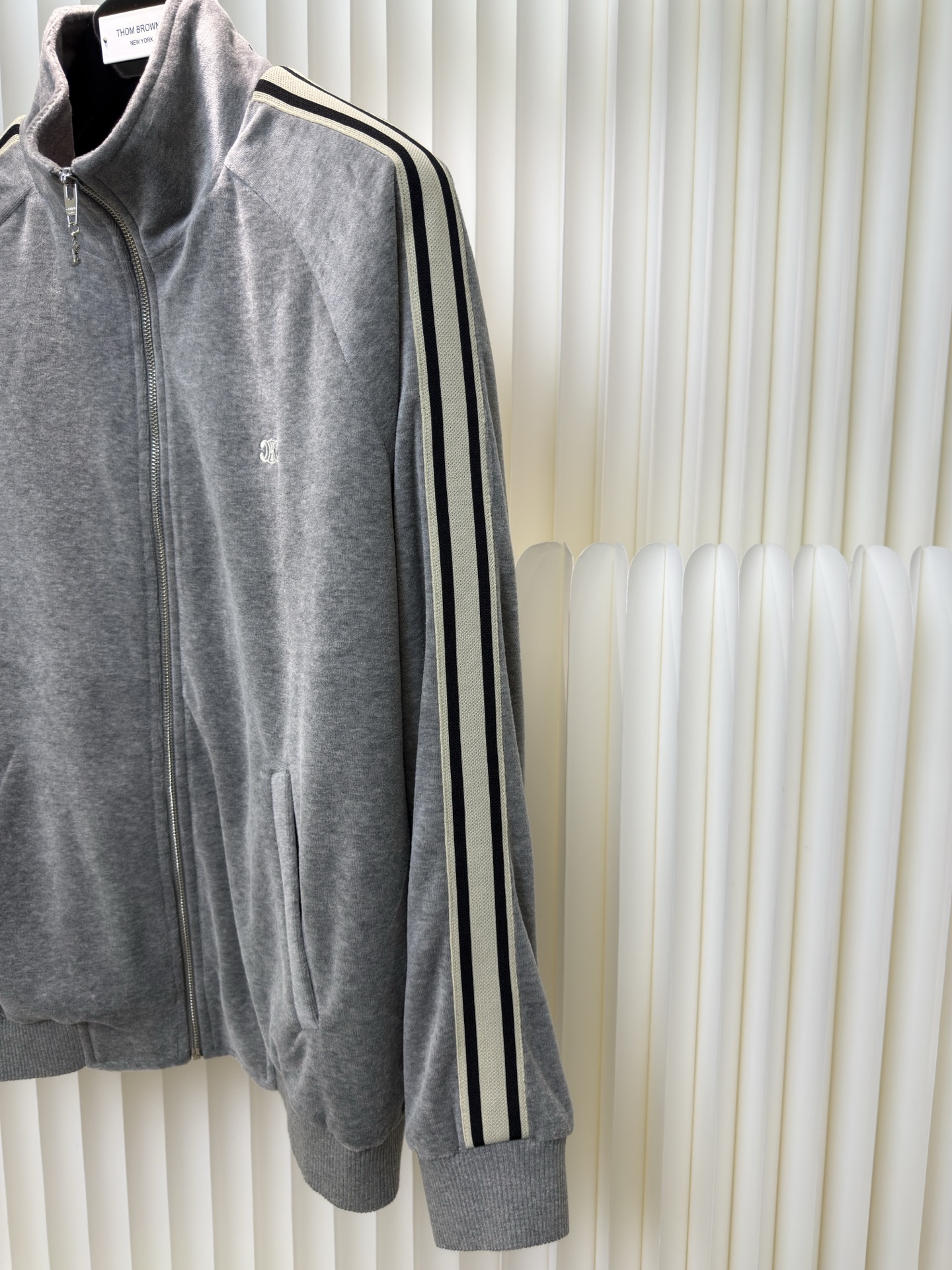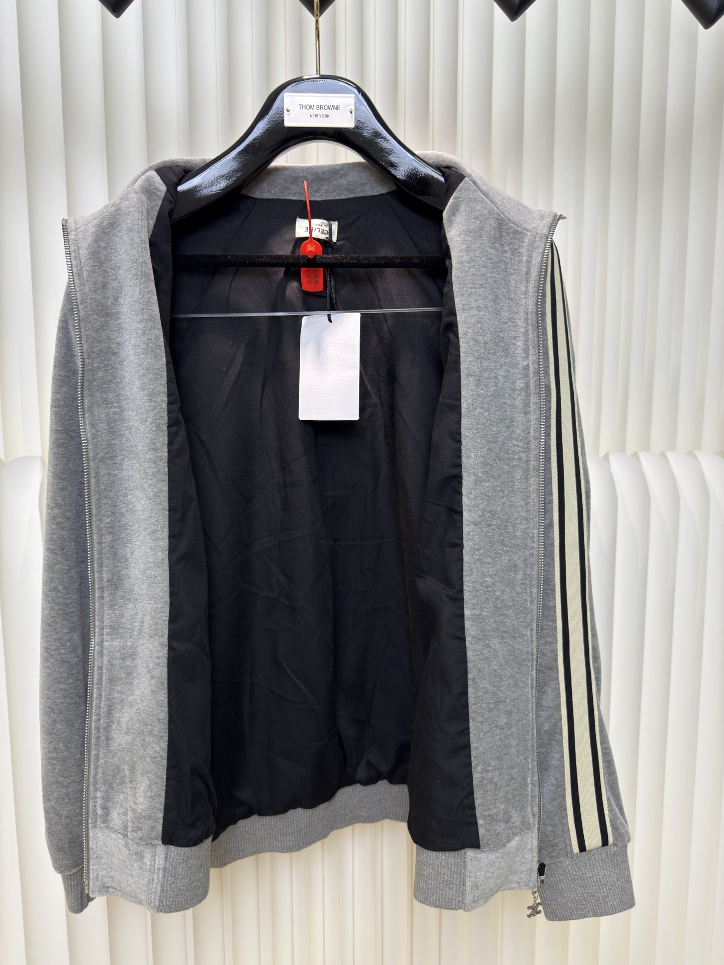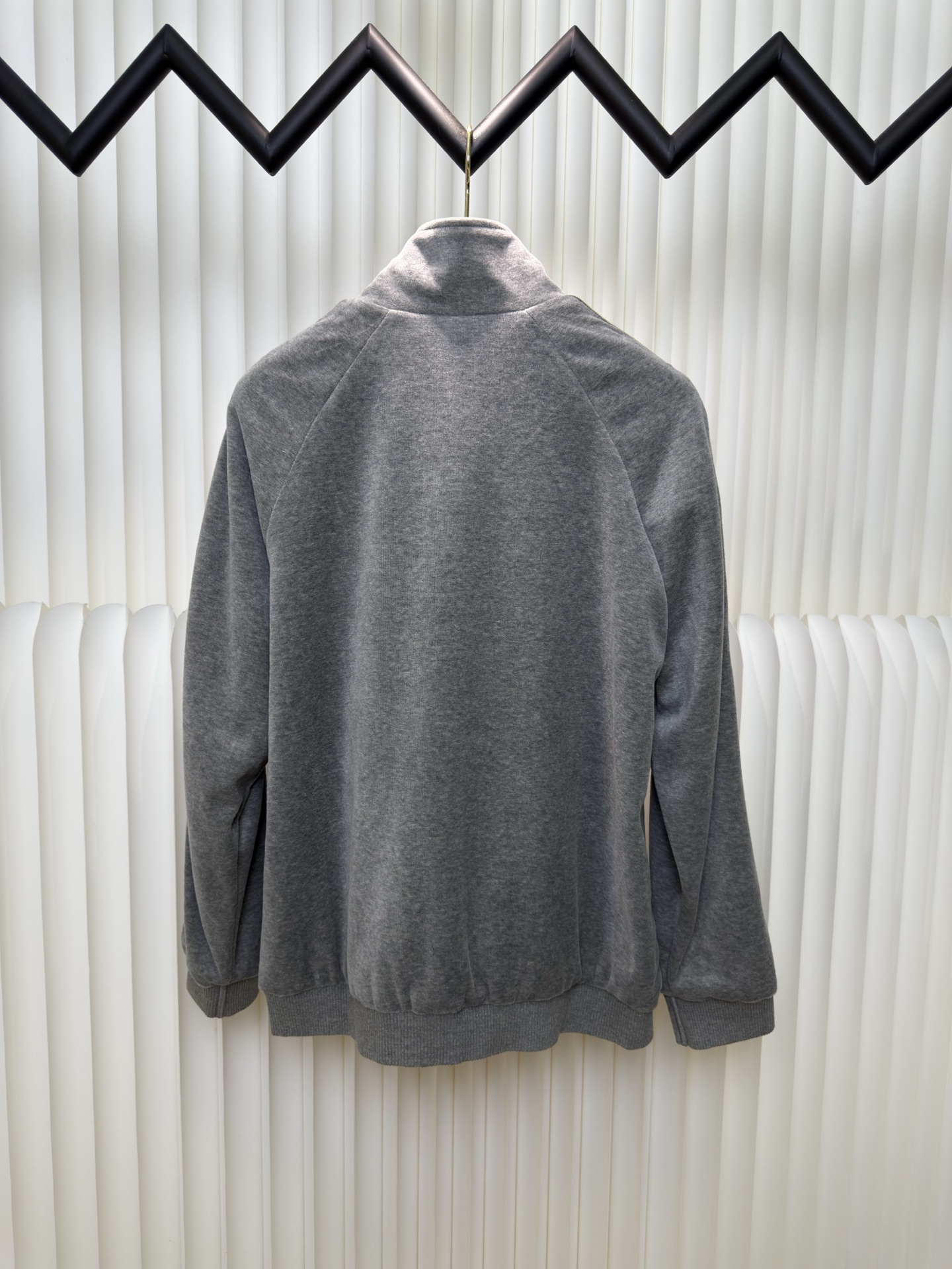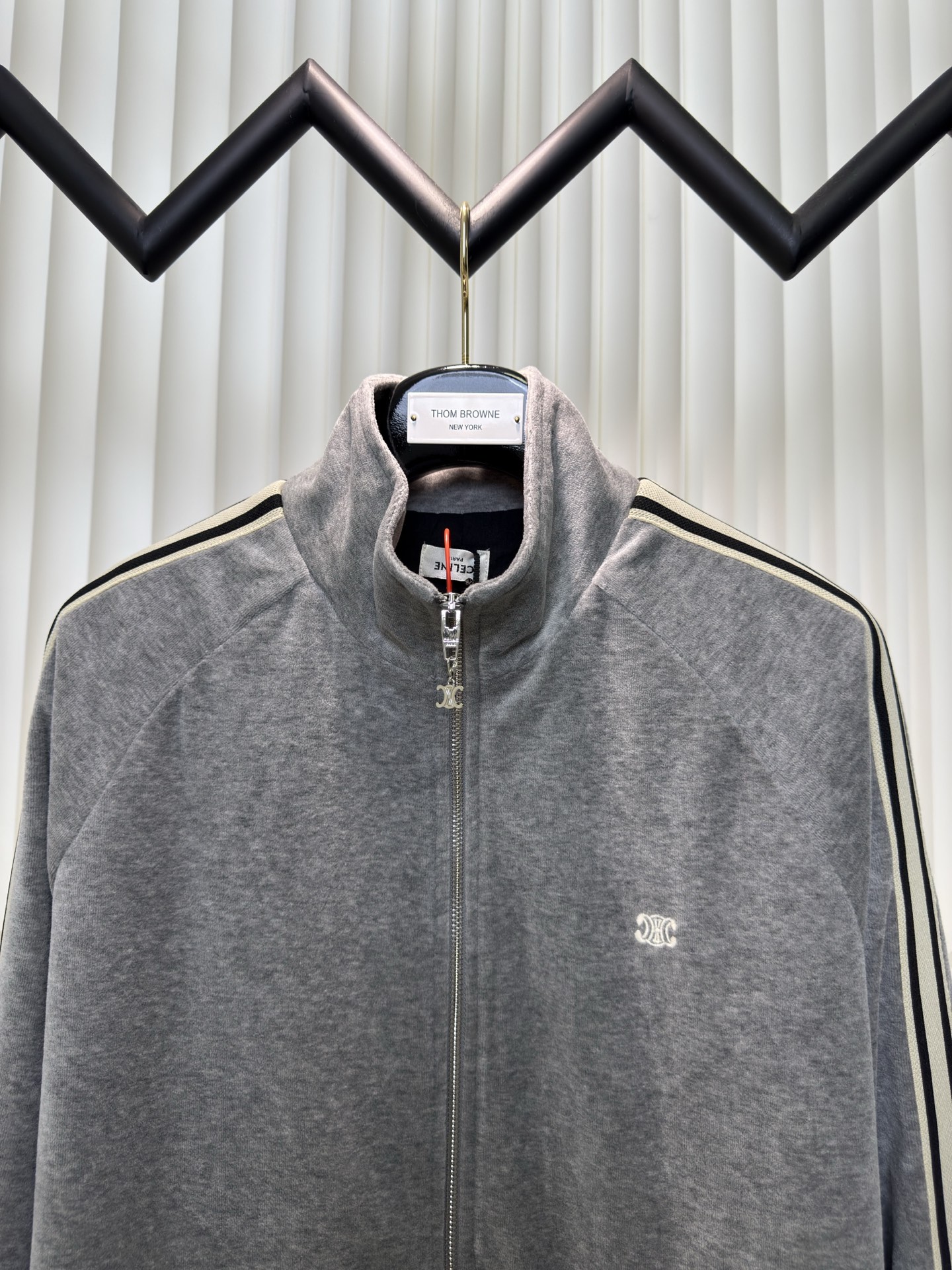 Custom cloud-soft twin-faced velvet cotton satin, delicate and smooth, skin-friendly like wrapped in clouds. Primarily in advanced gray, low-key yet connotative. The iconic Celine Triomphe embroidery awakens on the gray mist velvet, highly recognizable. Contrast trim streaks across the shoulders and arms like a meteor, metal zipper gleaming with a cold light—a visual impact between motion and stillness. The stand-up collar cuts a sharp line, balancing strength and softness. Worn separately, it's a style piece; worn together, it's an aura battle dress. A set for effortless styling.