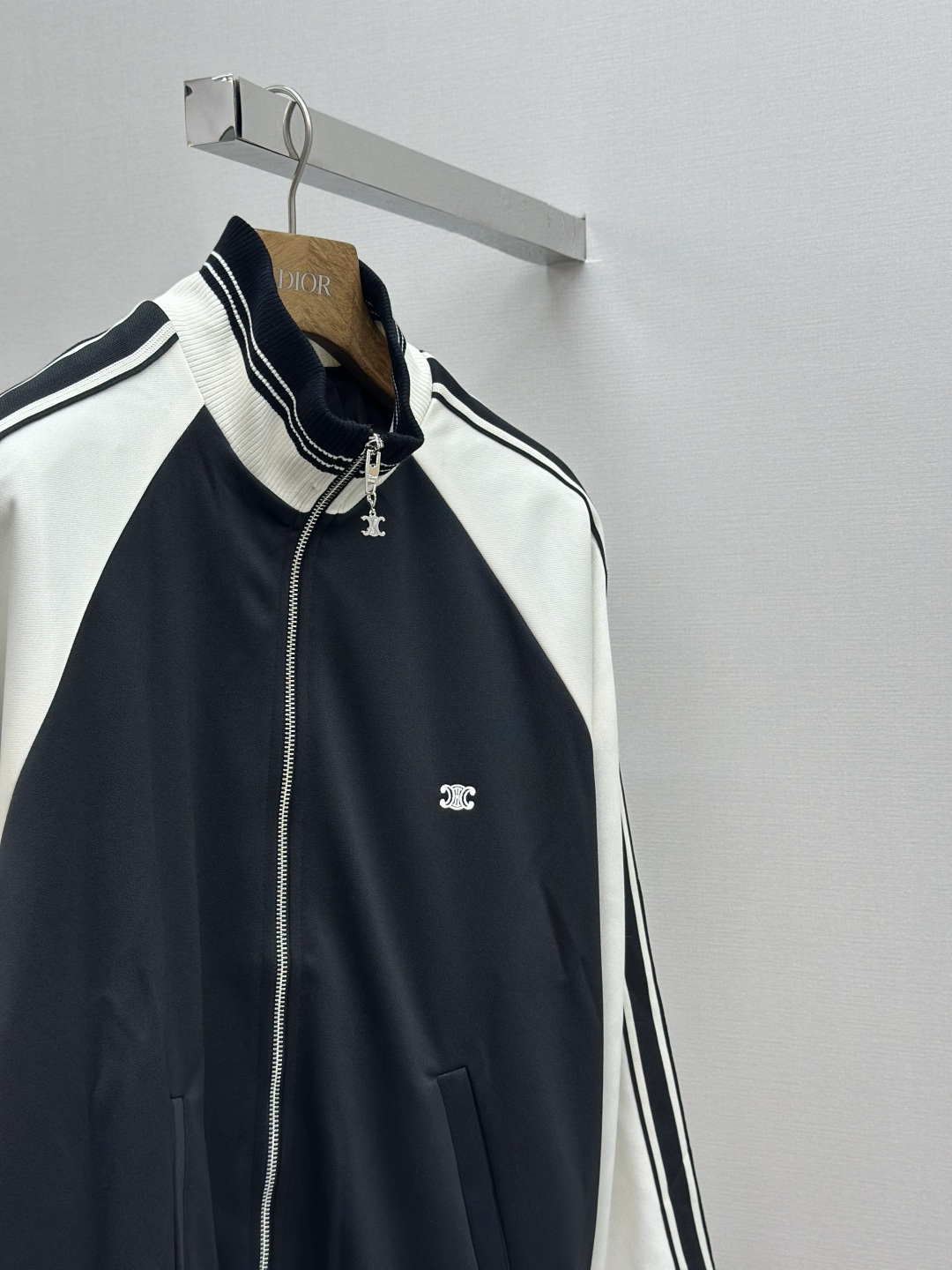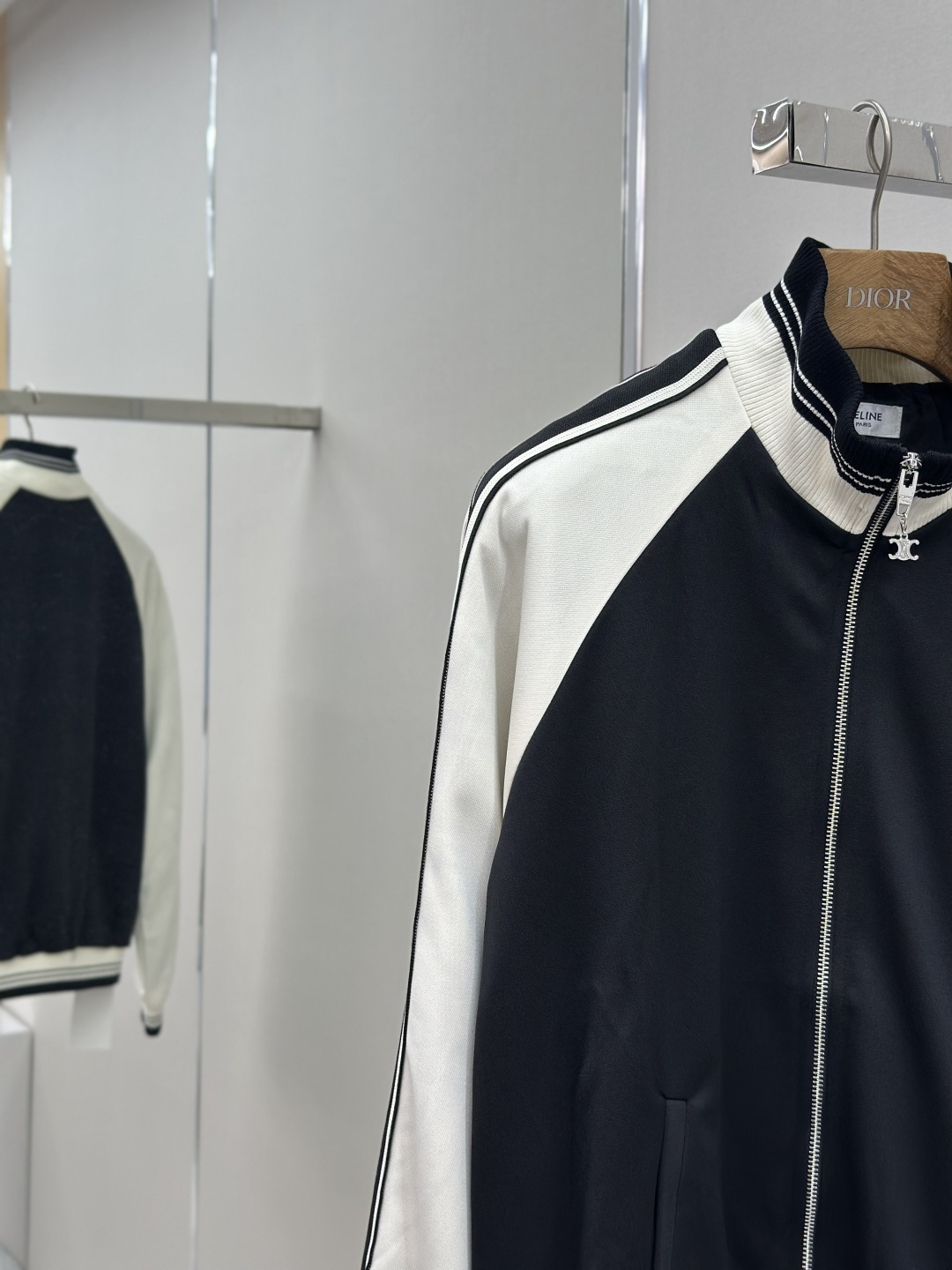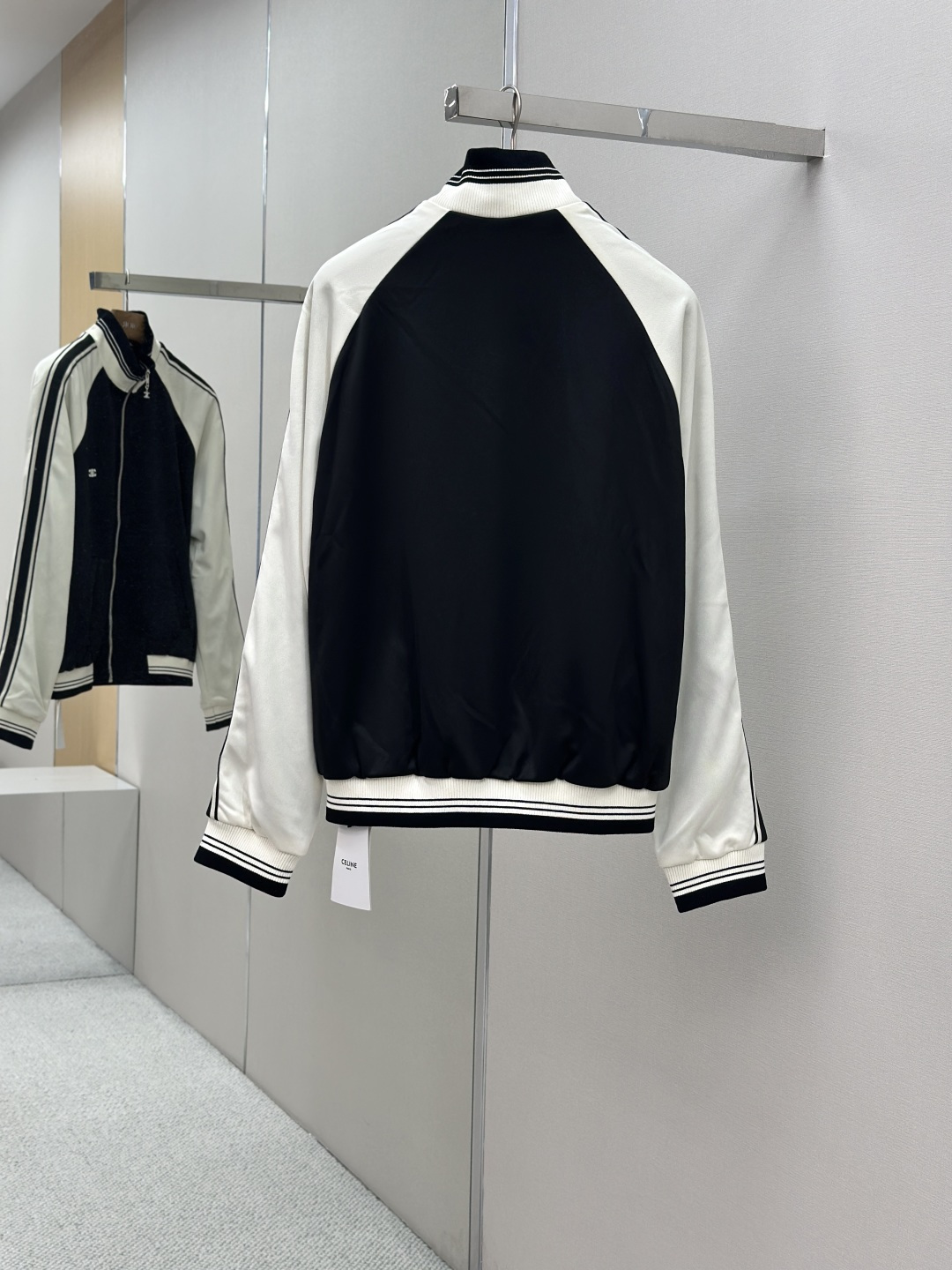 Celine Triumph Embroidered Jacket. Custom double-sided satin, smooth and skin-friendly. Signature embroidery, contrast trim. Black and beige. Slim fit. Sizes S/M/L/XL. Model 55044-B70.