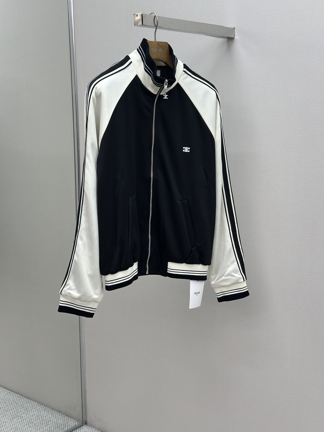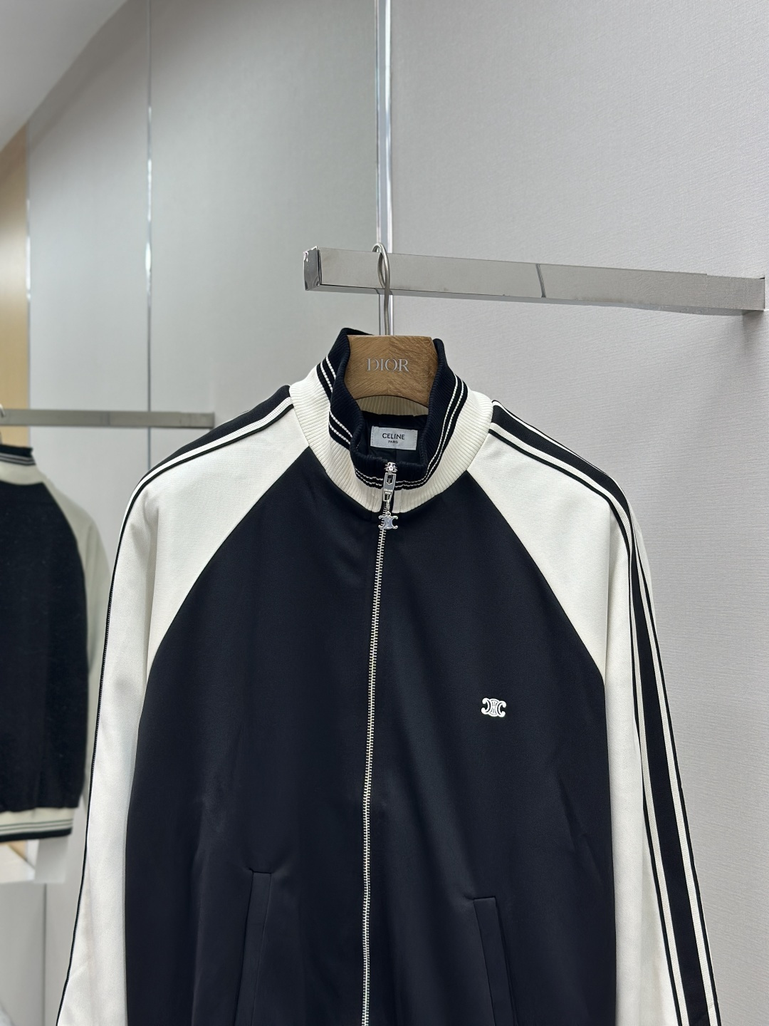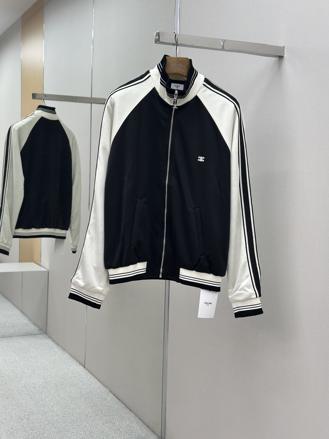 Celine Triumph Embroidered Jacket. Custom double-sided satin, smooth and skin-friendly. Signature embroidery, contrast trim. Black and beige. Slim fit. Sizes S/M/L/XL. Model 55044-B70.