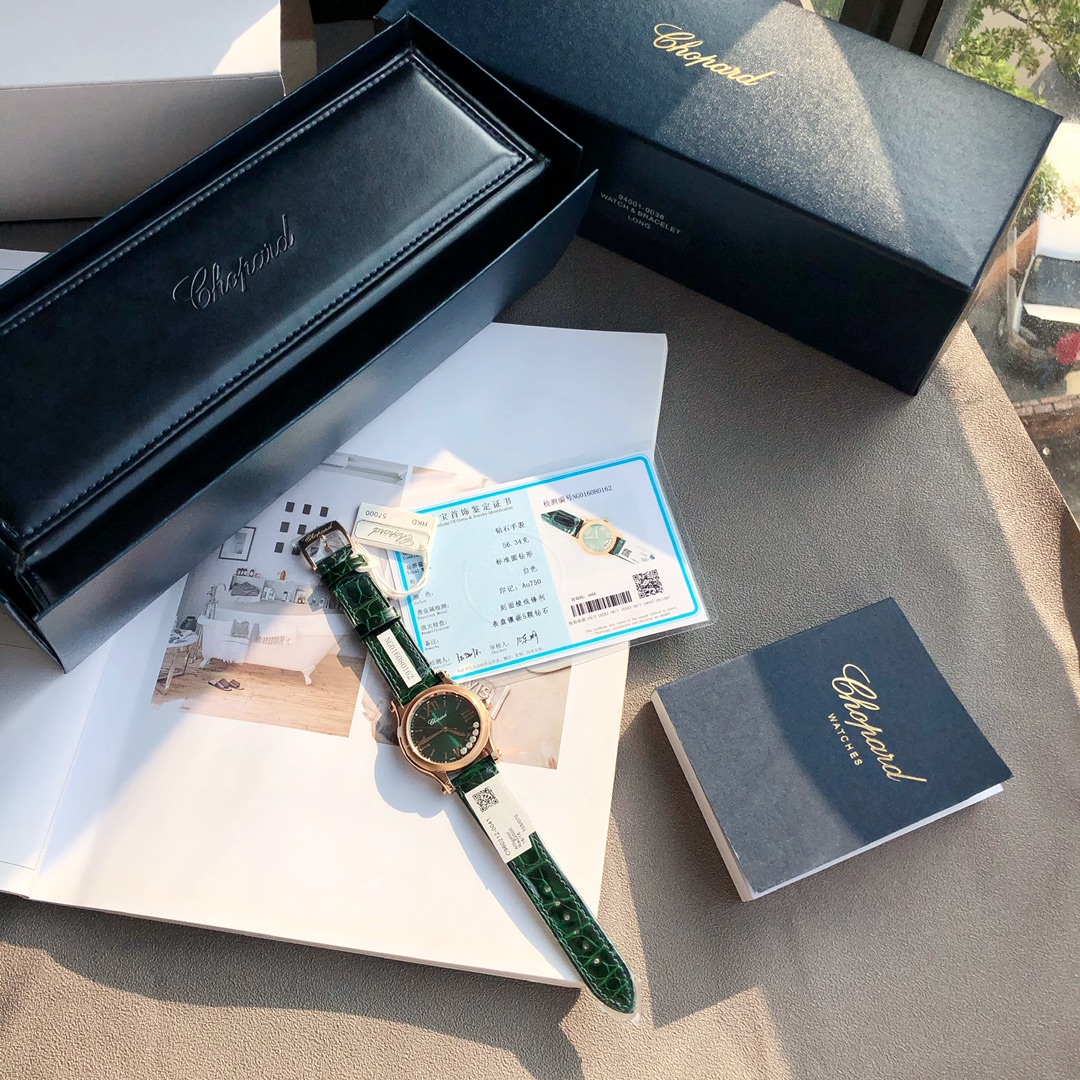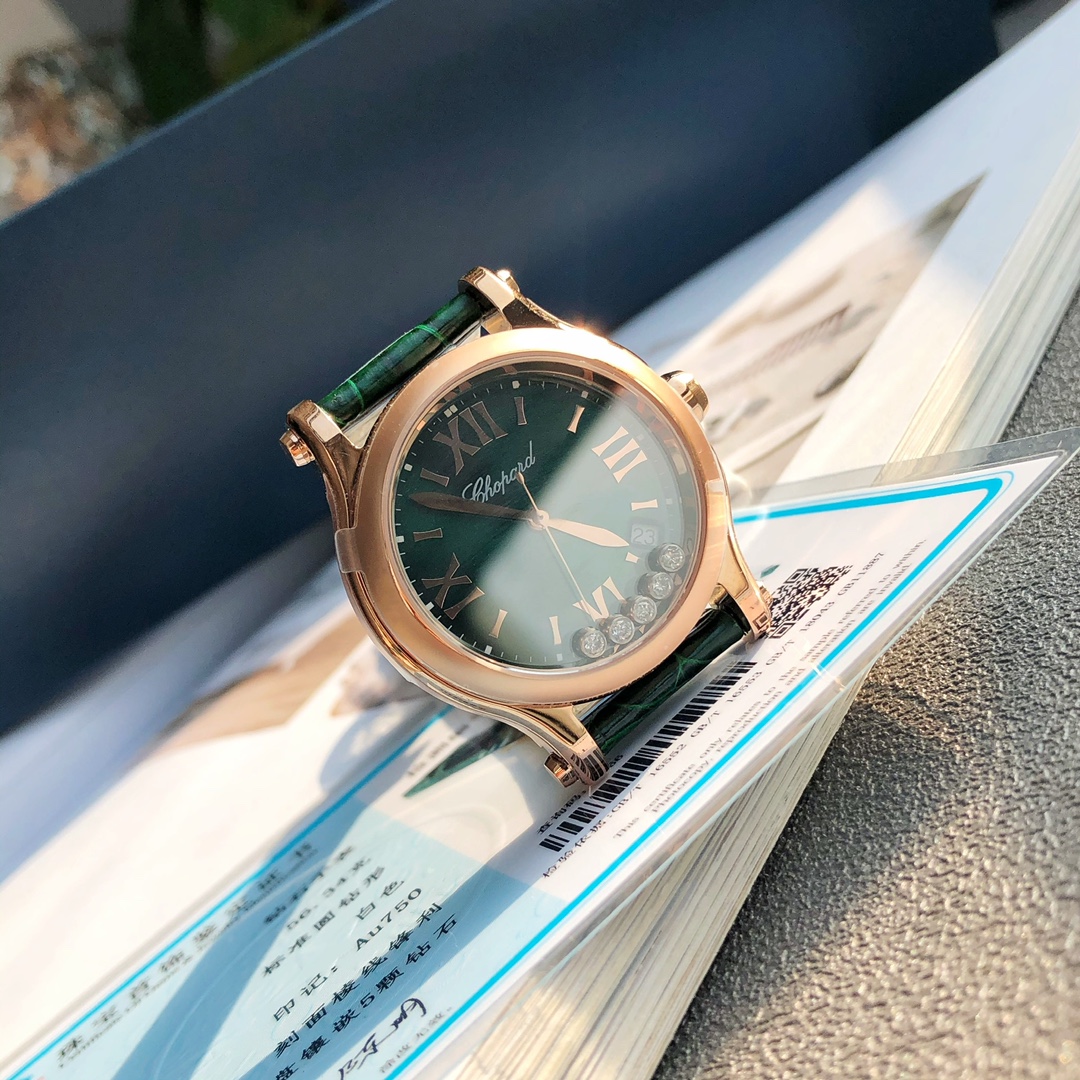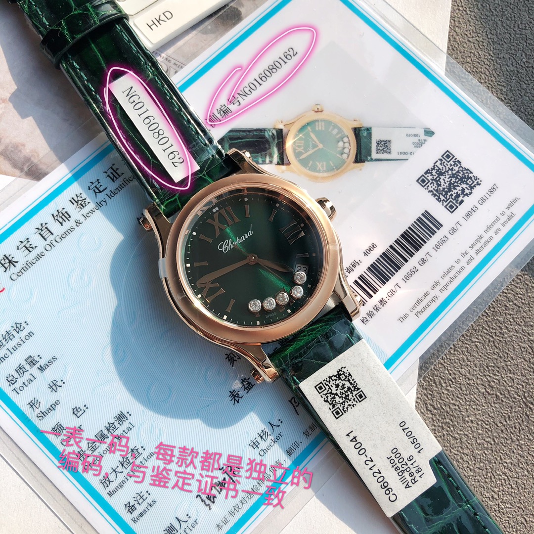 Genuine diamond inlay consistent with the boutique, three colors (black, red, green) available, Chopard Happy Diamonds, diamonds are forever, five diamonds make it complete, turn of luck, wealth rolling in. CHOPARD Happy Diamonds series HAPPYSPORT quartz watch, dial diameter 36mm, polished stainless steel case, double-layer sapphire crystal, American crocodile leather strap, featuring five genuine South African diamonds, diamond-inlaid beads slide freely, white dial with central whirl pattern, three-dimensional polished Roman hour markers, black second track, polished arched hands, comes with full boutique packaging. Free warranty for non-human damage.