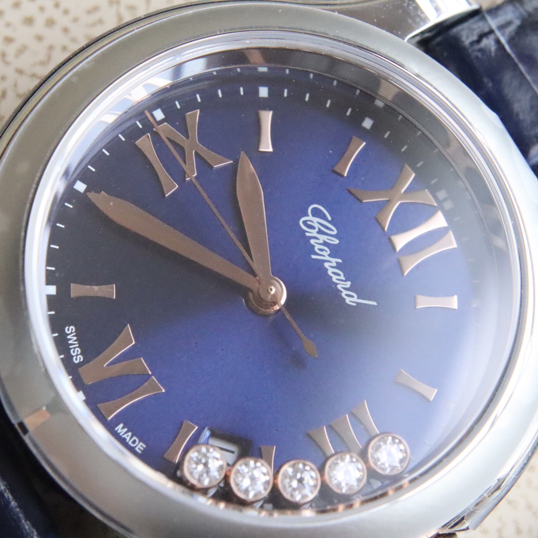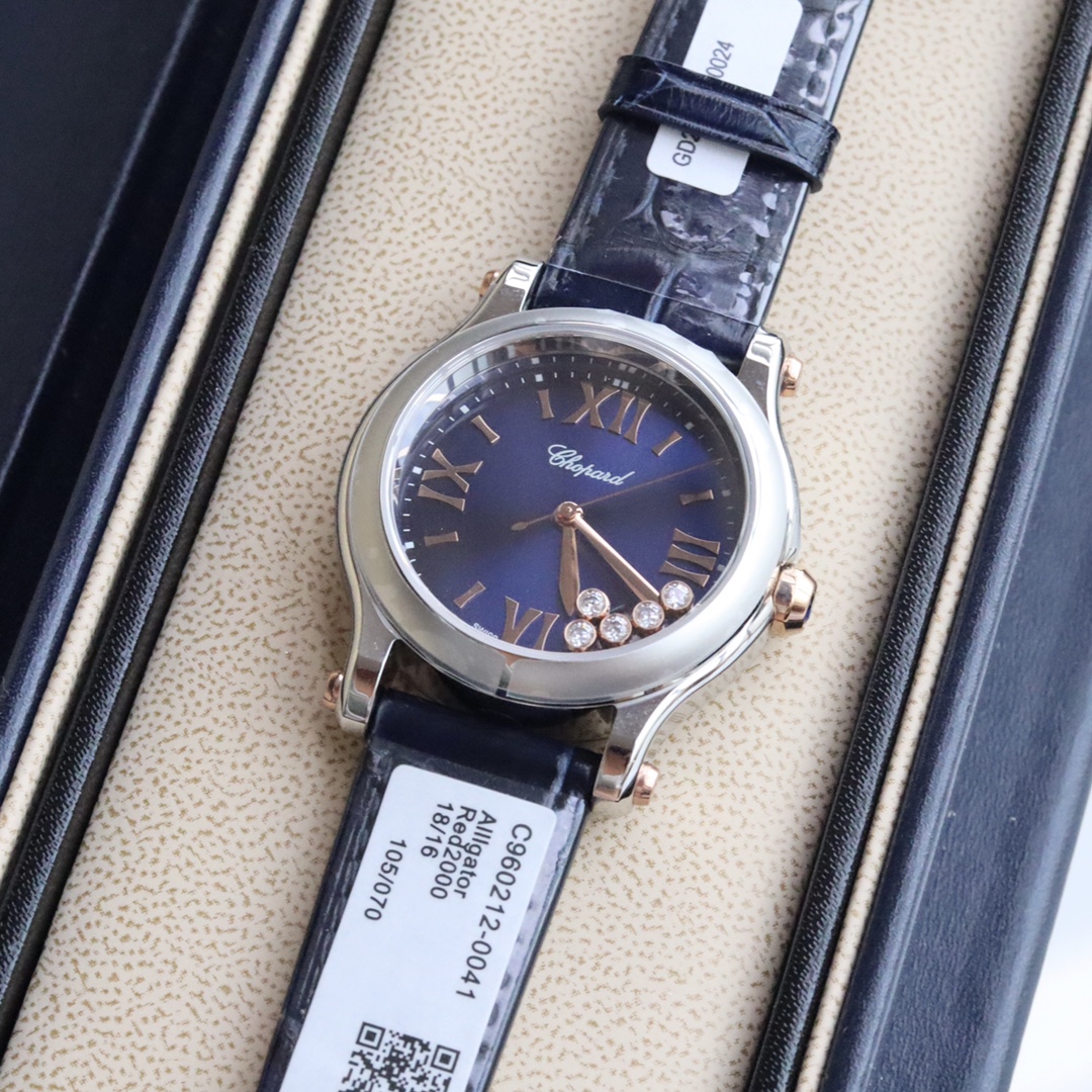 Chopard Happy Diamonds watch with freely moving diamonds, elegant 36mm steel case, genuine alligator strap, and Swiss Ronda 515 movement. A luxurious and fashionable timepiece for women.