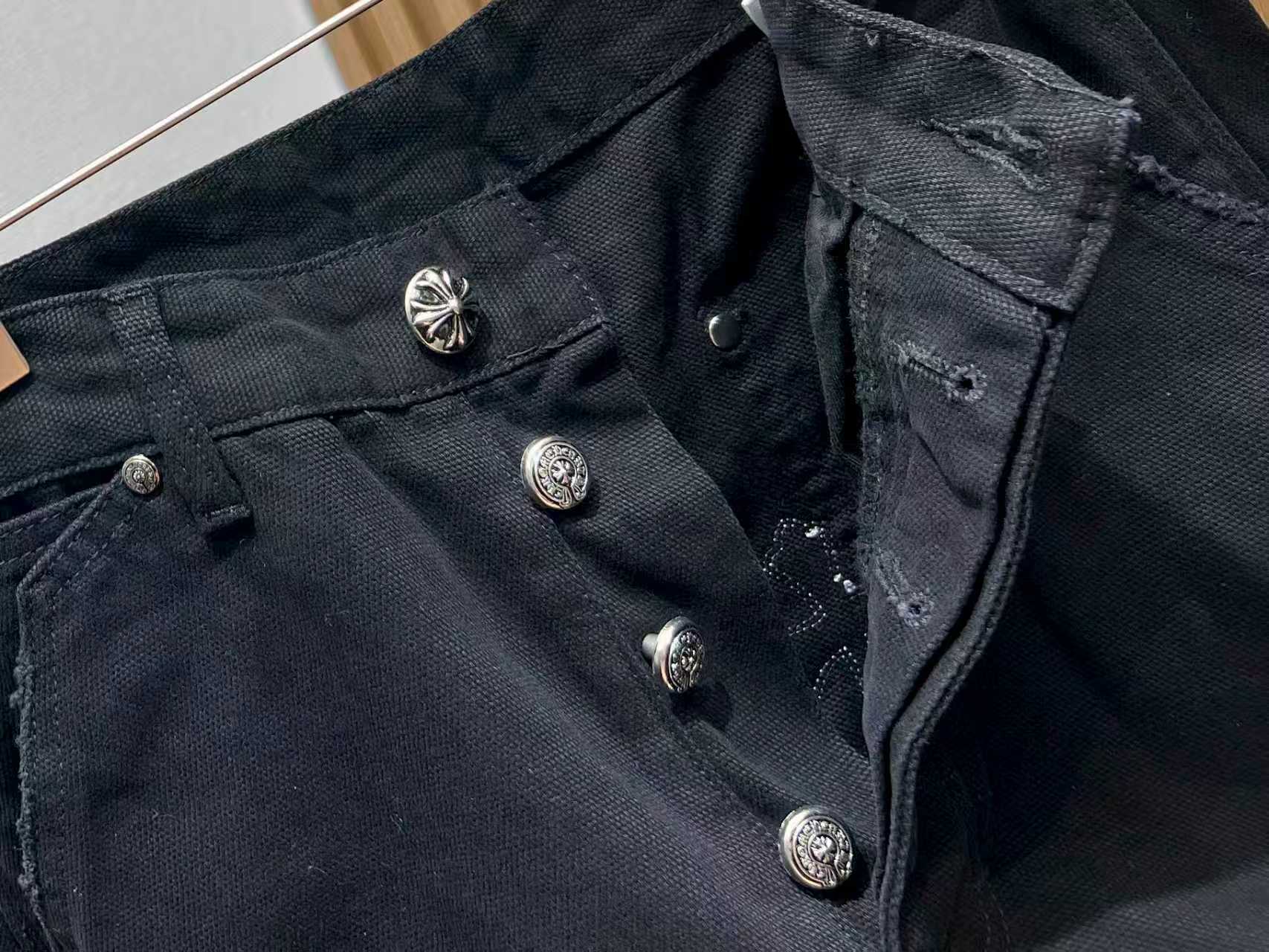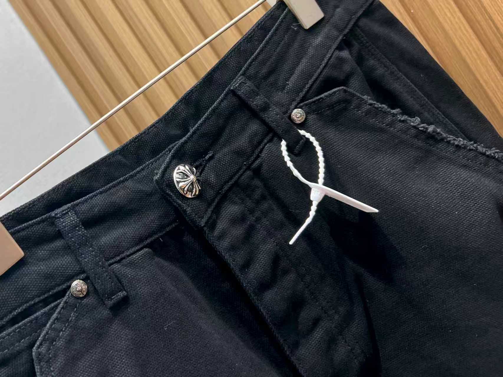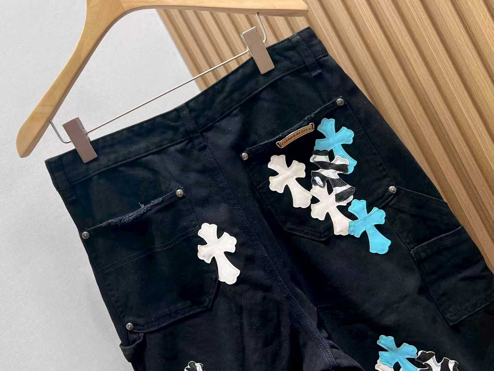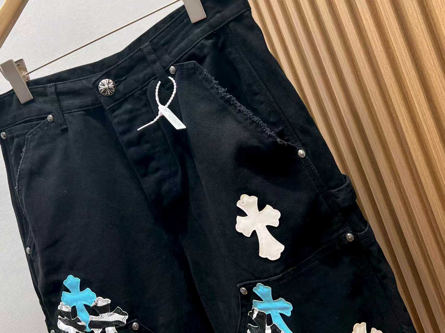 p290-35SS———Chrome Hearts denim shorts, interpreting a new trend in fashion and leisure with an unrestrained attitude. This unisex design cleverly blends classic denim elements with Chrome Hearts' iconic style, rugged yet refined, casual yet stylish. Made from high-quality denim fabric, it is comfortable, breathable, and maintains a structured silhouette, making it easy to wear whether strolling the streets or attending casual gatherings. The unique cut fits the body shape, accentuating leg lines while providing ample room for movement, ensuring freedom and comfort. Metal decorations and distressed craftsmanship complement each other, highlighting a personalized attitude in the details. Whether paired with a simple T-shirt or a trendy jacket, it instantly elevates the overall look, helping you stand out in the crowd and become a fashion focal point.