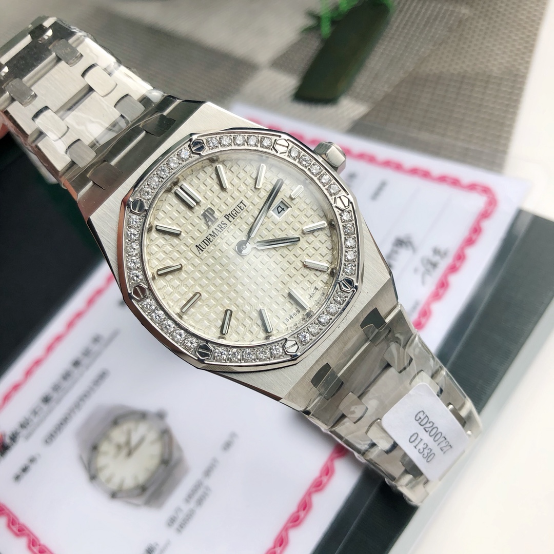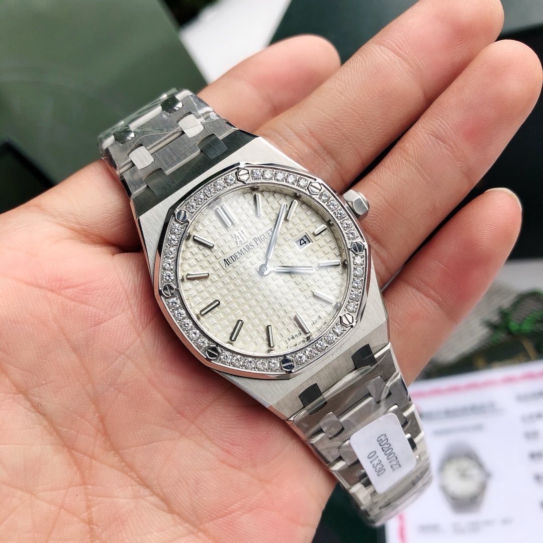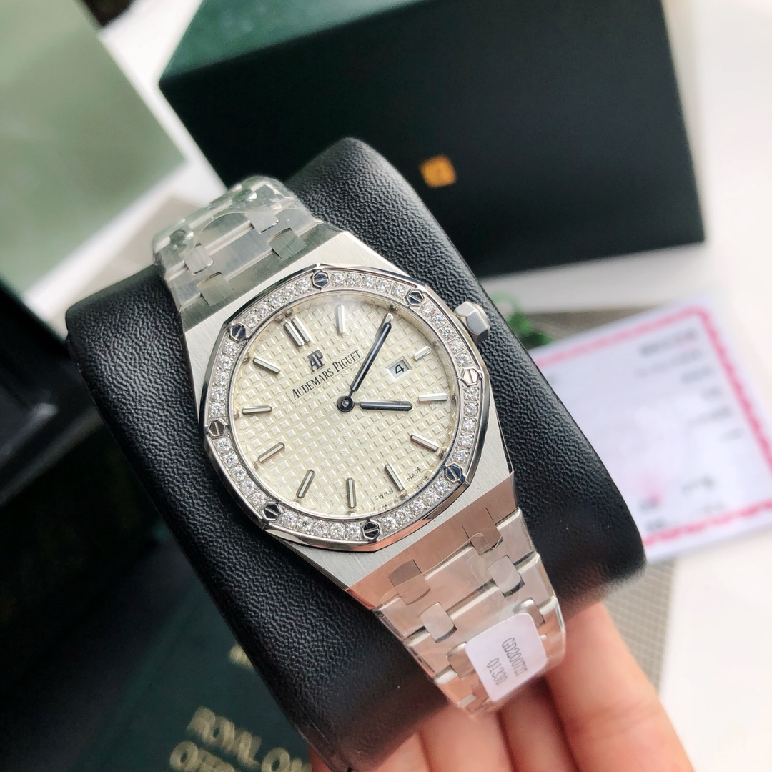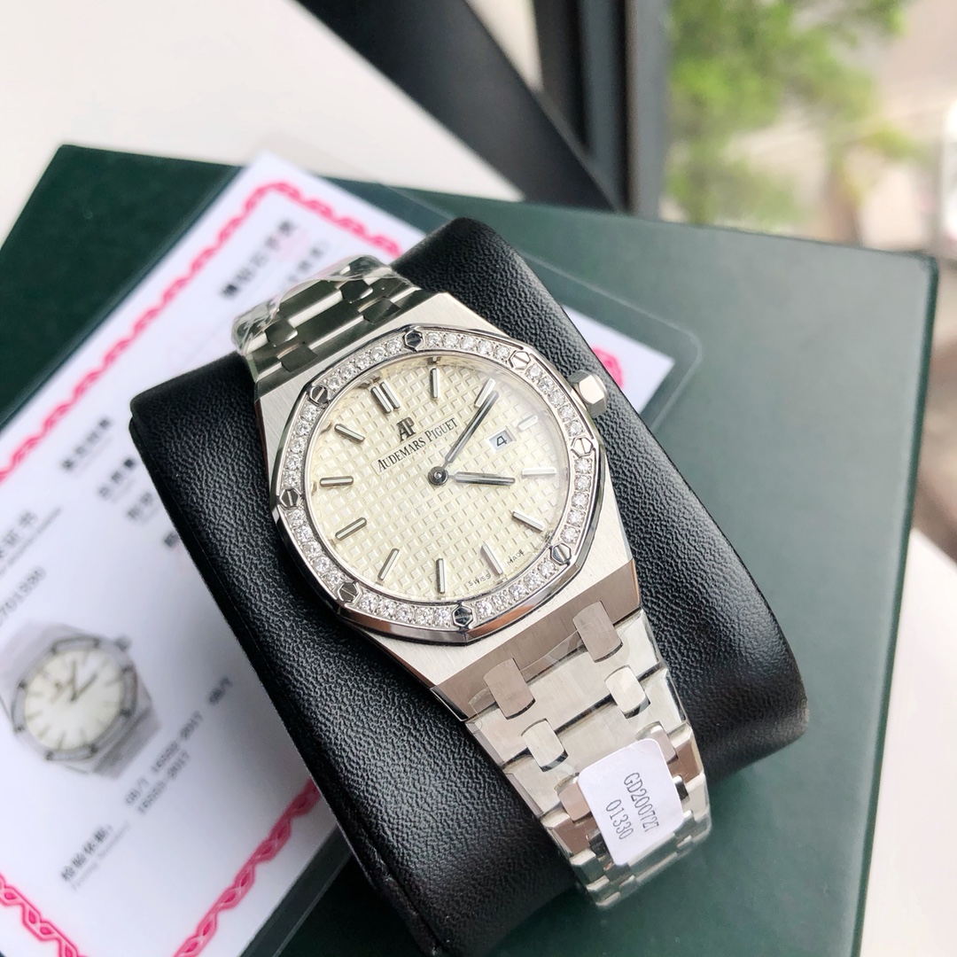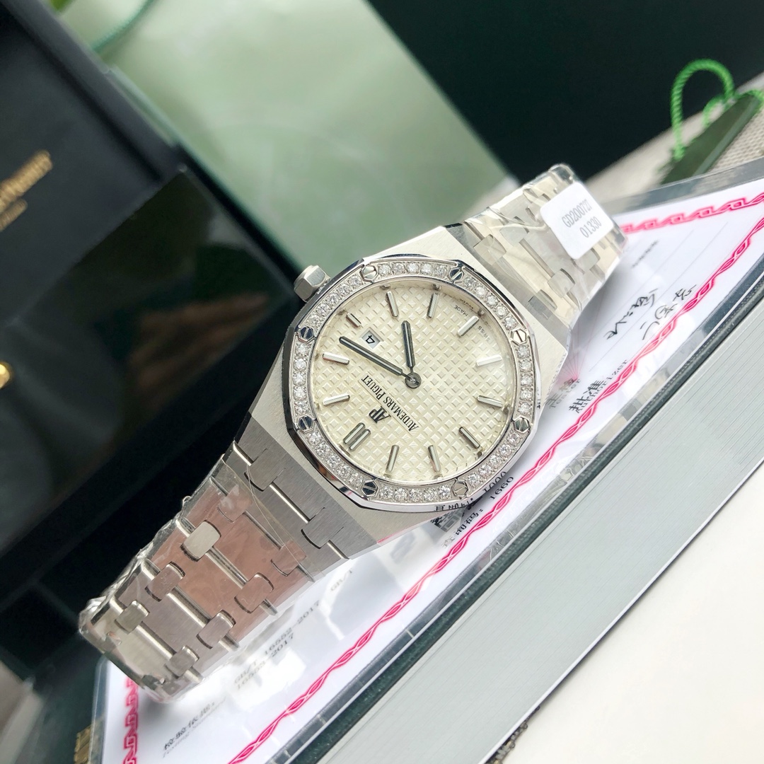 Complete set packaging Audemars Piguet, the AP women's model that is hard to buy at the counter has arrived! Today, we are introducing the ladies' watch from the Audemars Piguet Royal Oak collection. Its official model number is 67651ST.ZZ.1261ST.01. The unique octagonal appearance of the Audemars Piguet Royal Oak series, along with Audemars Piguet's distinctive design style, also incorporates an elegant feminine touch, making it deeply loved by women. Even with a small size of only 33 millimeters, it vividly showcases Audemars Piguet's unique pure beauty and strong lines. The bezel set with diamonds adds more softness and elegance to the women wearing it. (40 brilliant-cut diamonds with a total weight of approximately 0.71 carats) Equipped with a Swiss quartz movement and featuring a practical calendar display function, it does not feel heavy when worn by women. Sold with a full set of counter packaging. This type of product is generally not available in large quantities. Limited quantity available.