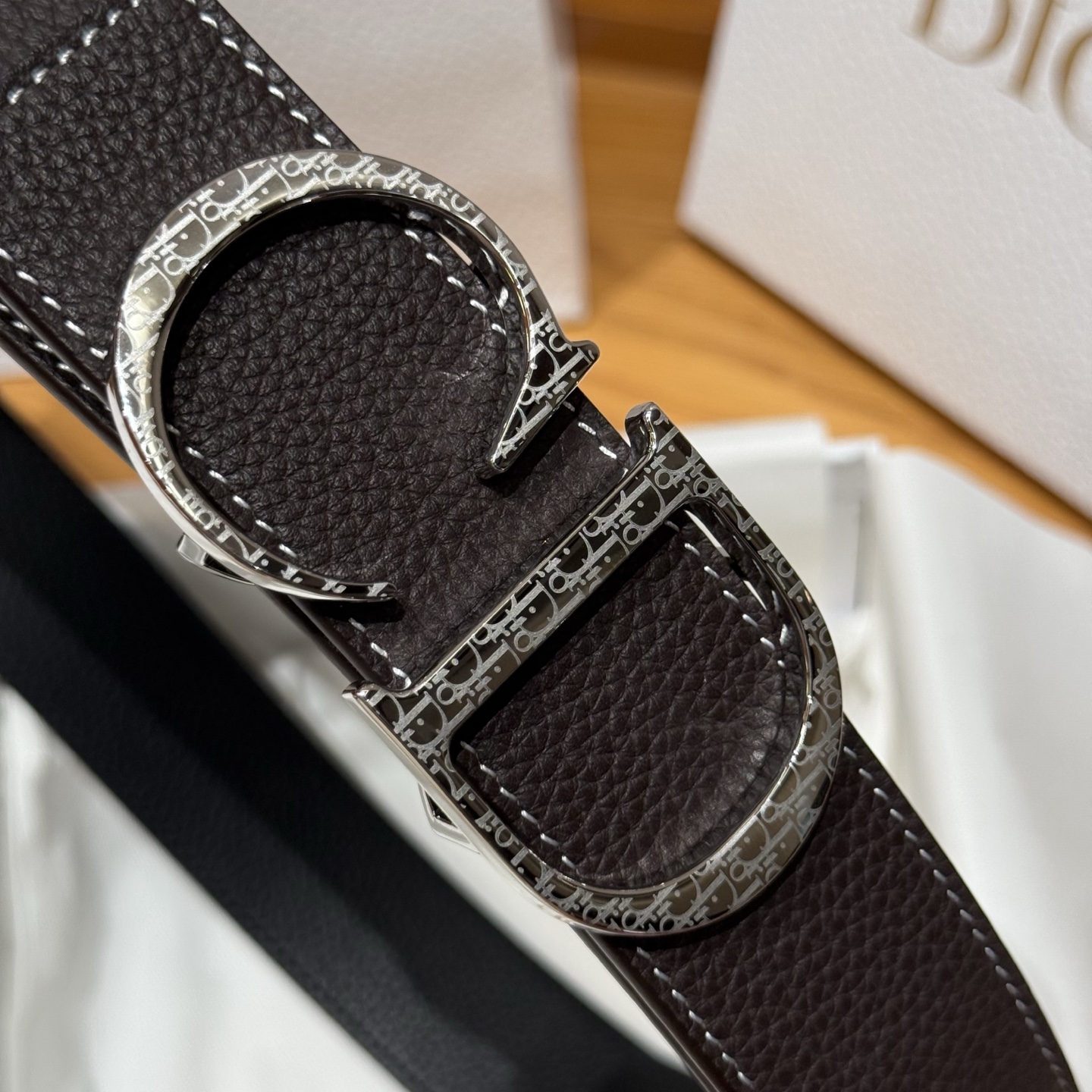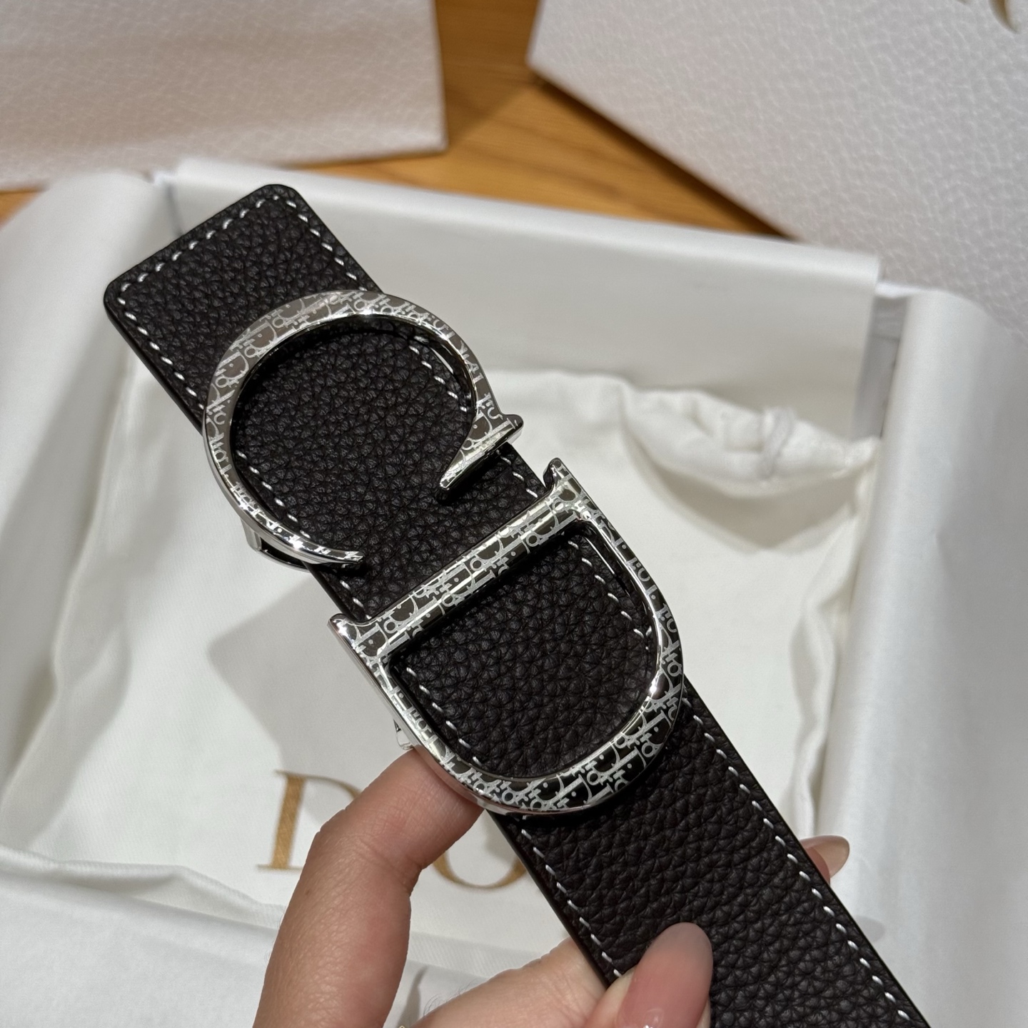 This metal-coated brass belt buckle is adorned with the "CD" logo, engraved with the brand pattern, and features grained calfskin on both sides. Classic elements present a fresh style for the season. The exquisite design allows it to be freely paired with various 3.5cm belt buckles, enhancing elegance and creating a sophisticated look. Versatile and fashionable.