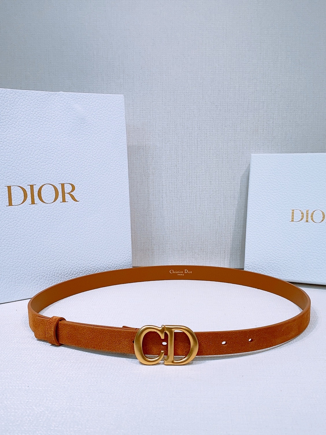 This model with an aged gold metal CD buckle is revisited in a light gold suede calfskin version, presenting a casual and modern look.