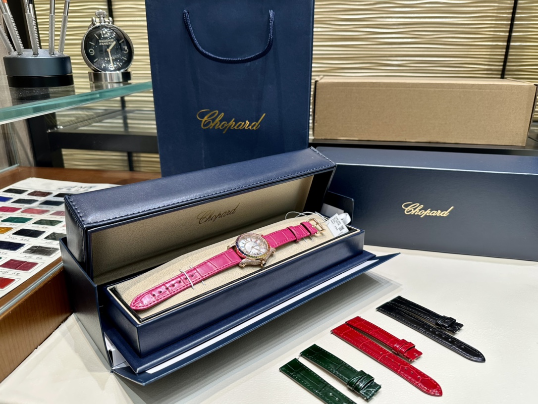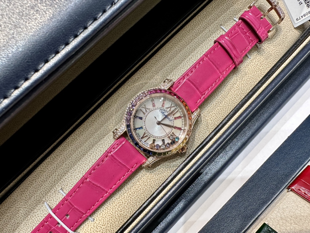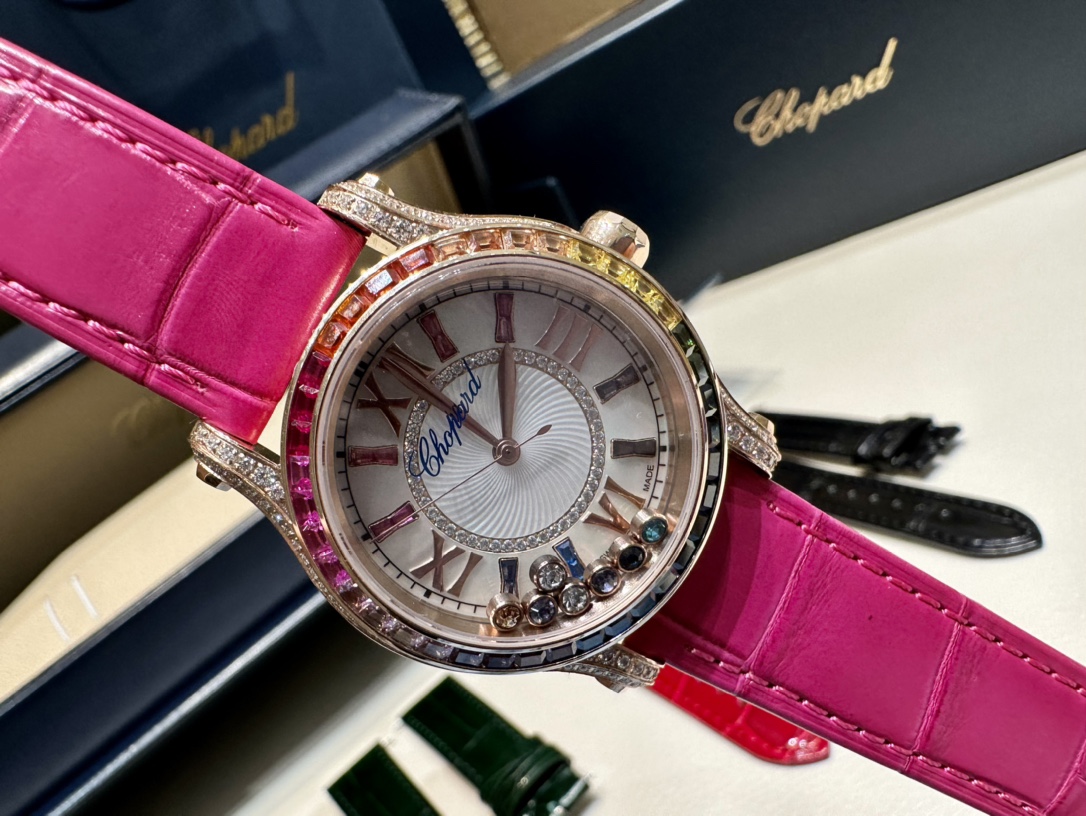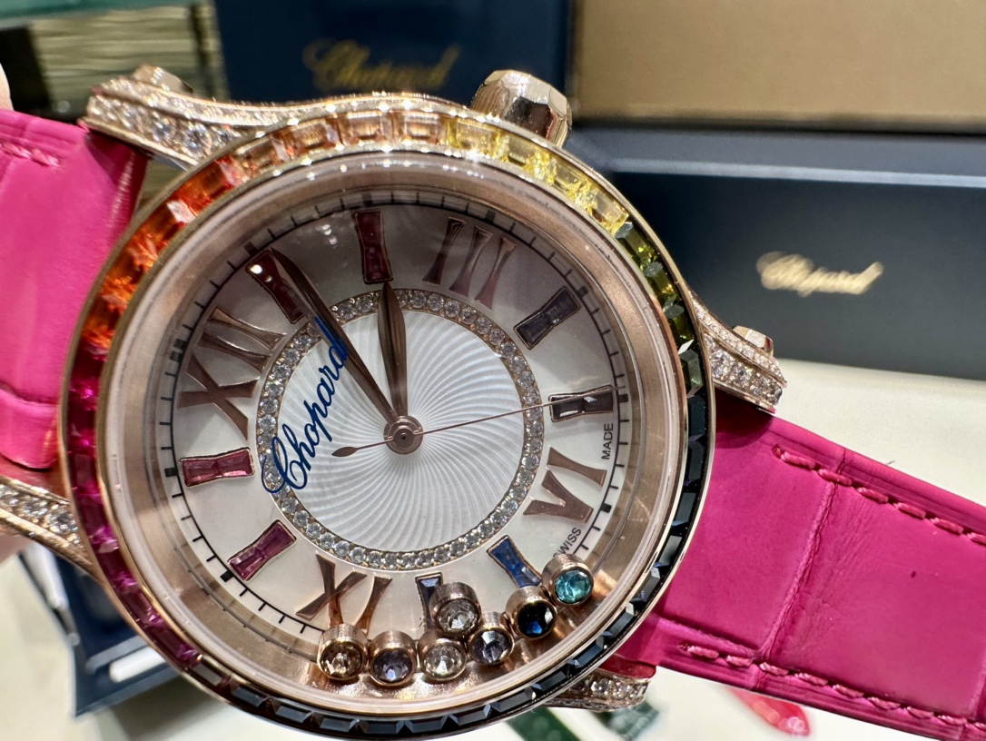 DKF new Chopard Happy Rainbow watch with Swiss movement, mother-of-pearl dial, Swarovski crystals, alligator strap, and original clasp. DK factory production.