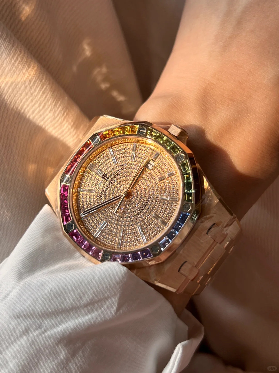 Drill ring, 1950. AMG unlocked! Rainbow circle Audemars Piguet Royal Oak hidden model. 32 gradient gemstones, diamond dial, luxurious and exquisite.