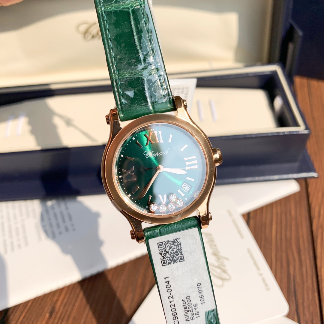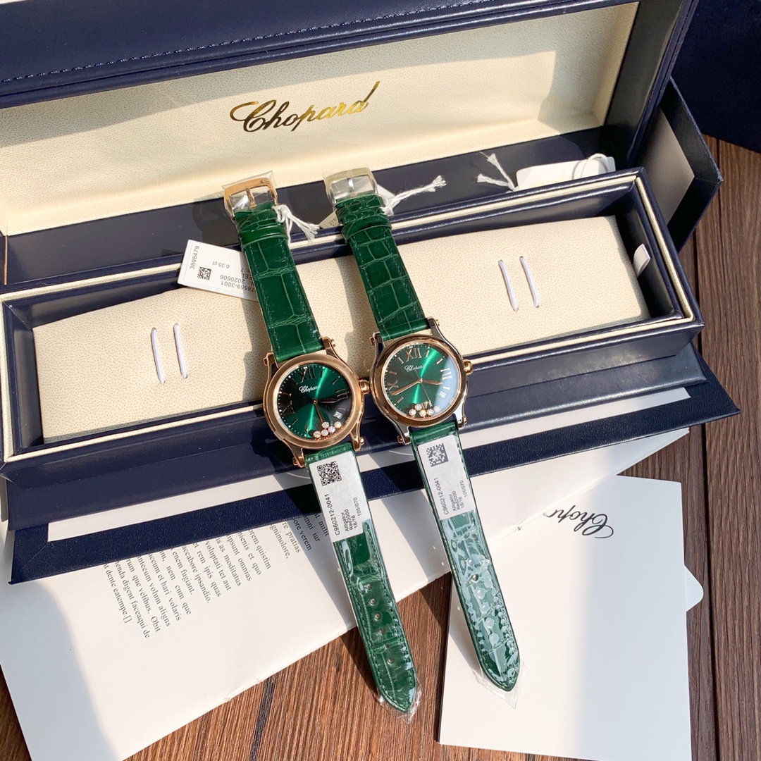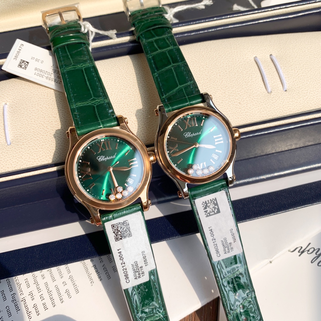 Mechanical style, exclusive launch! This year's most popular Chopard green, Chopard limited edition emerald. It's often said that men wear IWC and women wear Chopard. Having gold (advance) and diamonds (earn) carries a very good meaning. The diamond beads inside the dial can slide and rotate freely, with options of 5 diamonds or 7 diamonds, symbolizing a turn of luck and rolling in wealth. Green American alligator leather, this green is simply too beautiful. The dial comes in a small size of 30mm and a large size of 36mm. One style is half steel and half gold, another is full gold, with a sapphire double-layer glass crystal, and comes with original boutique packaging. Free warranty for non-human damage. Limited edition. Small quantity arrived.