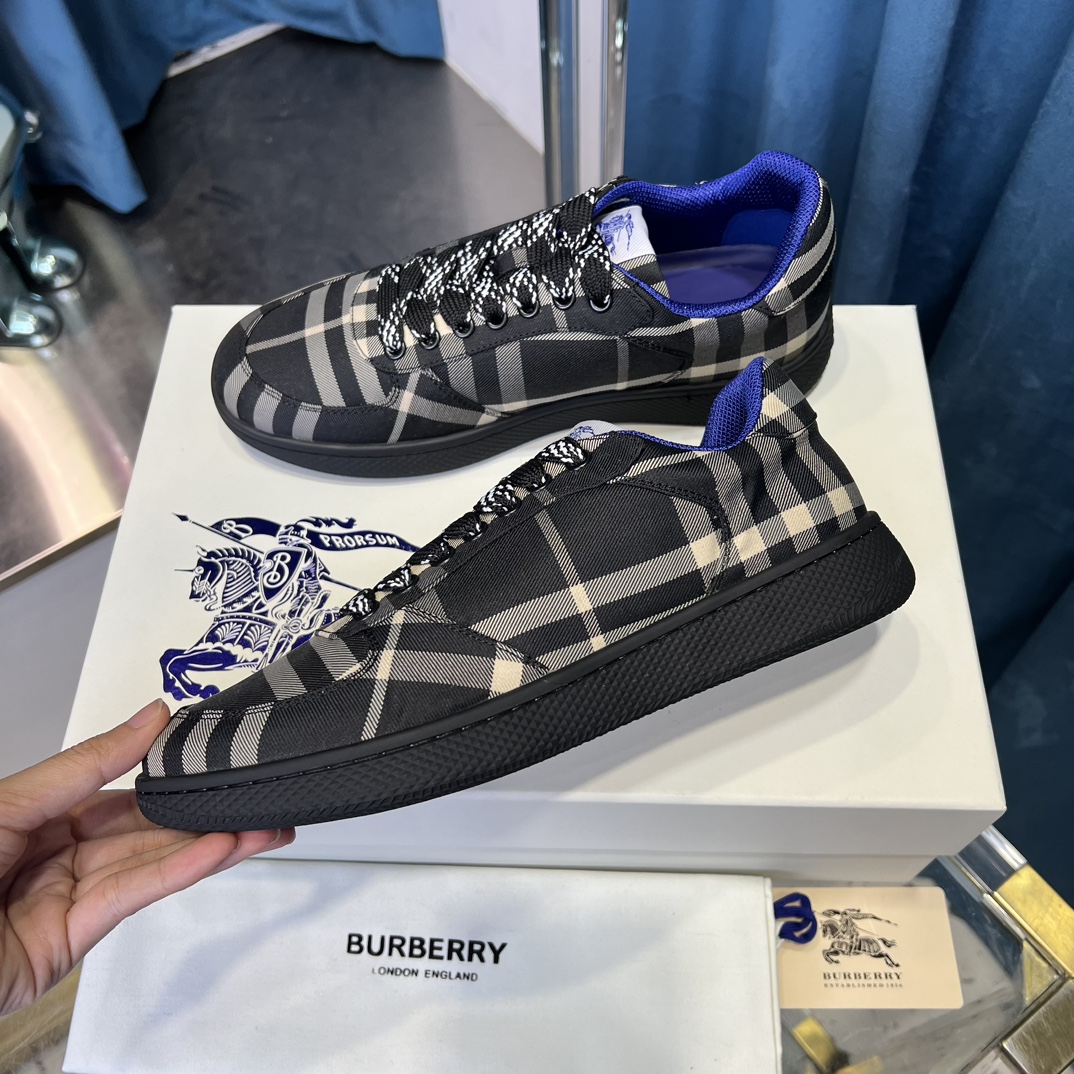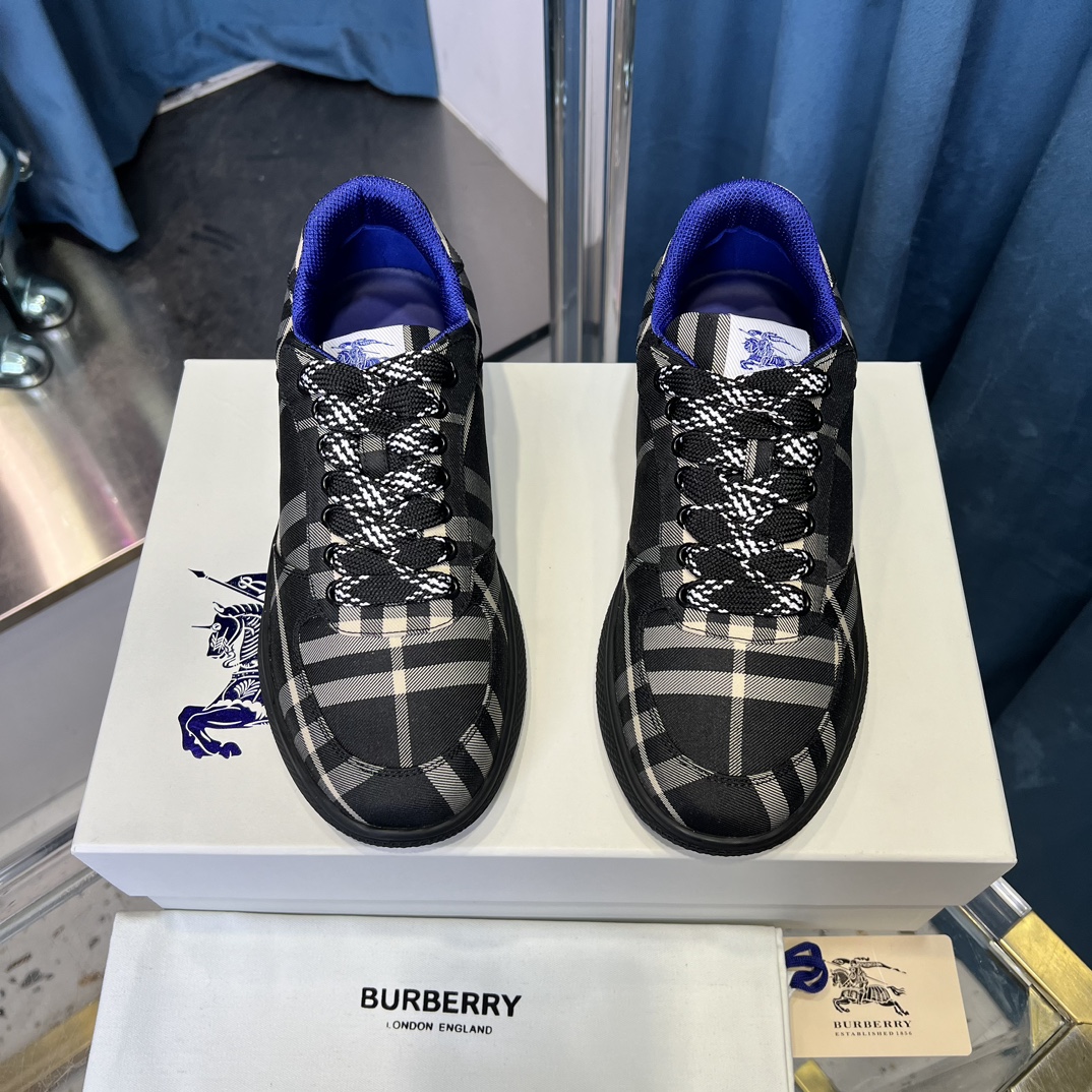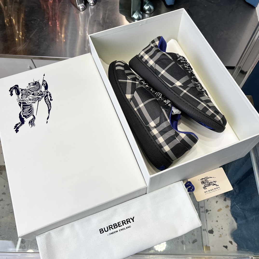 Guan-produced top version BURBERRY shoes. Upper: Imported napa leather, brand patterned fabric, tongue label. Lining: Canvas, water-stained leather insole. Sole: Lightweight TPR rubber, dual-color molded. High quality, fine craftsmanship. Sizes 38-44 (45 men, custom orders).