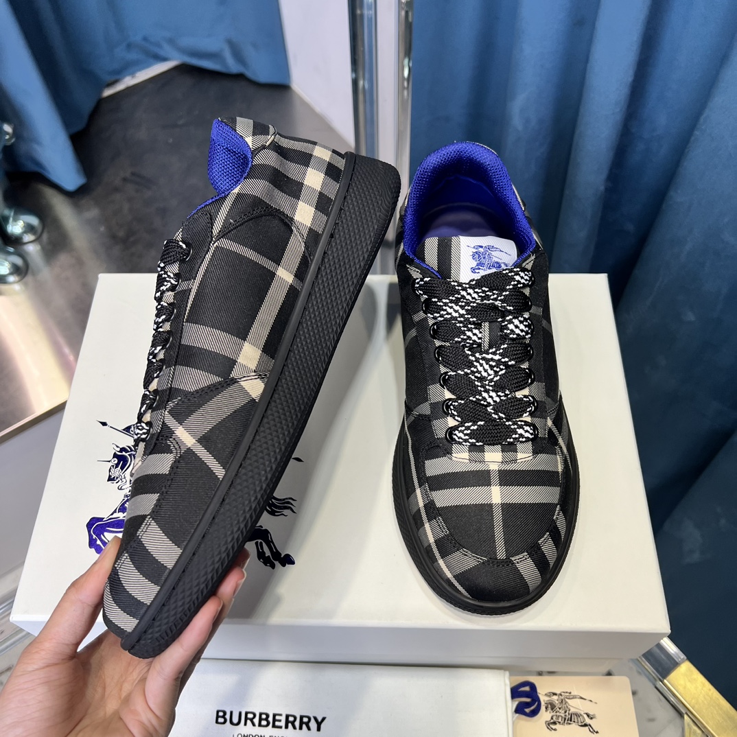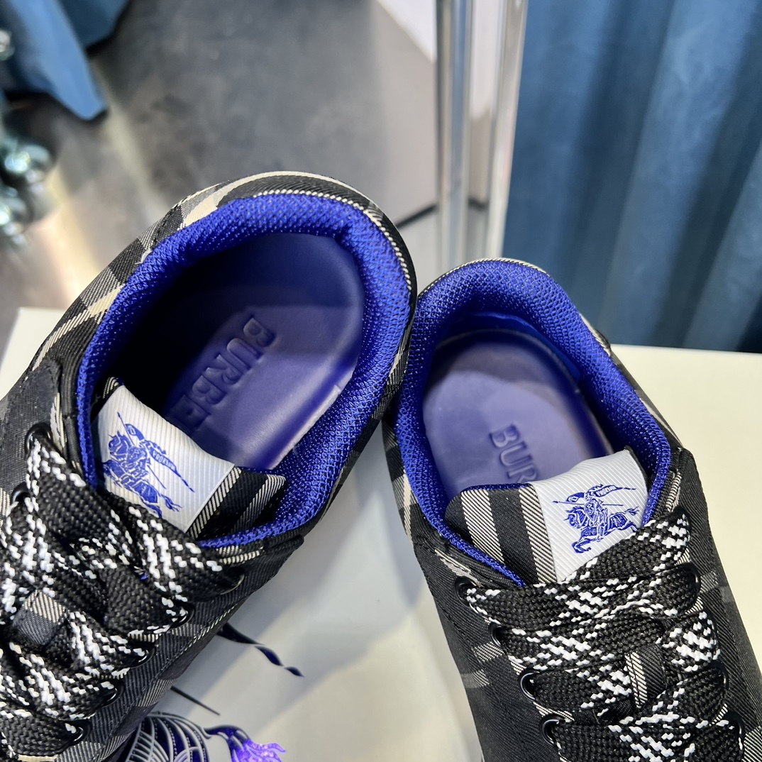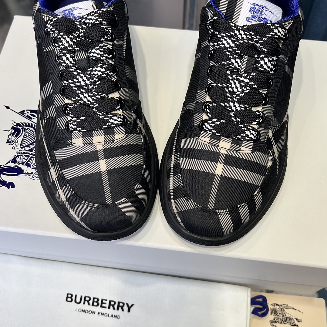 Guan-produced top version BURBERRY shoes. Upper: Imported napa leather, brand patterned fabric, tongue label. Lining: Canvas, water-stained leather insole. Sole: Lightweight TPR rubber, dual-color molded. High quality, fine craftsmanship. Sizes 38-44 (45 men, custom orders).