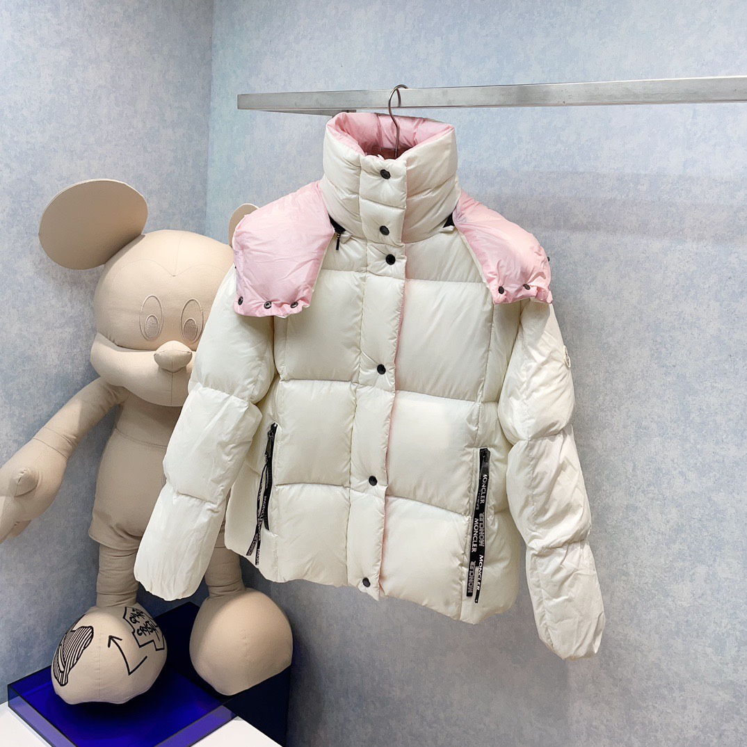 Guangzhou high-quality Moncler Chambon women's short down jacket. New pink-white color. Filled with white goose down, puffy and warm. Waterproof, windproof. Fashionable A-line silhouette, versatile for different heights. Sizes: 0-3. Colors: white-pink.
