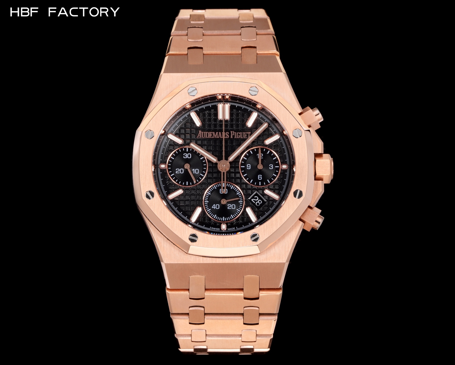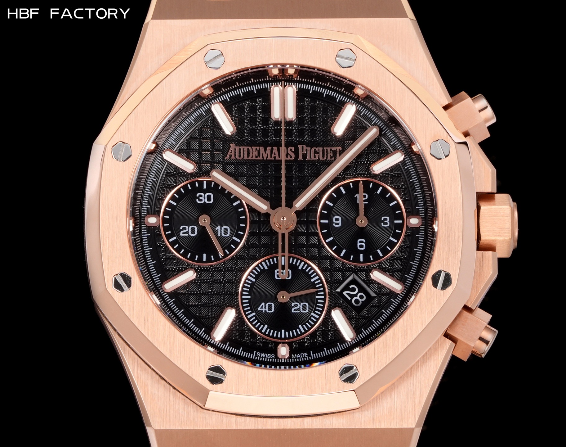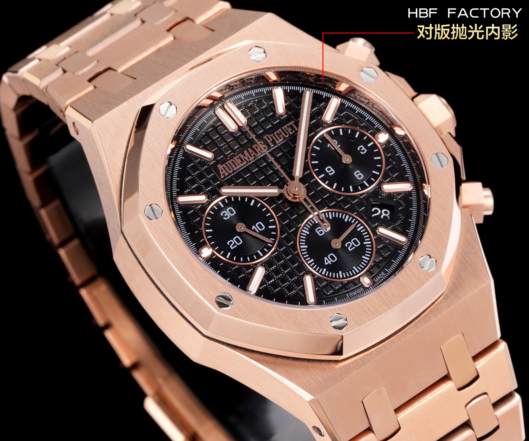 HBF Factory Audemars Piguet Royal Oak 26240ST anniversary edition. Upgraded V2 with polished inner ring, 41mm case, 316L steel. Superlume, 7750 chronograph movement. Highest quality replica.