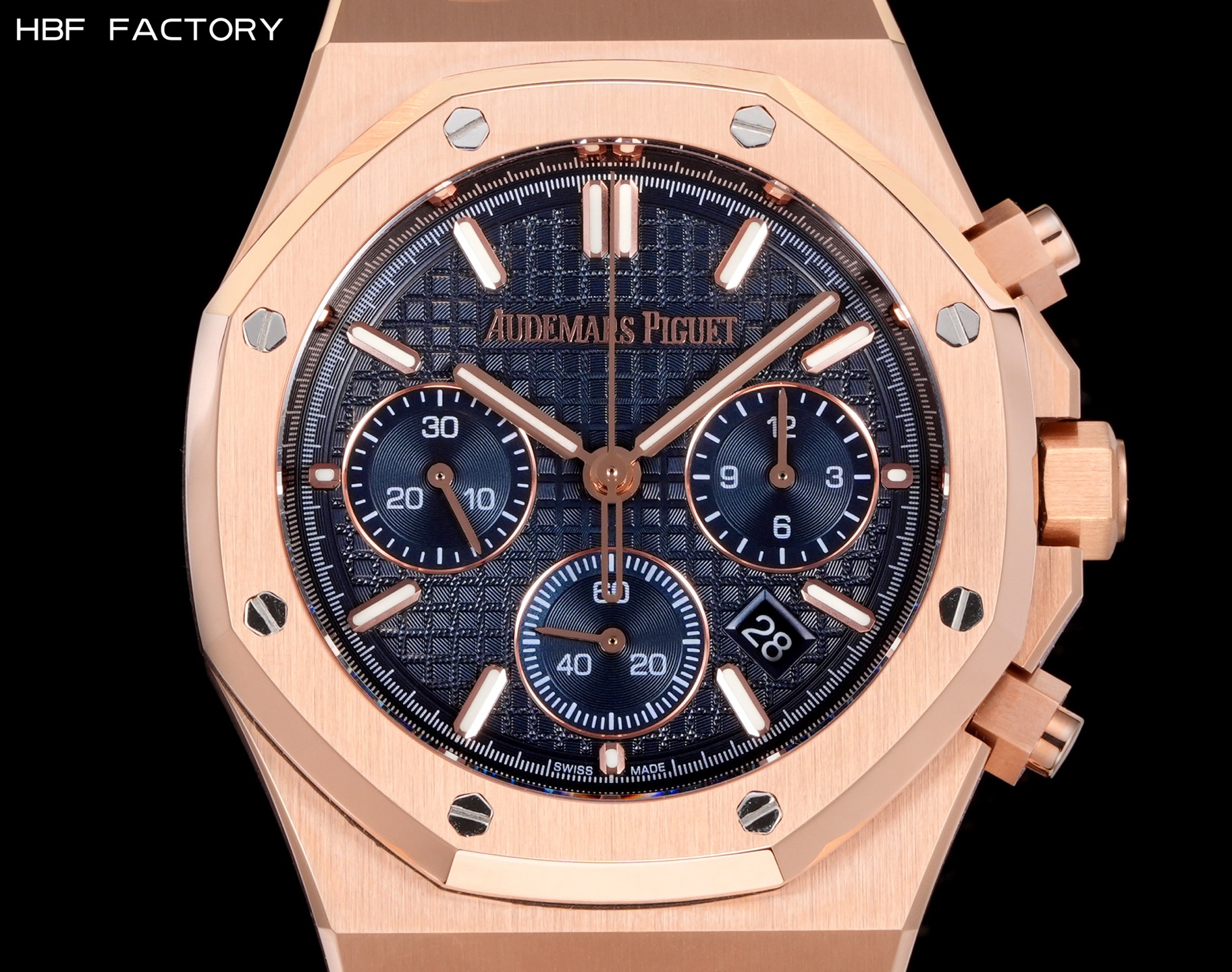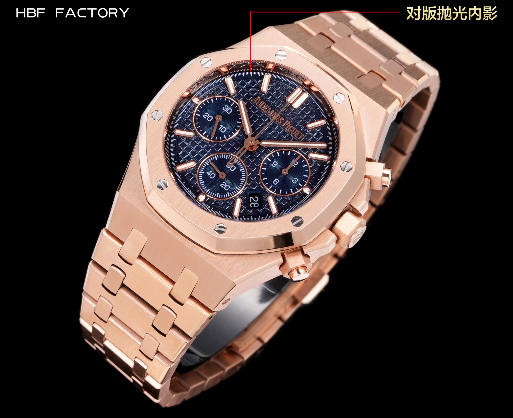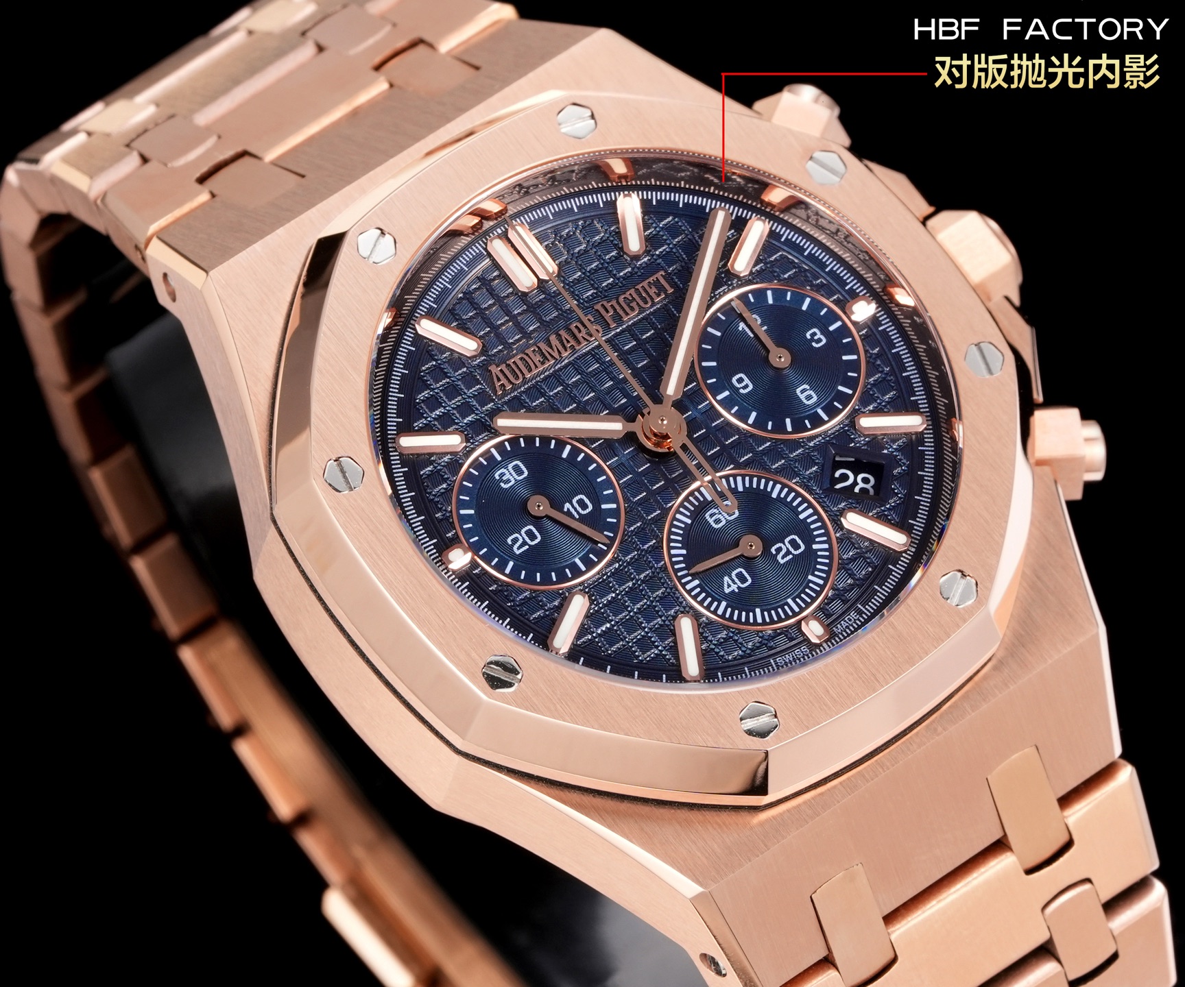 HBF Factory Audemars Piguet Royal Oak 26240ST watch. Upgraded V2 version with polished inner ring, 41mm case, 316L steel. Superlume, 7750 chronograph movement. Highest quality replica.
