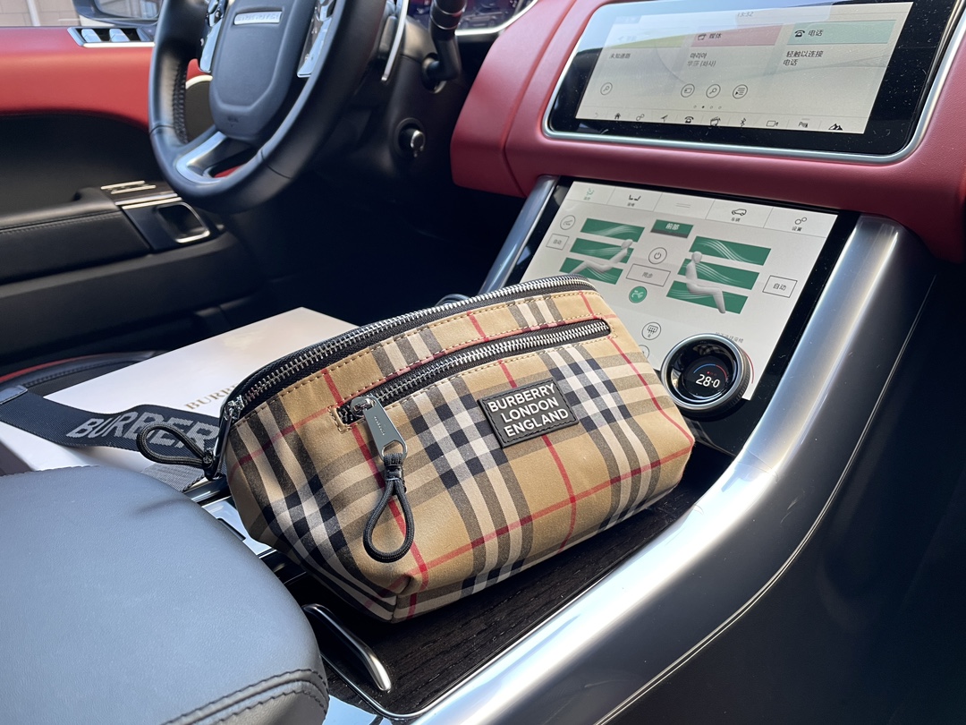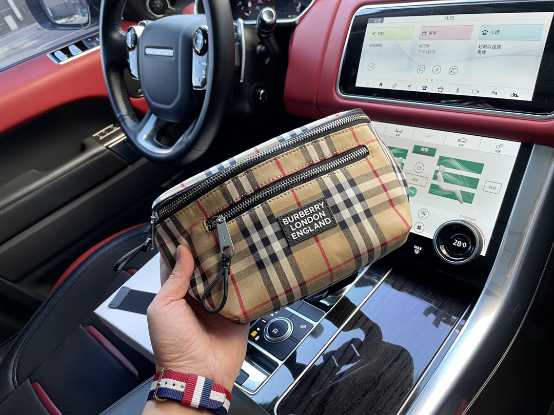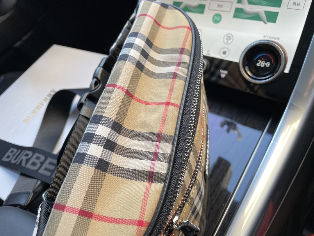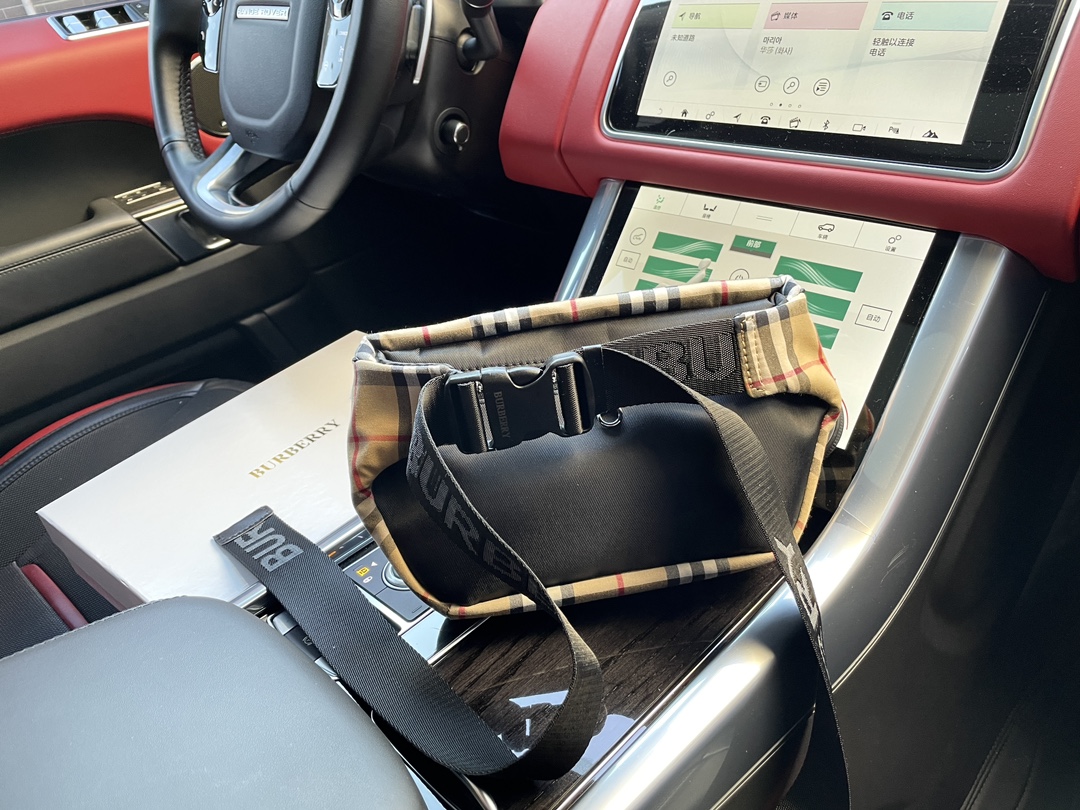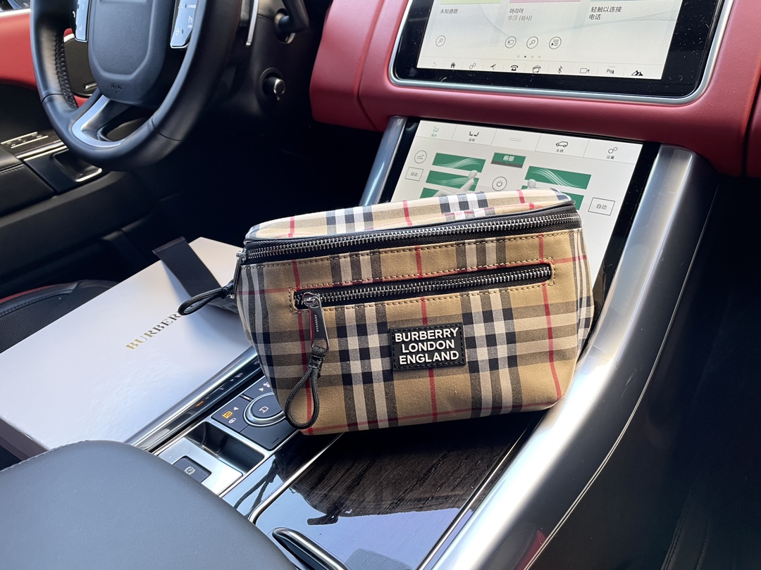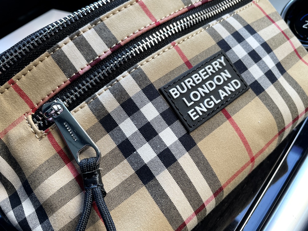 High-end Burberry waist and chest bag. Made of nylon check material with leather trim. Features smooth zipper and detailed logo. Includes gift box.