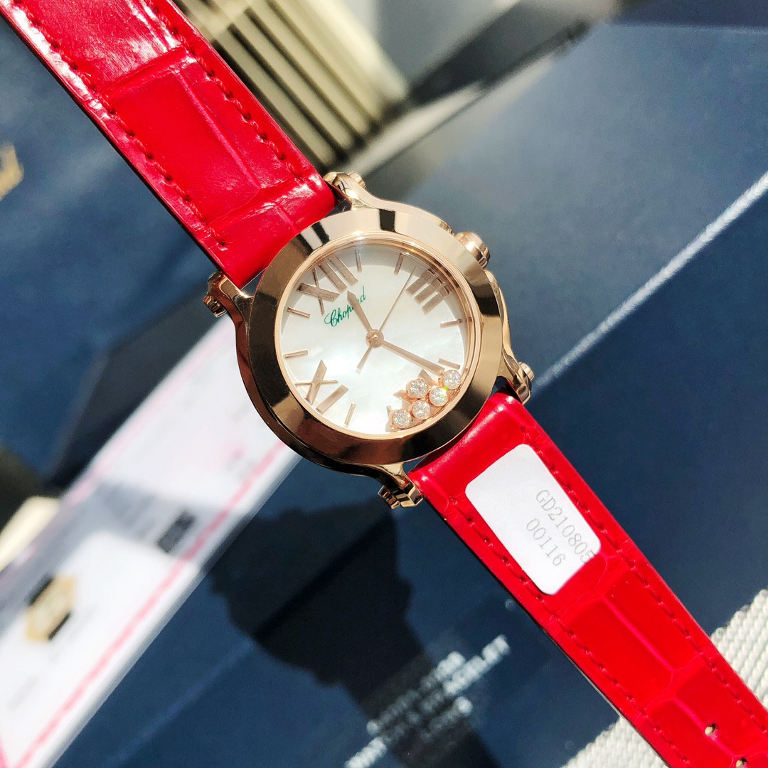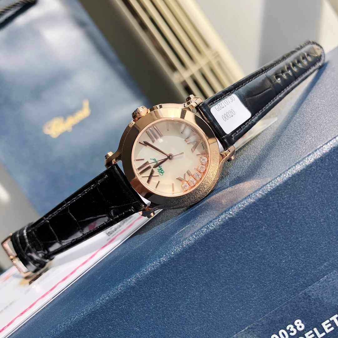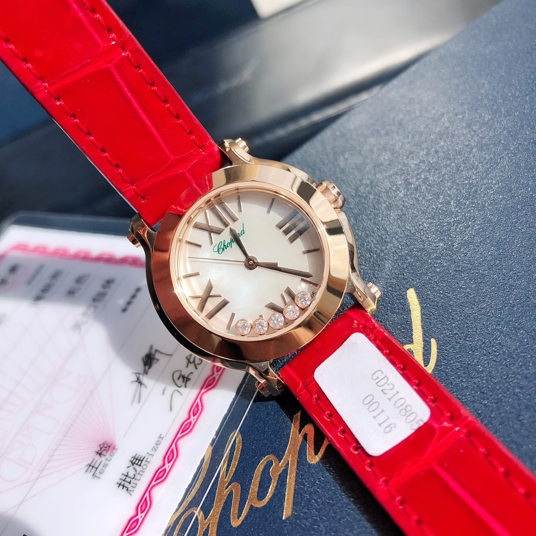 High-end Chopard HAPPY DIAMONDS watch with moving diamonds, 30mm steel case, genuine ETA movement, alligator strap, and certification.