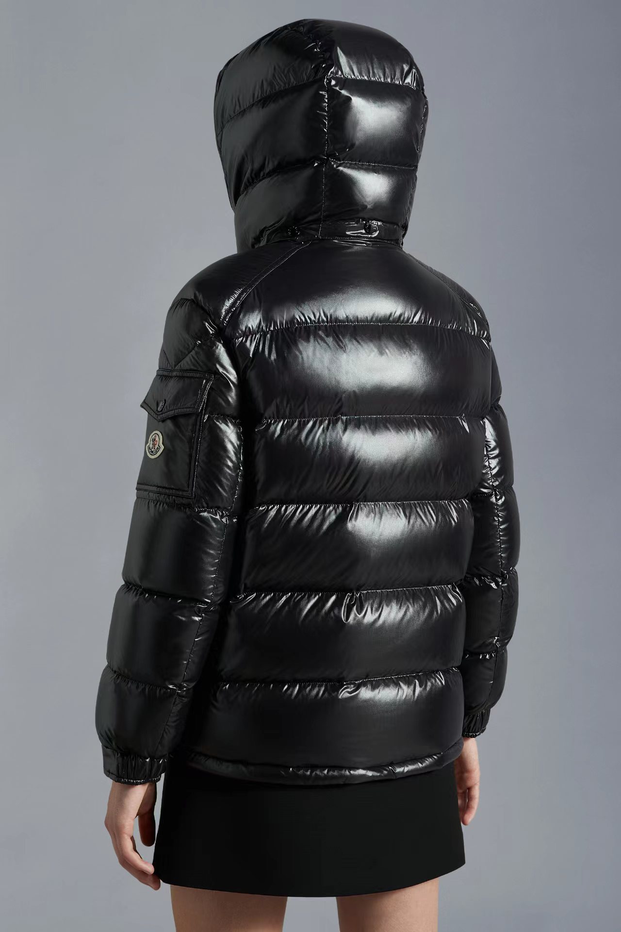 High-end Moncler Maya short down jacket in Guangzhou. Classic design with 80s-inspired details, glossy nylon, signature quilting, detachable hood, adjustable hem, and iconic branding.