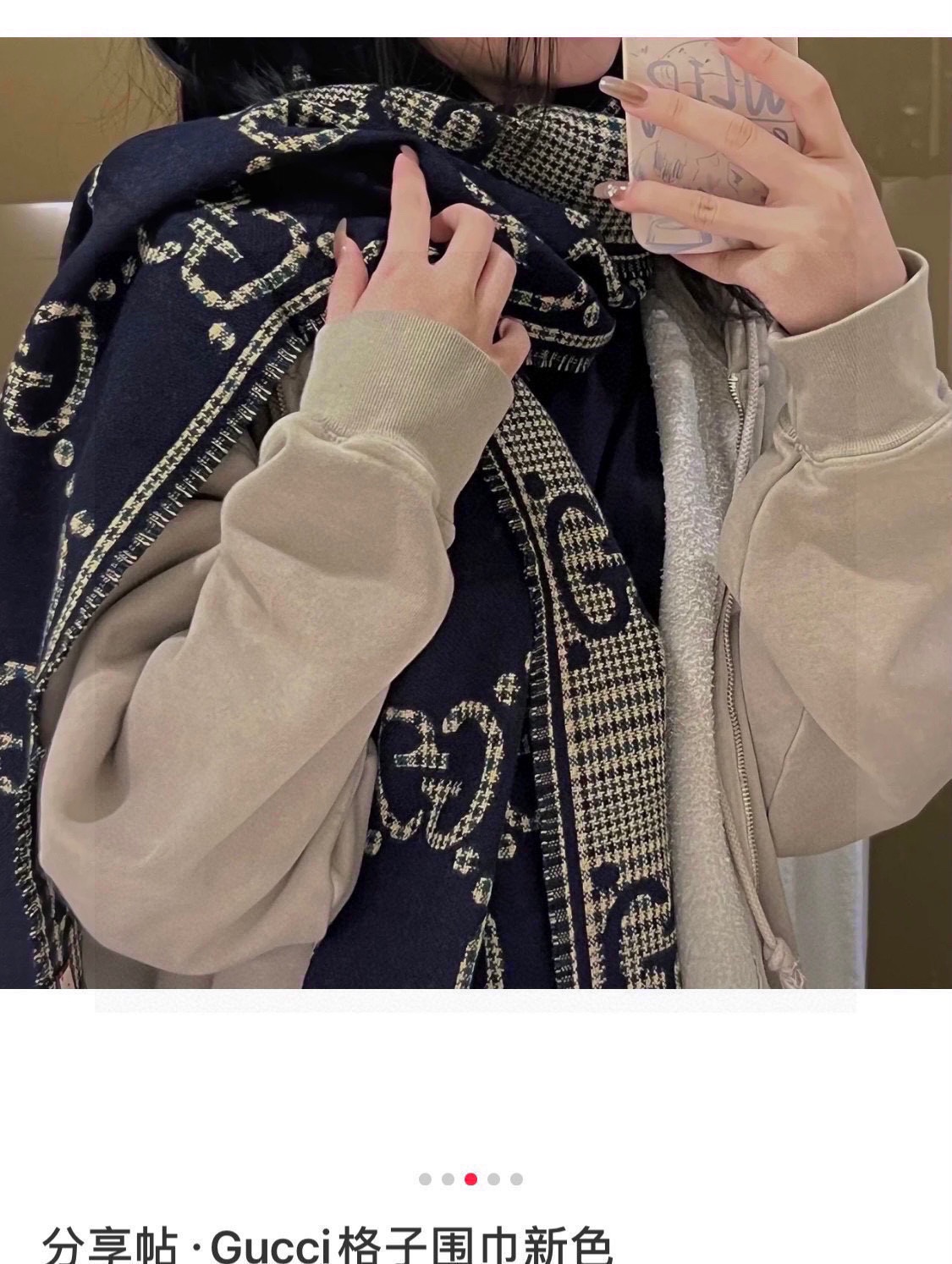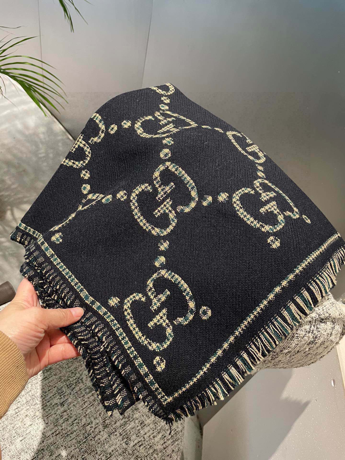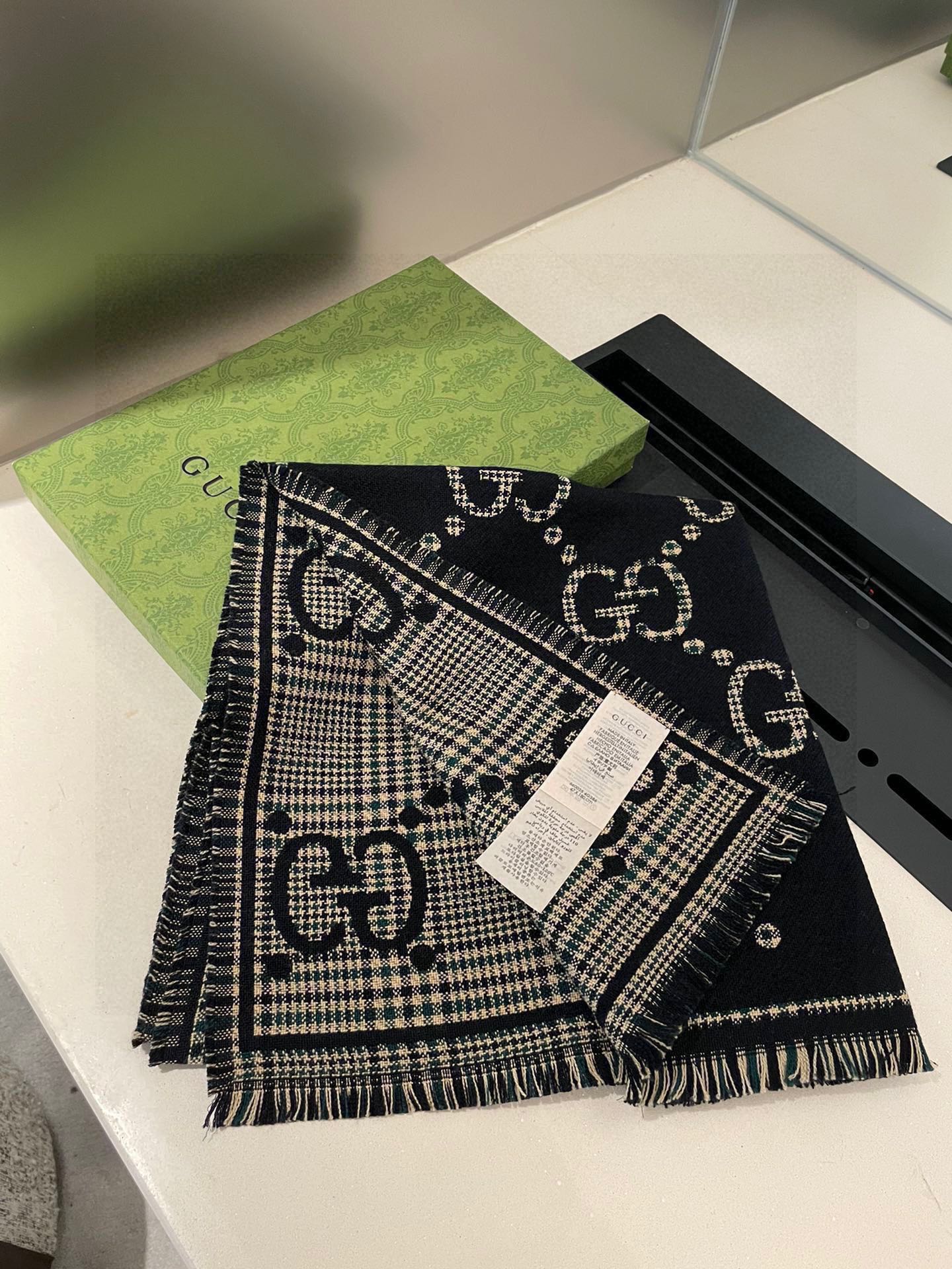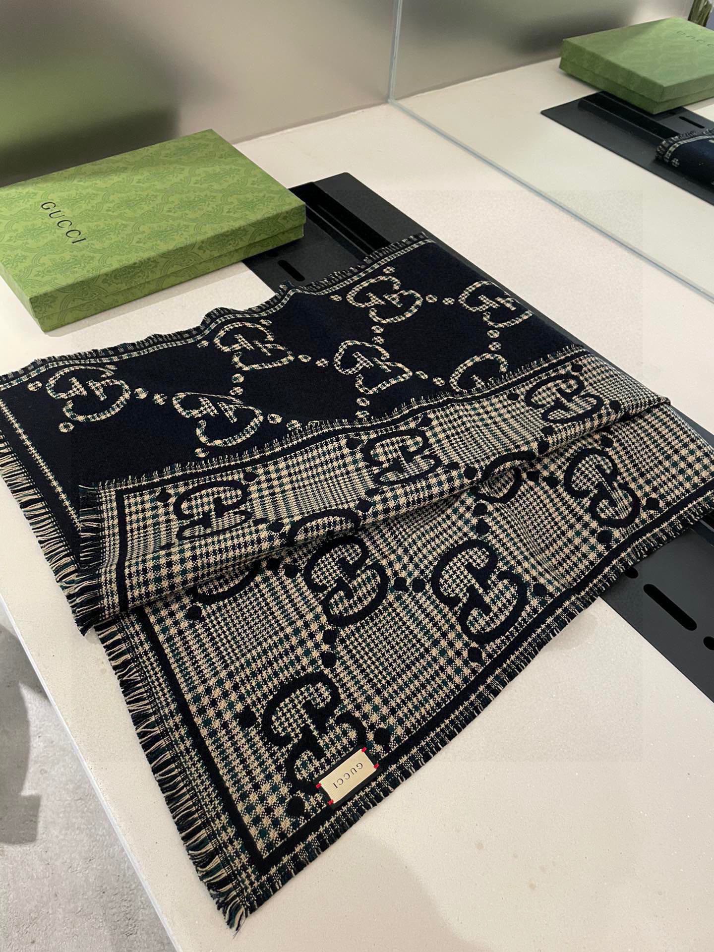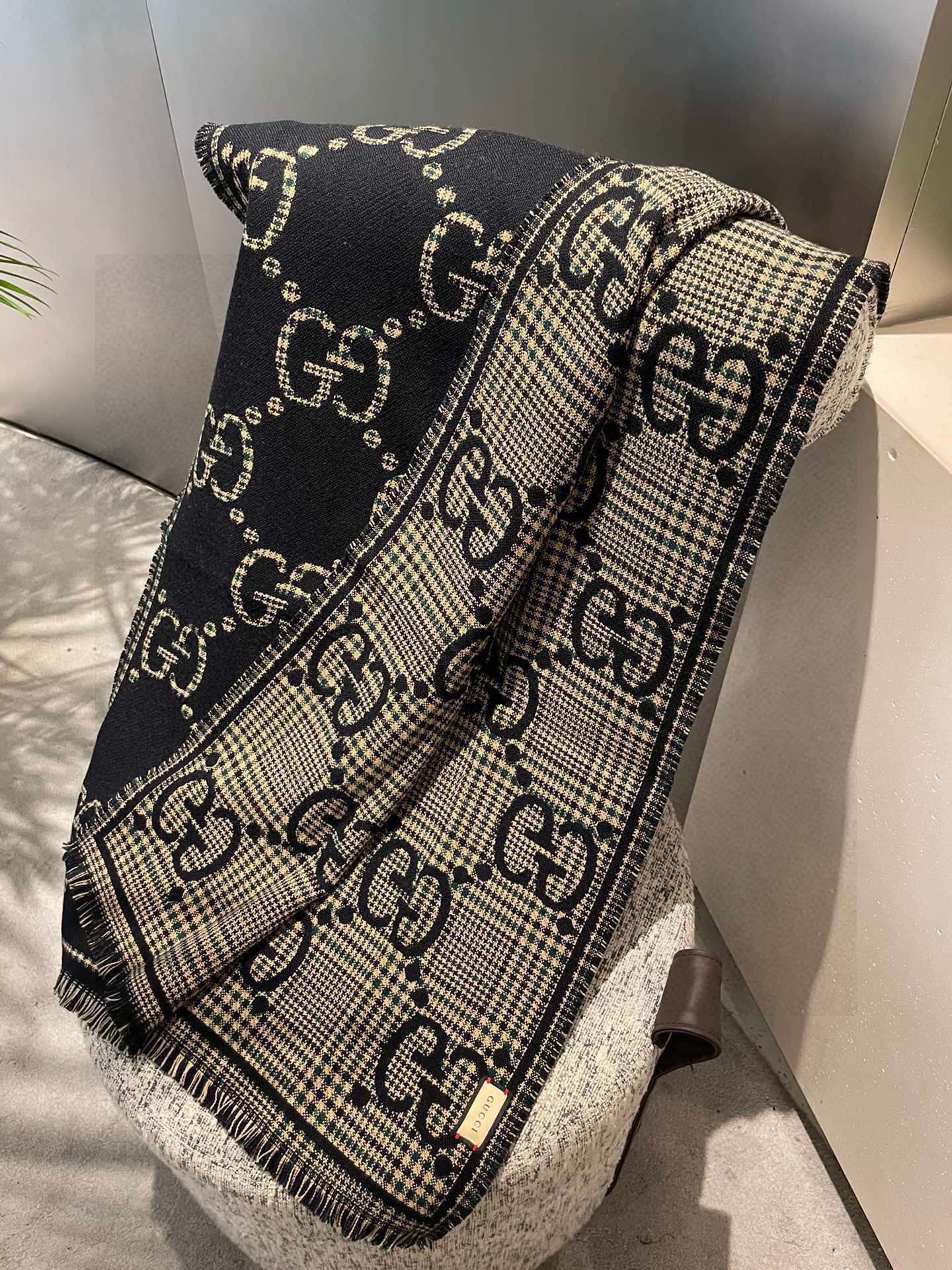 High-version G-style letter wool scarf, 47x180. Features oversized GG pattern from 1970s, evolved from 1930s Gucci design. Combines retro plaid style with modern fashion.