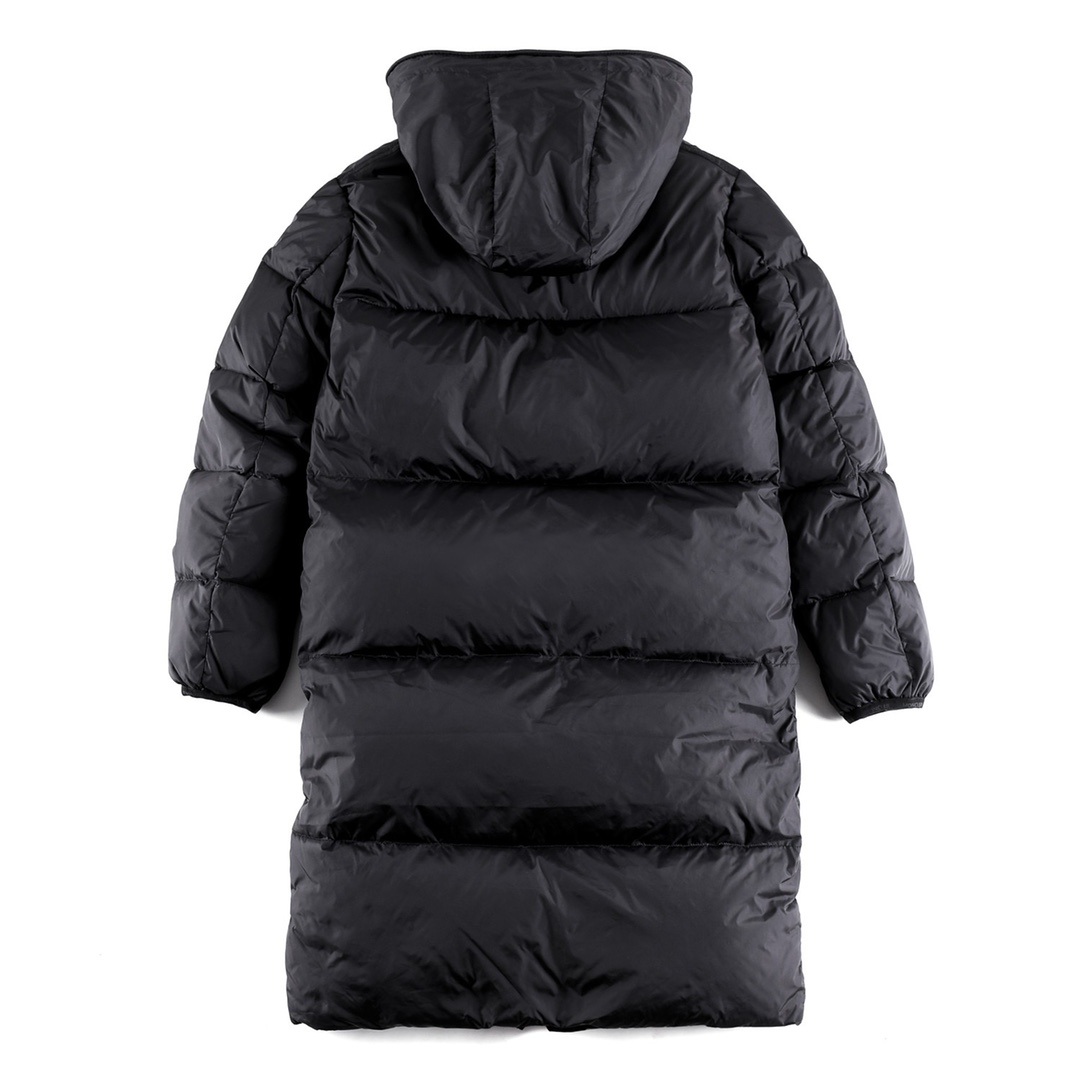 High-version Moncler long jacket with embroidered ribbon, nods to 80s style. Waterproof, insulated, quilted nylon. Colors: Black, White. Sizes available.