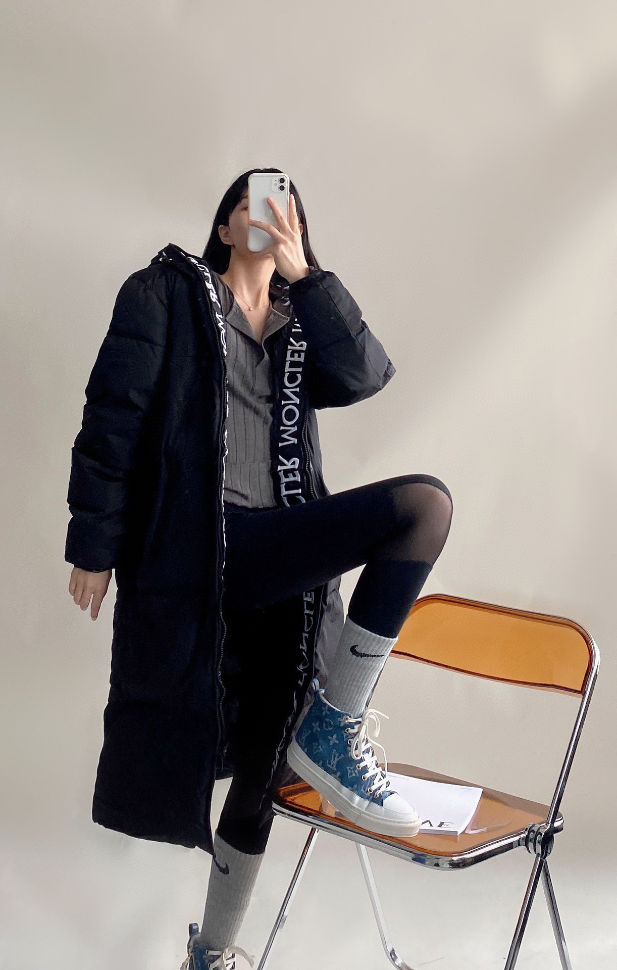 High-version Moncler long jacket with embroidery, waterproof, insulated. Hooded, quilted nylon, adjustable hem. Colors: black, white. Sizes available.
