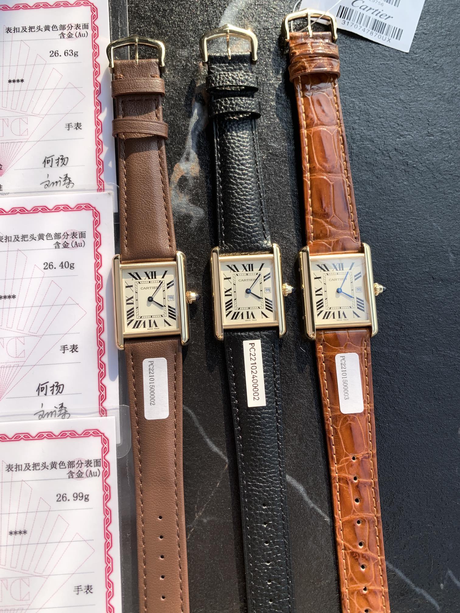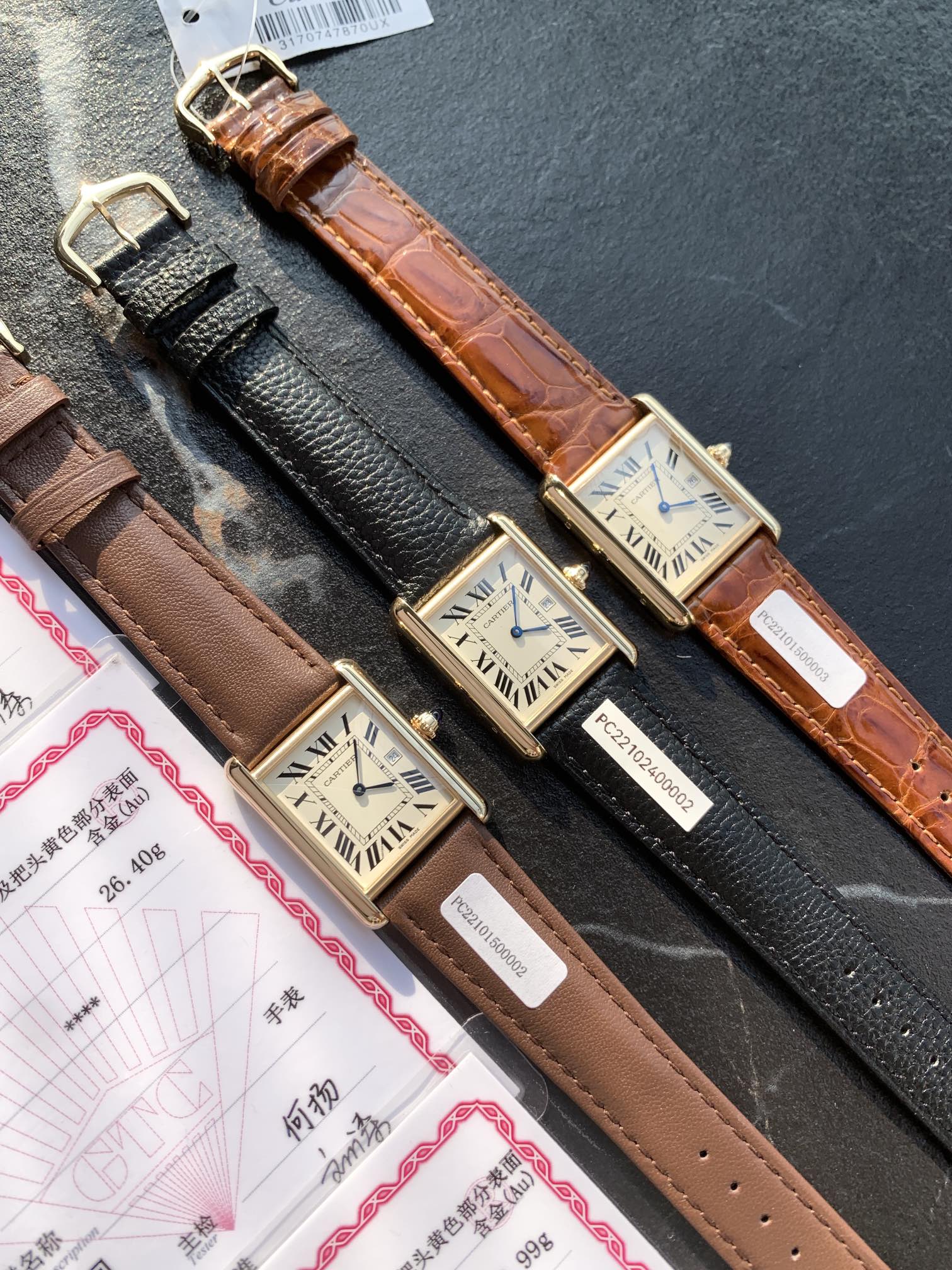 In stock: New Cartier Tank watch with 18k gold plating, Swiss quartz movement, 33.7x25.5mm case, sapphire crown, alligator strap, waterproof.