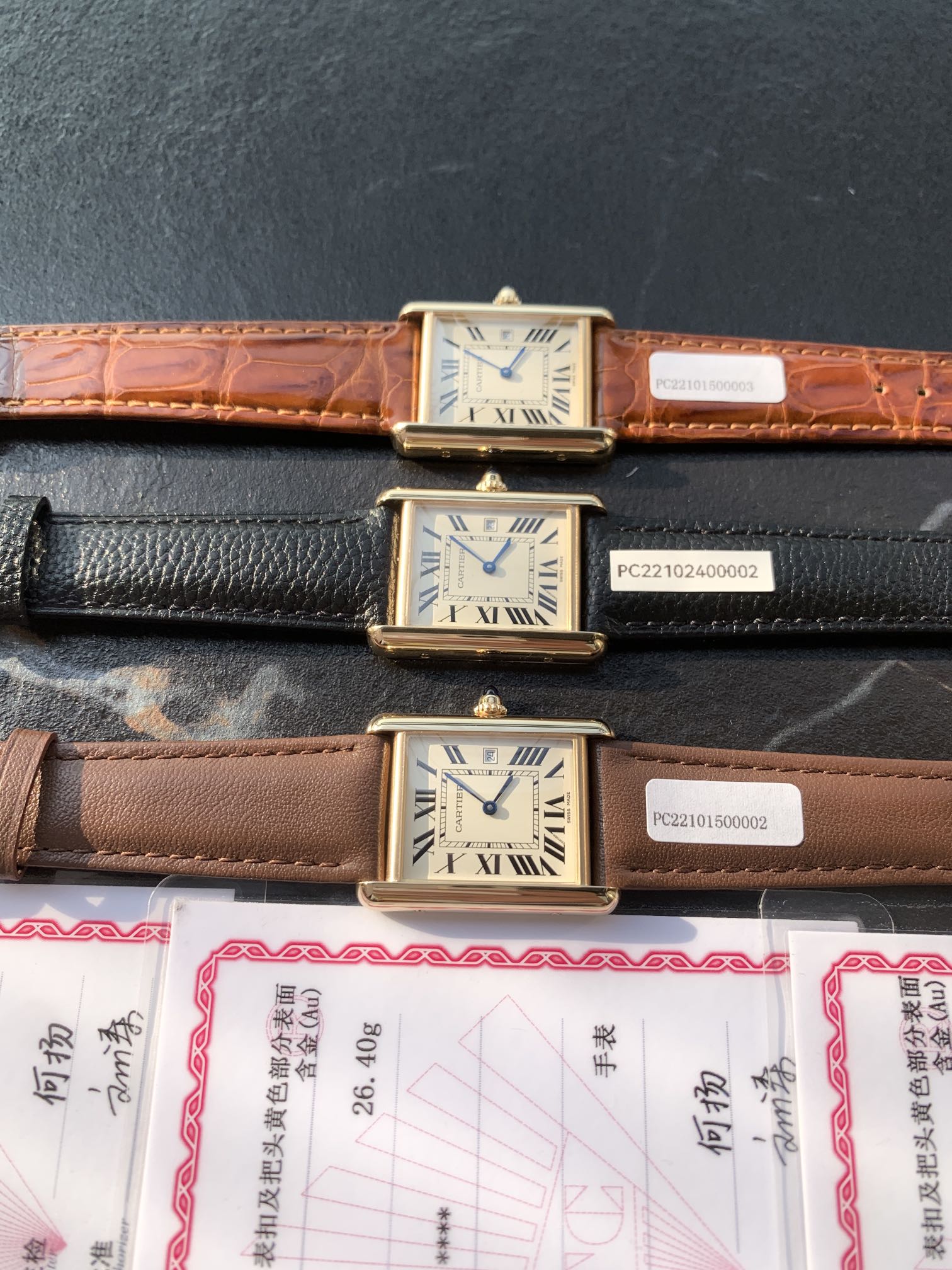 New original Cartier Tank, a representative of the CARTIER Tank watch family! Authentic 18k gold plating, matched with inspection certificate from China's authoritative GTC institution. One watch, one code; one item, one certificate. Supports re-inspection! Crafted entirely from precious metals (fully gold-plated), the case lines are more rounded and delicate. Swiss original quartz movement. New dimensions: 33.7 x 25.5 mm – this size is just right. Thickness: 6.35 mm. The easiest way to recognize it is the conical-shaped sapphire on the crown and the calendar display! Specially crafted diamond-shaped glass enhances the sense of depth. Dial features Roman numeral hour markers, with an inner track serving as the scale for precise time reading. Hands are made of blued steel sword-style hands. The bead-shaped crown is set with a blue synthetic conical gemstone. Countless adjustments ensure perfect accuracy! The strap is made of imported crocodile leather, carefully selected for texture, with color and grain exactly like the genuine product. 30 meters water resistance for daily life. Can be returned or exchanged if it does not affect resale. Comes with official store packaging for delivery.