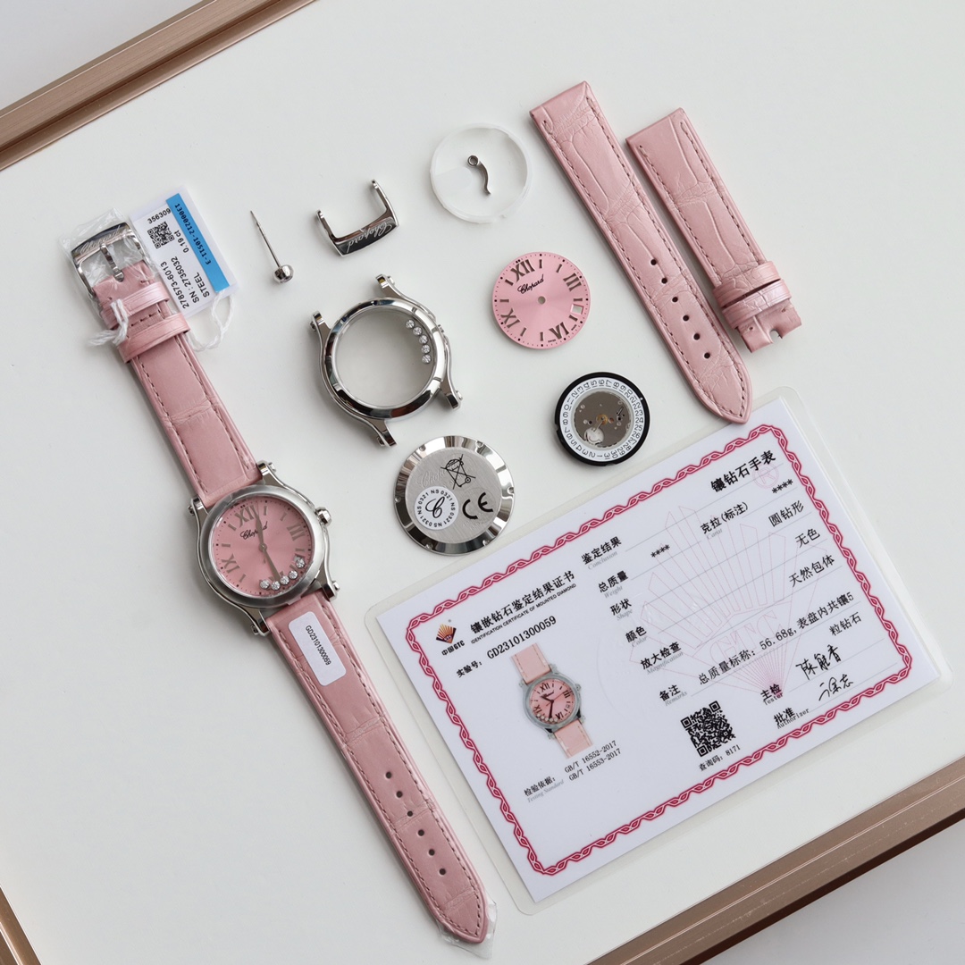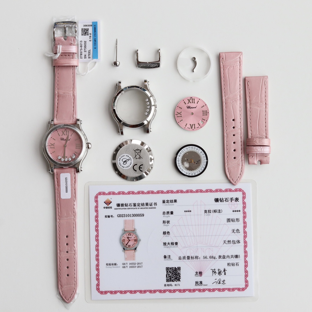Introducing Chopard Happy Sport watch with moving diamonds, sleek steel case, silver dial, 36mm, Swiss Ronda 515 movement, genuine diamonds, alligator strap.