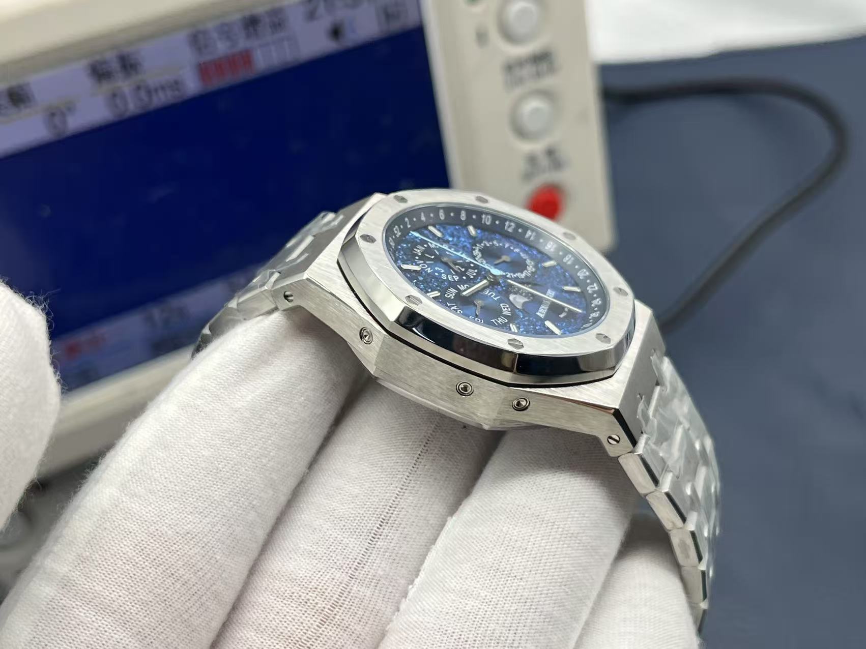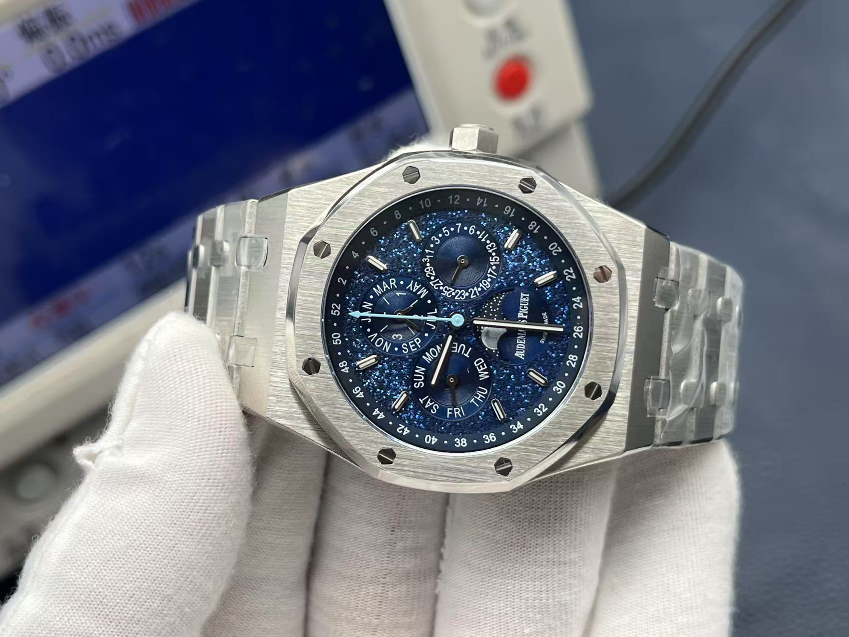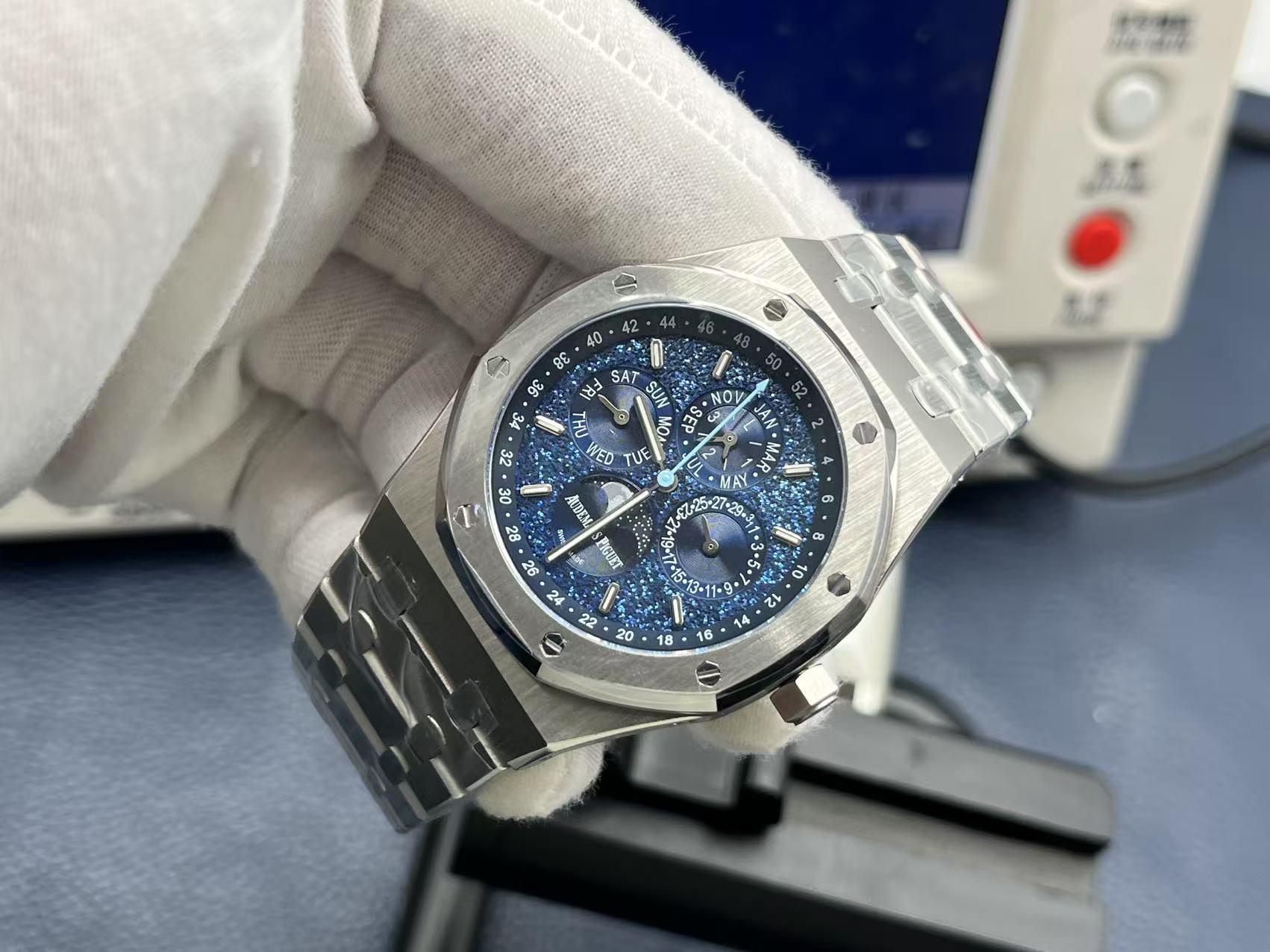 JF Factory 2025 Recommended: Audemars Piguet Royal Oak Perpetual Calendar Watch. 41mm steel case, blue "Grande Tapisserie" dial. Full functions: day, date, month, moon phase. Custom automatic movement. Faithful replica for collectors.