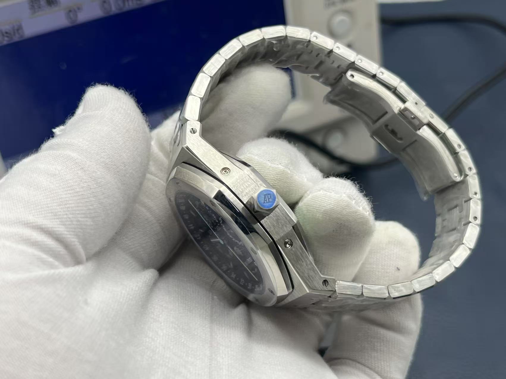 41mm diameter 316L stainless steel case, paired with an 11.4mm slim thickness, where the cool metallic texture clashes with the noble blue dial to create unique tension. The blue dial is engraved with the iconic "Grande Tapisserie" large grid pattern decoration; three-dimensional hour markers and faceted hands are coated with luminescent material, ensuring clear reading in the dark. The sapphire crystal with anti-glare treatment makes the dial clear and bright, with every detail echoing the classic genes of the Audemars Piguet Royal Oak.