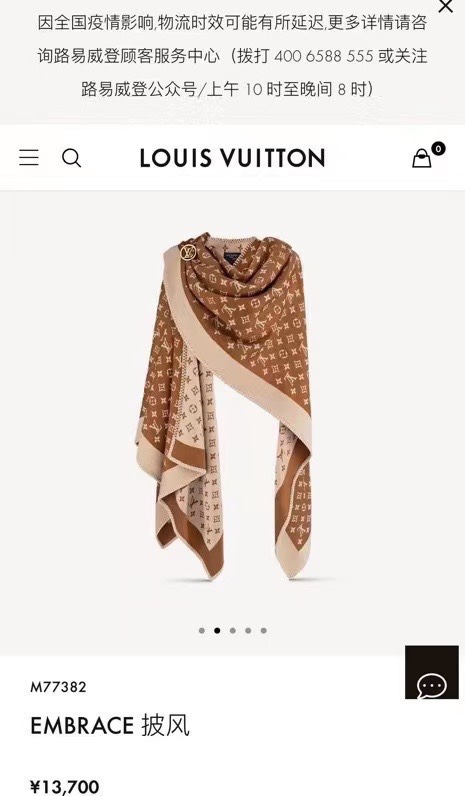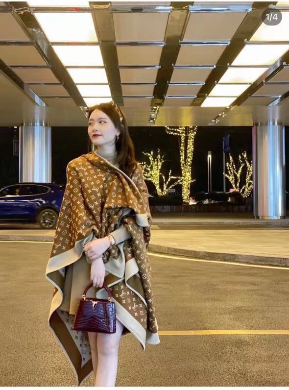 𝐋𝐨𝐮𝐢𝐬 𝐕𝐮𝐢𝐭𝐭𝐨𝐧 EMBRACE Cape size: 137 x 152cm Lockstitch embroidery Material: 70% wool, 20% silk, 10% cashmere The Embrace cape is woven from a blend of wool, silk, and cashmere for a soft touch. The full Monogram pattern is gathered through lockstitch embroidery, paired with a dazzling LV Circle logo buckle, paying homage to Louis Vuitton's travel heritage. Full Monogram jacquard weave.