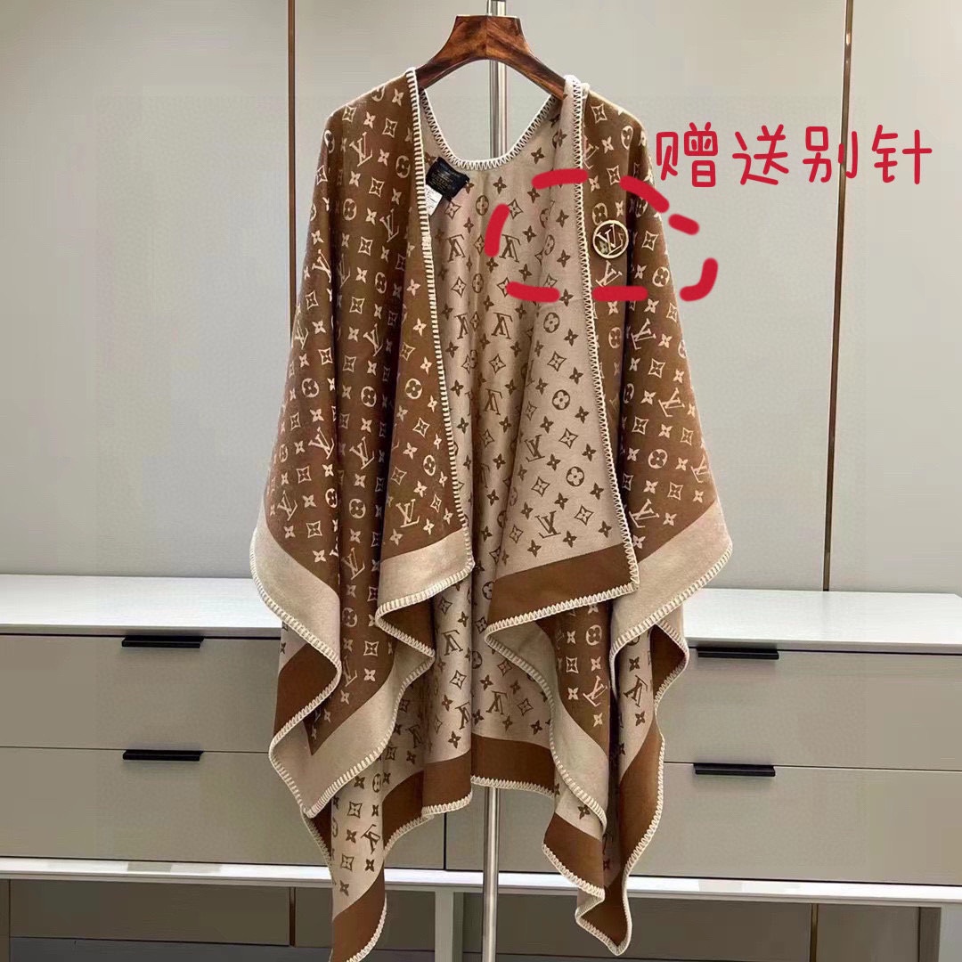 Louis Vuitton Embrace cape, 137x152cm. 70% wool, 20% silk, 10% cashmere. Features monogram jacquard and LV Circle clasp.