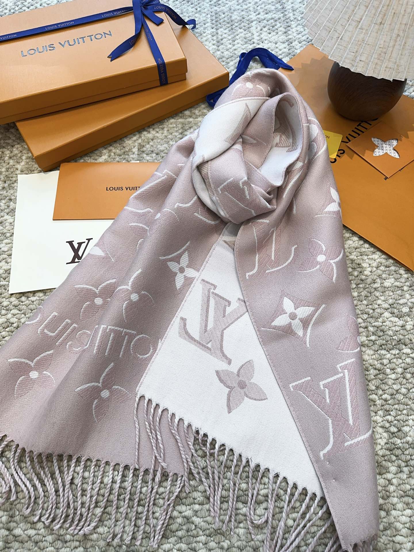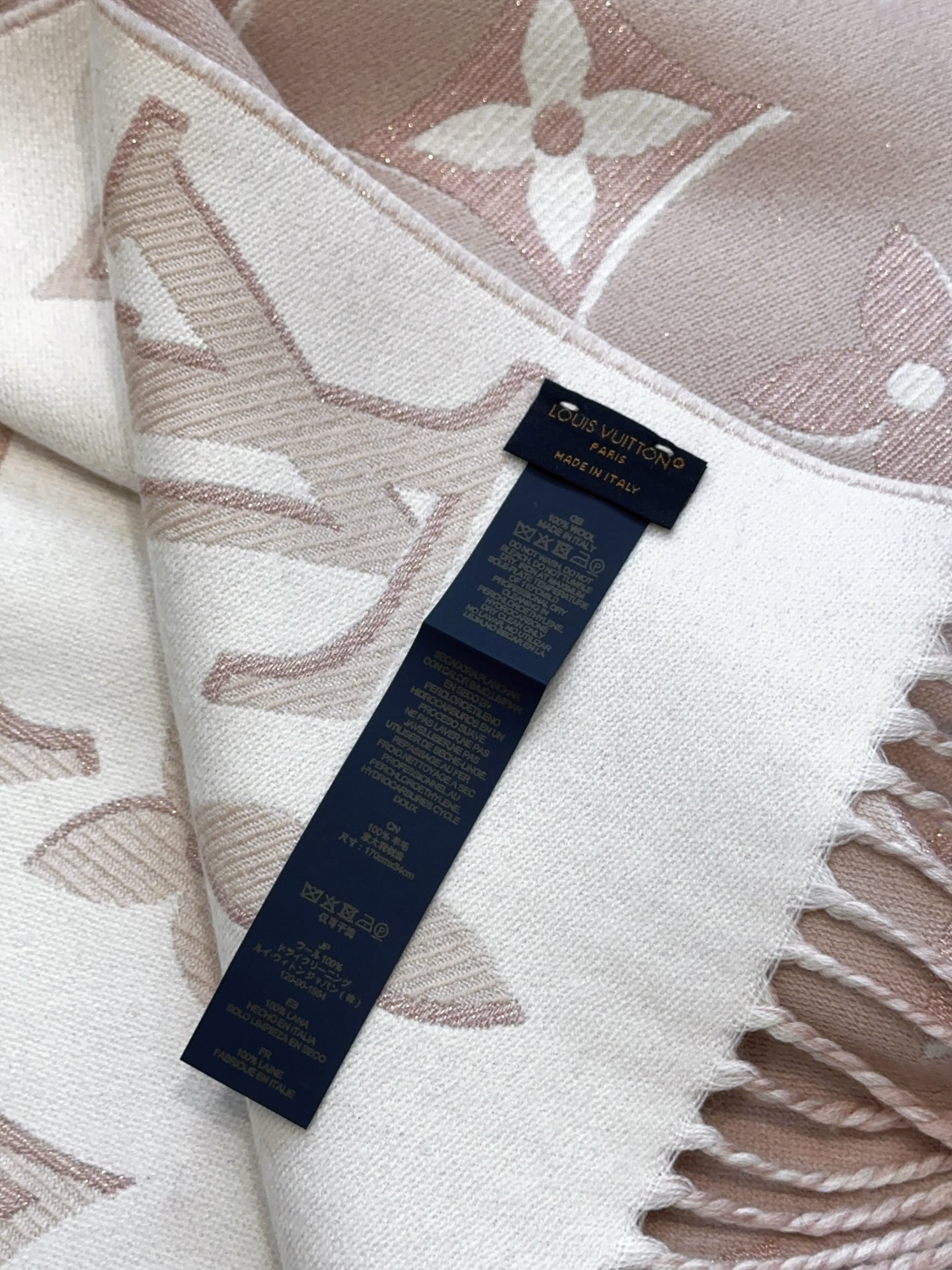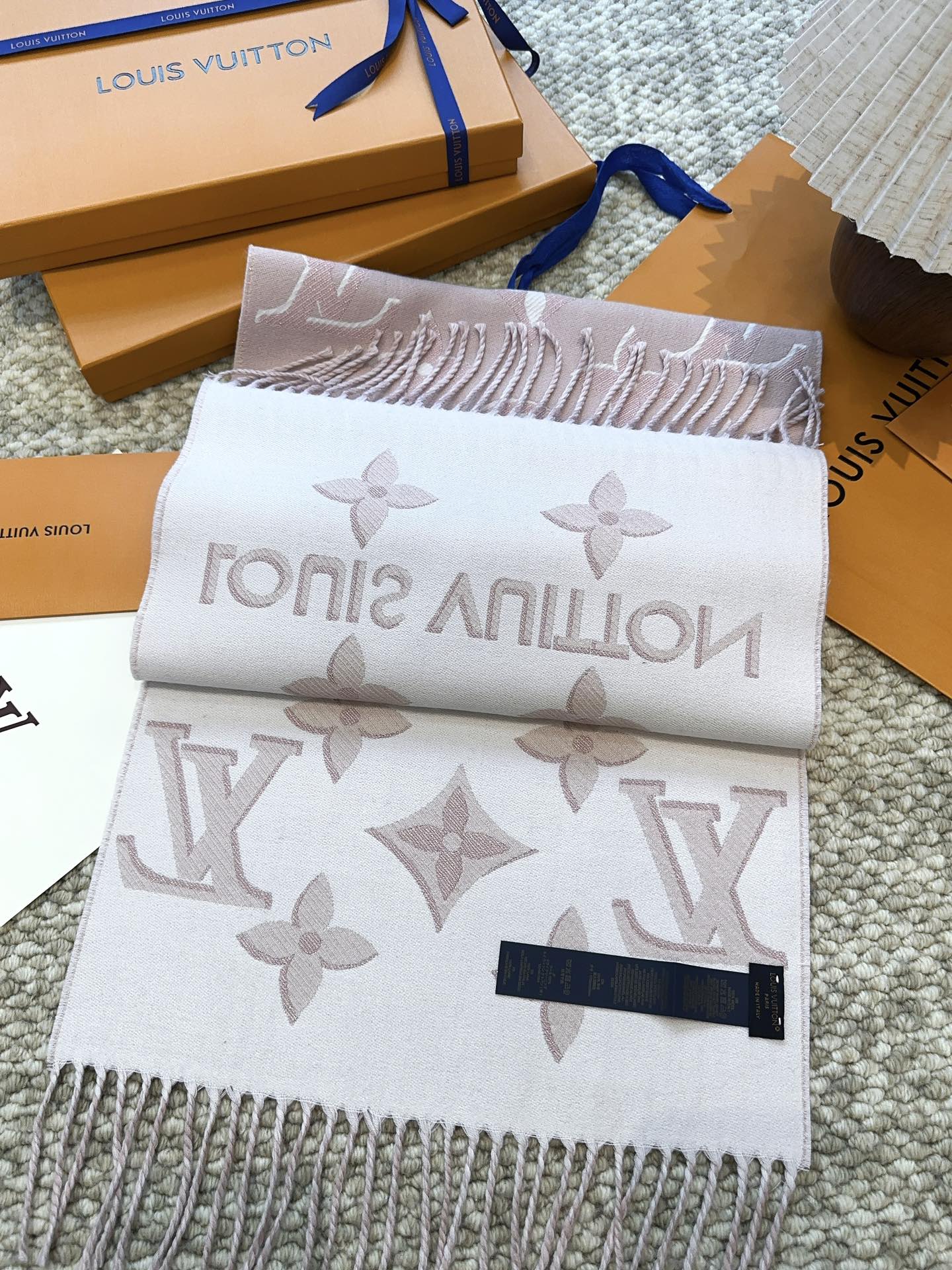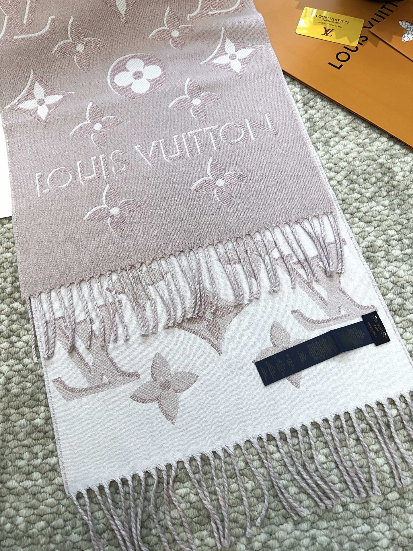 Louis Vuitton's popular pink and white scarf, 100% wool with fringes, measures 186x34cm.