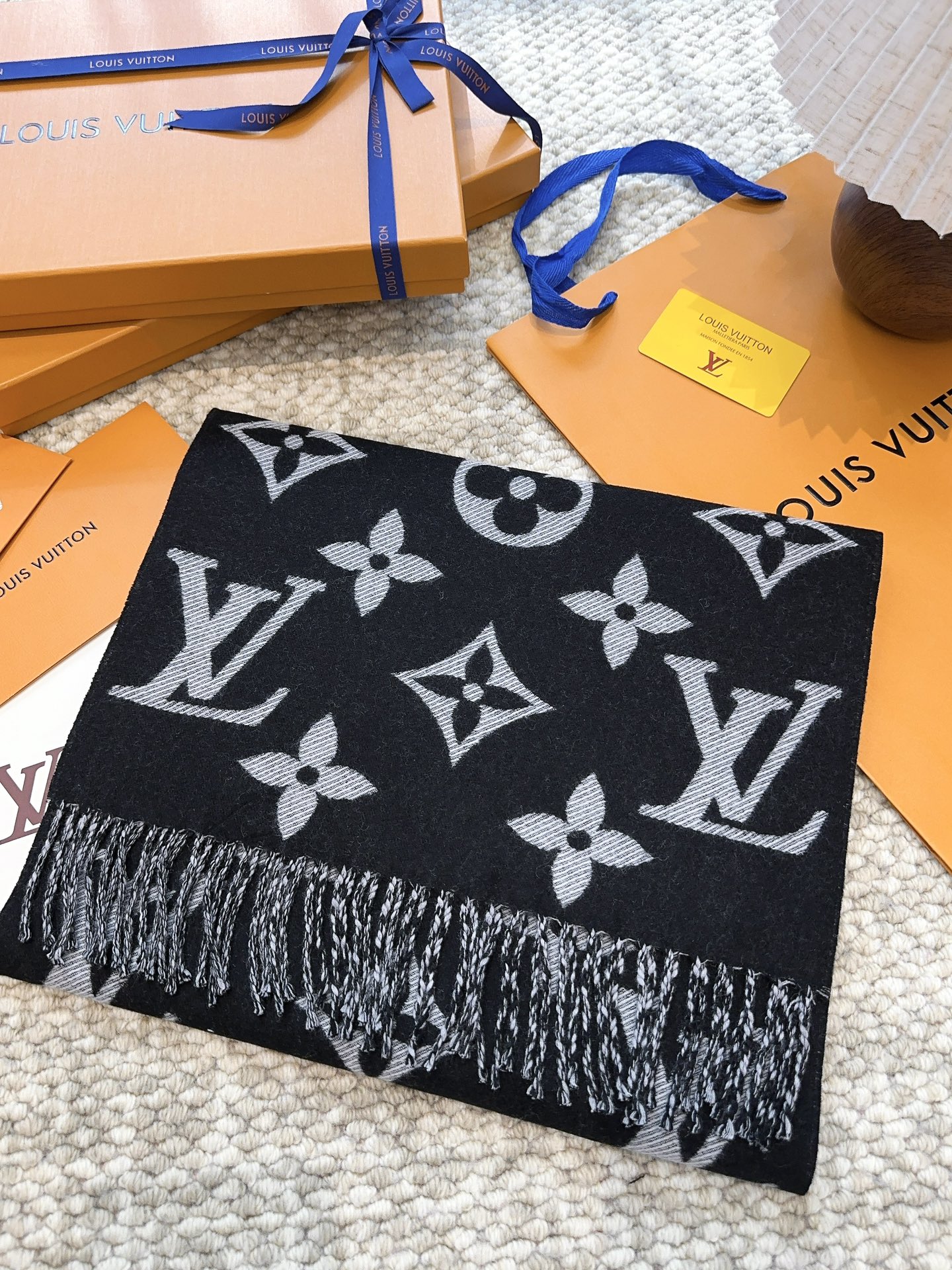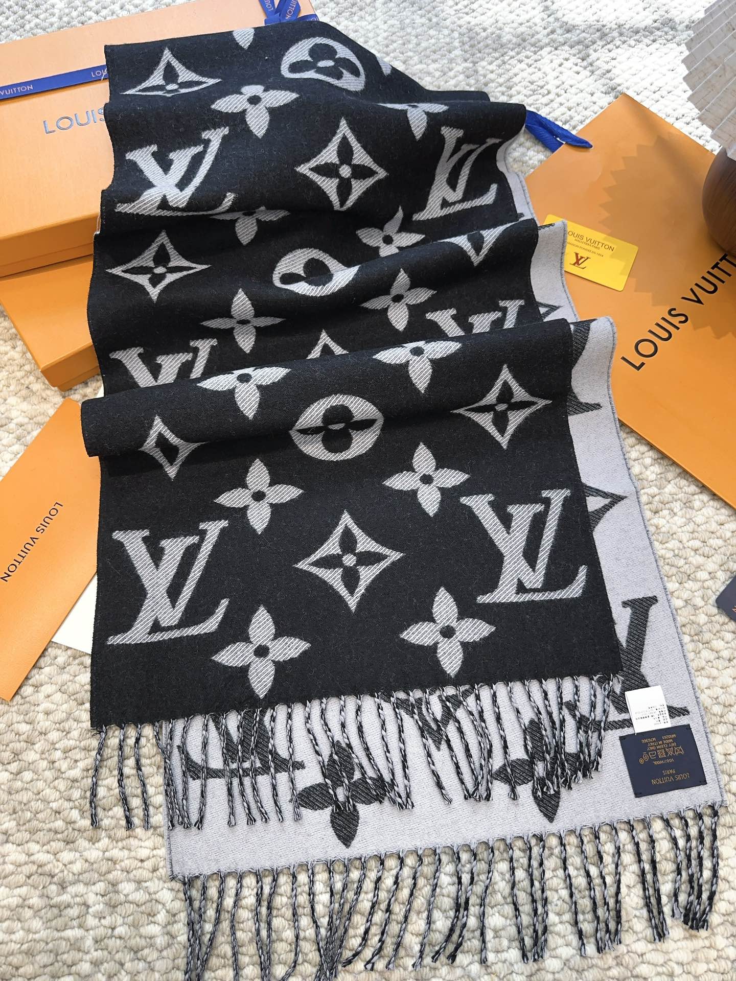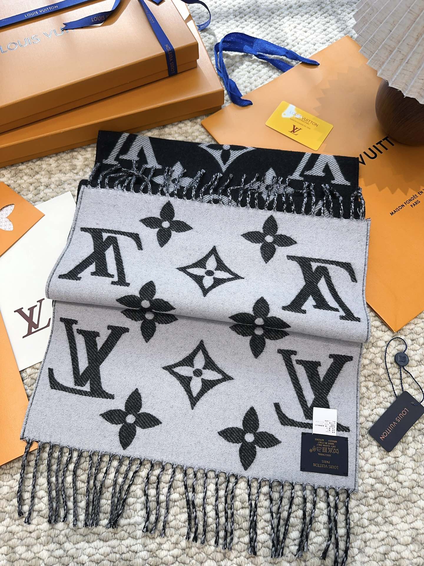 Finally released! The big donkey launched on August 26th, this year's most popular light pink and white scarf. This LV Essential scarf focuses on large elements, showcasing the brand's heritage with the Monogram pattern and Louis Vuitton logo, paired with soft fringe detailing, offering a relaxed alternative to the Reykjavik scarf.