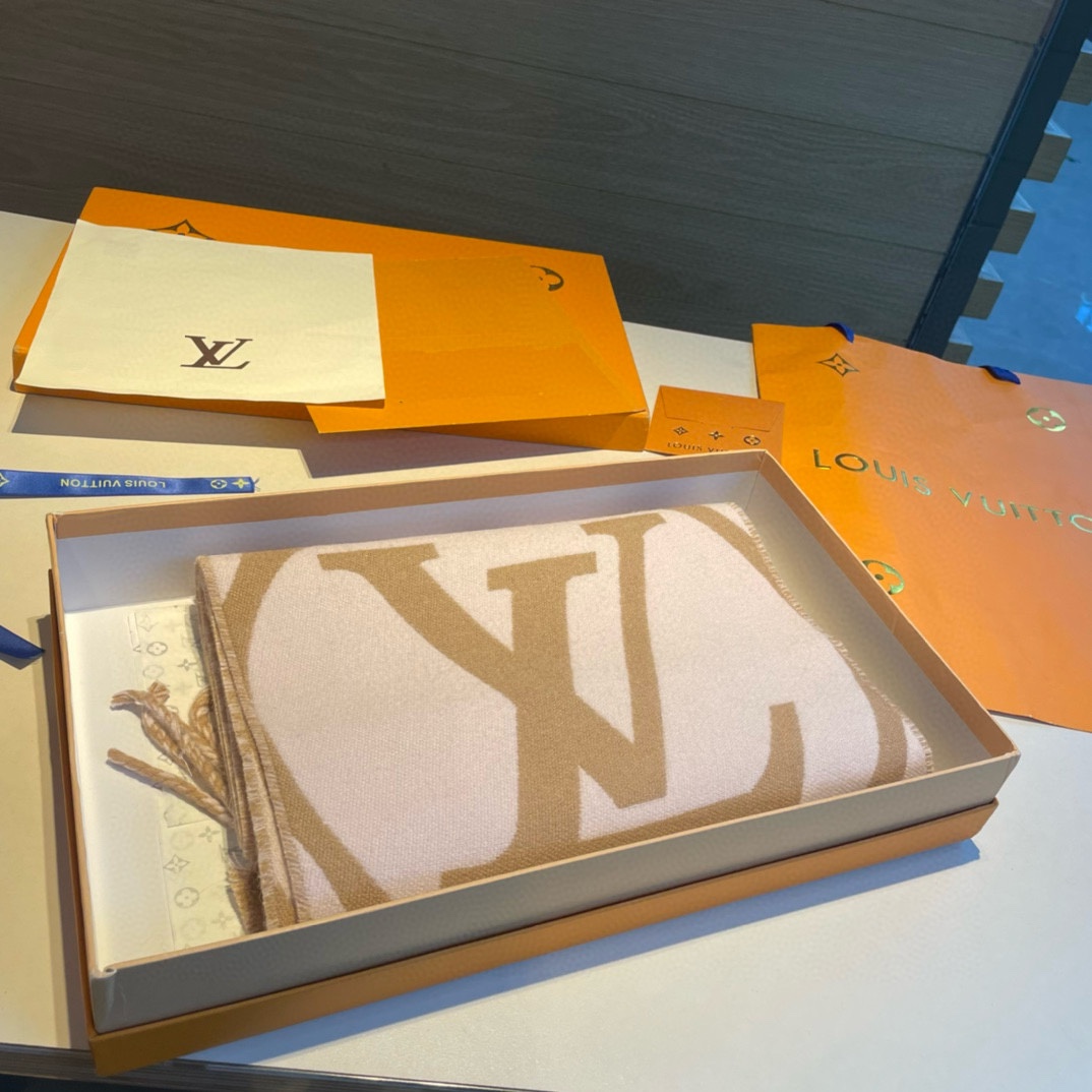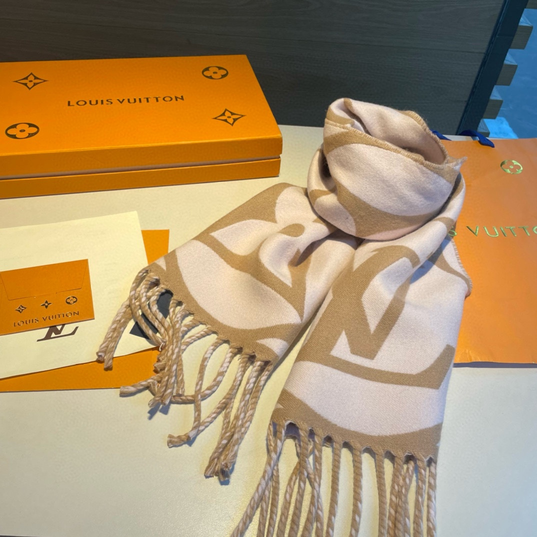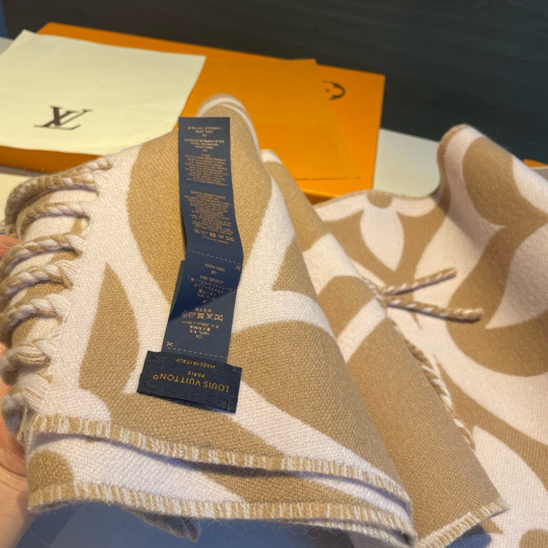 LV 2023 autumn-winter Medallion scarf. Features oversized classic letters and Monogram flowers with fringe trim. 100% sheep wool. 209x30 cm.
