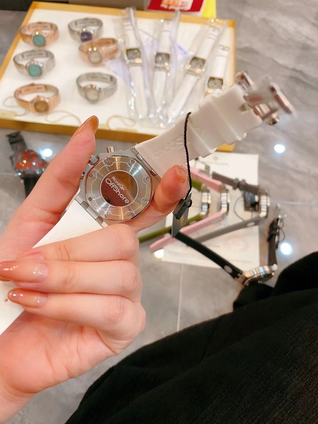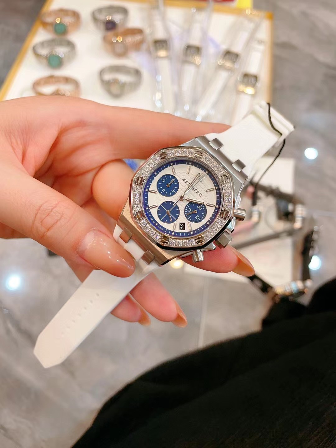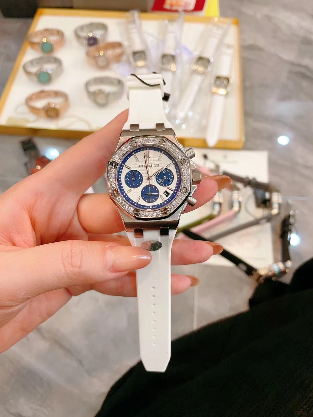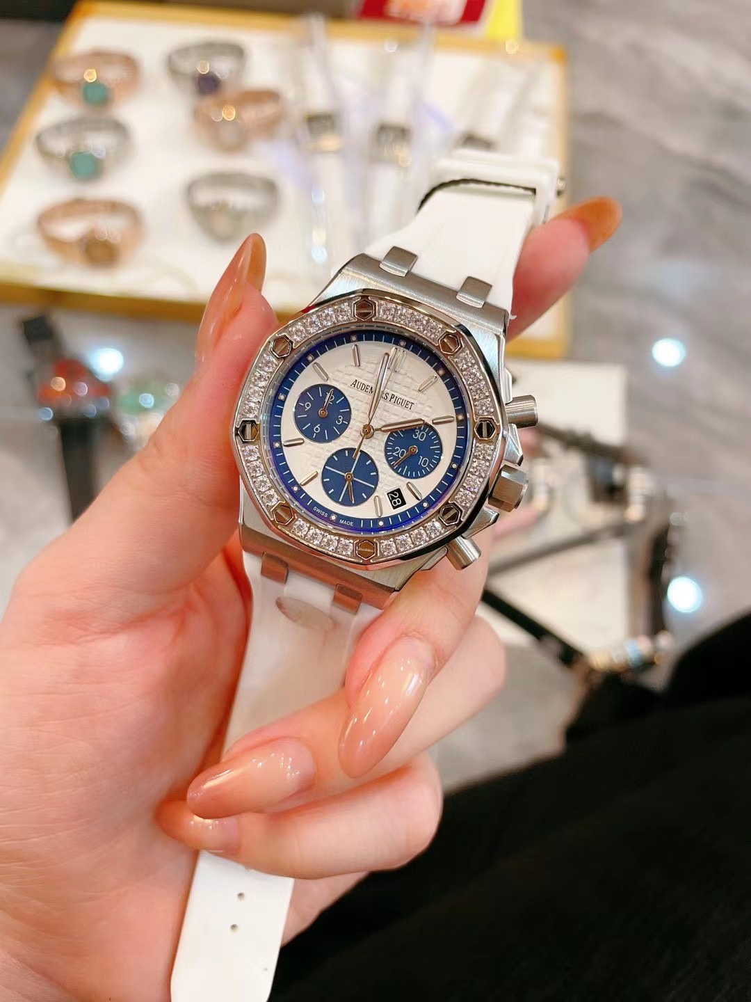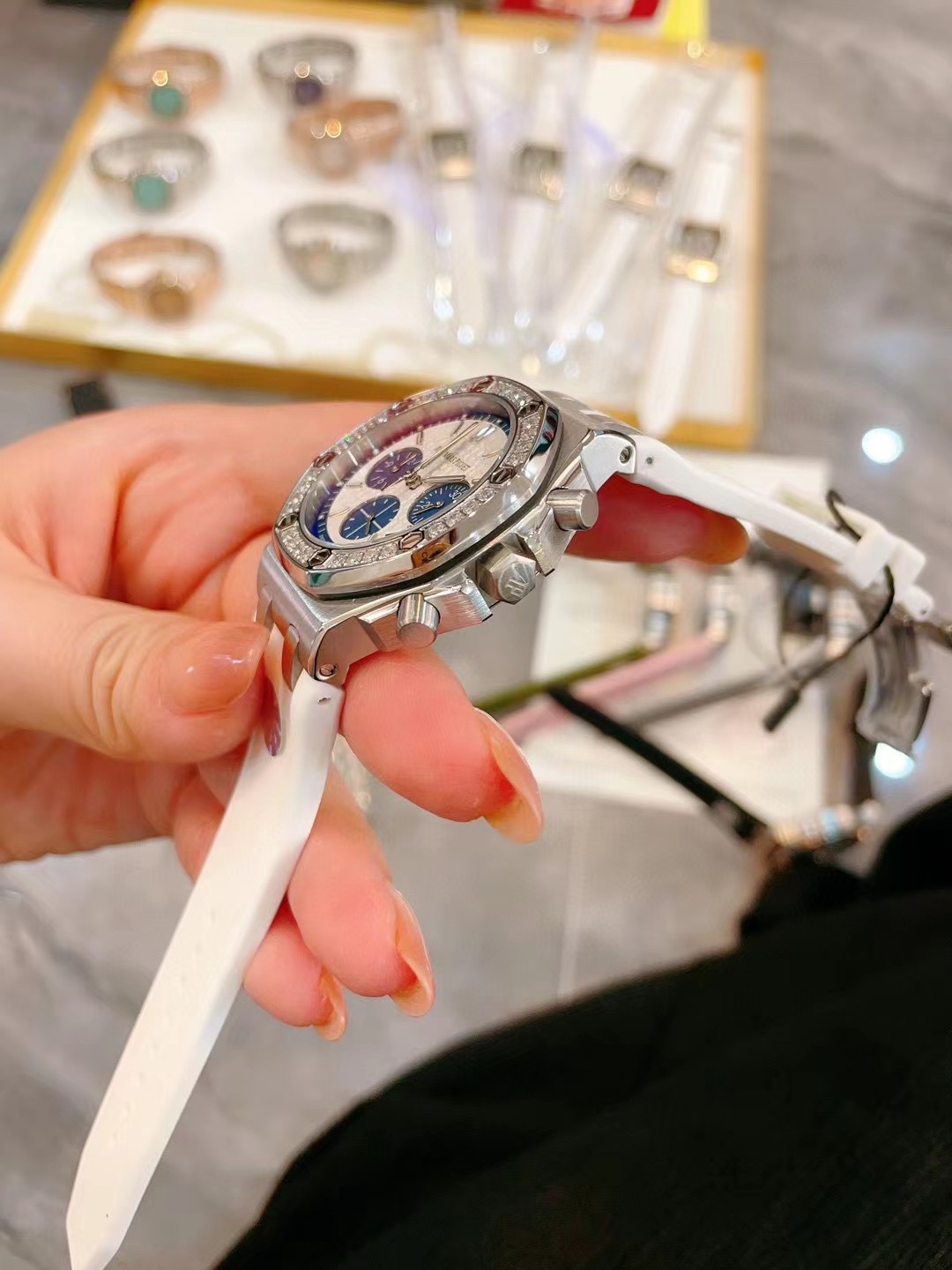 With box - Internet-famous hit AP Audemars Piguet Royal Oak series, almost every beauty has one! Stainless steel case set with diamonds, octagonal diamond bezel design, imported Japanese multi-function quartz movement, stable with chronograph function, sapphire crystal scratch-resistant glass, uses food-grade safe rubber strap that is skin-friendly and non-toxic. Versatile size 37mm, suitable for any woman's wrist. MF factory high version is worth owning.