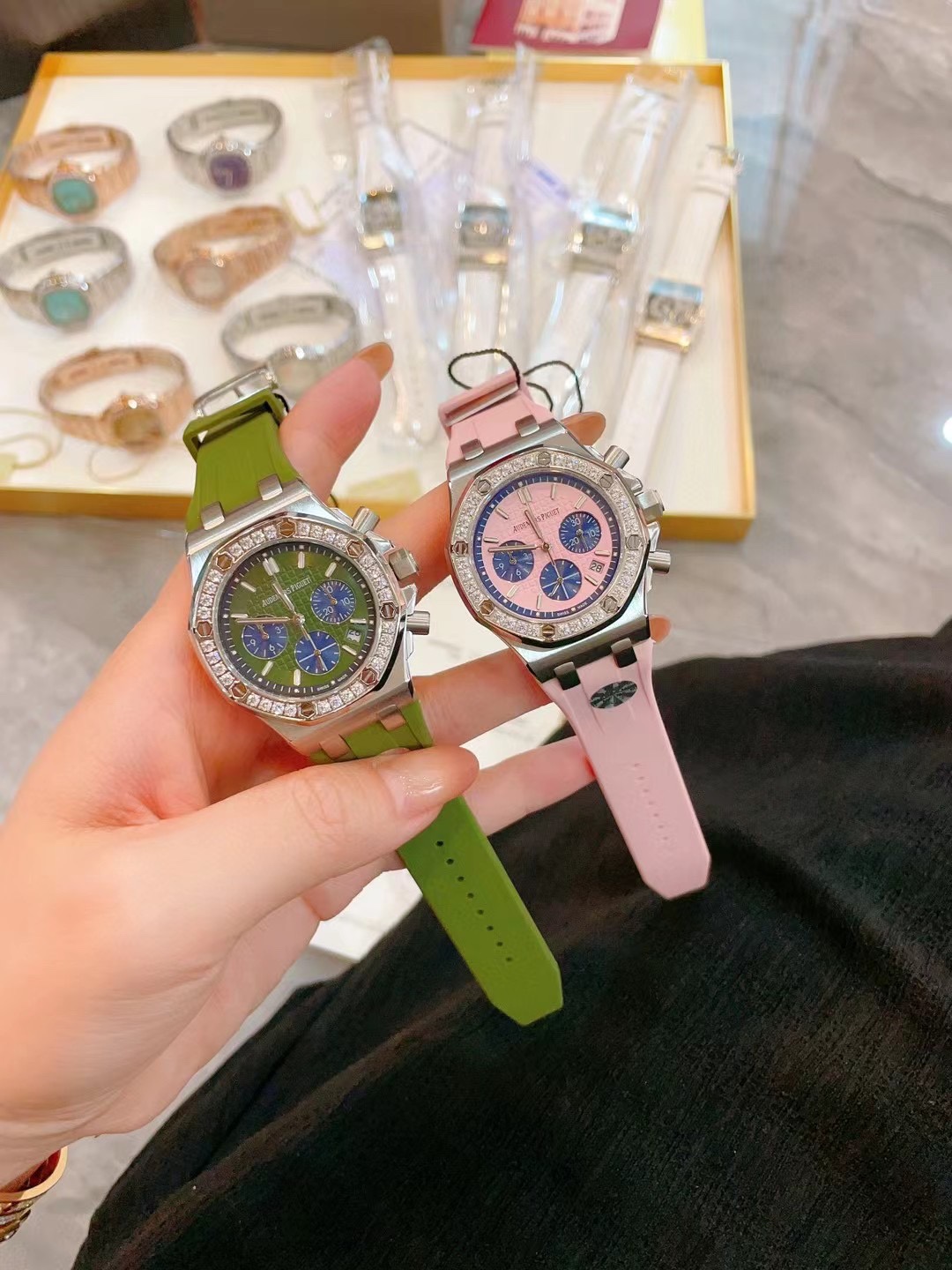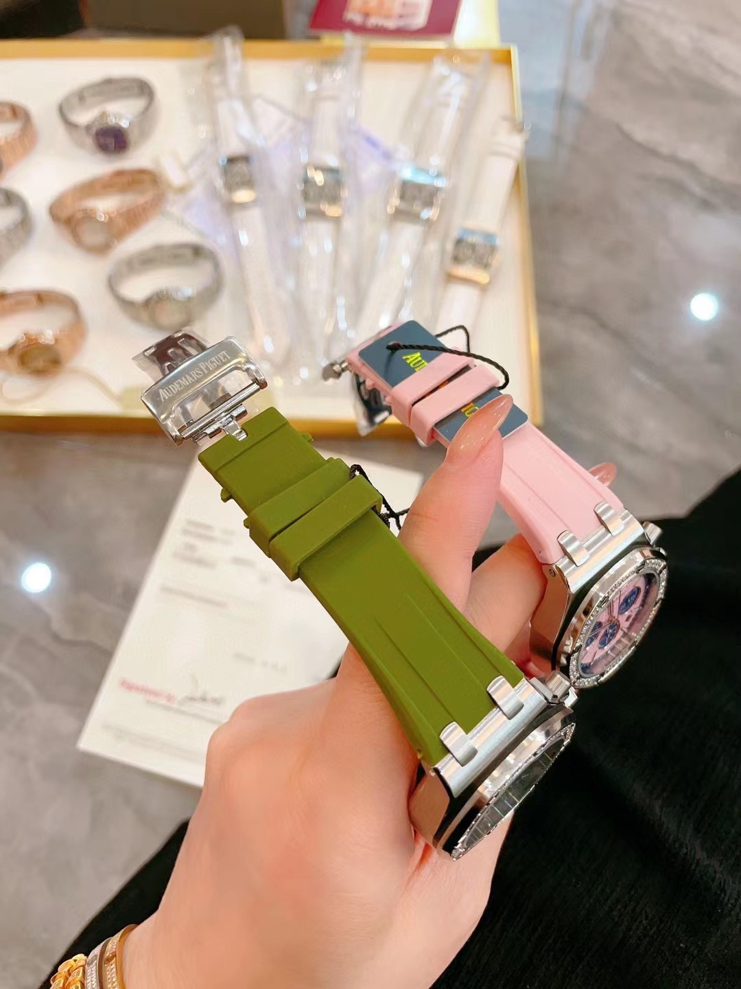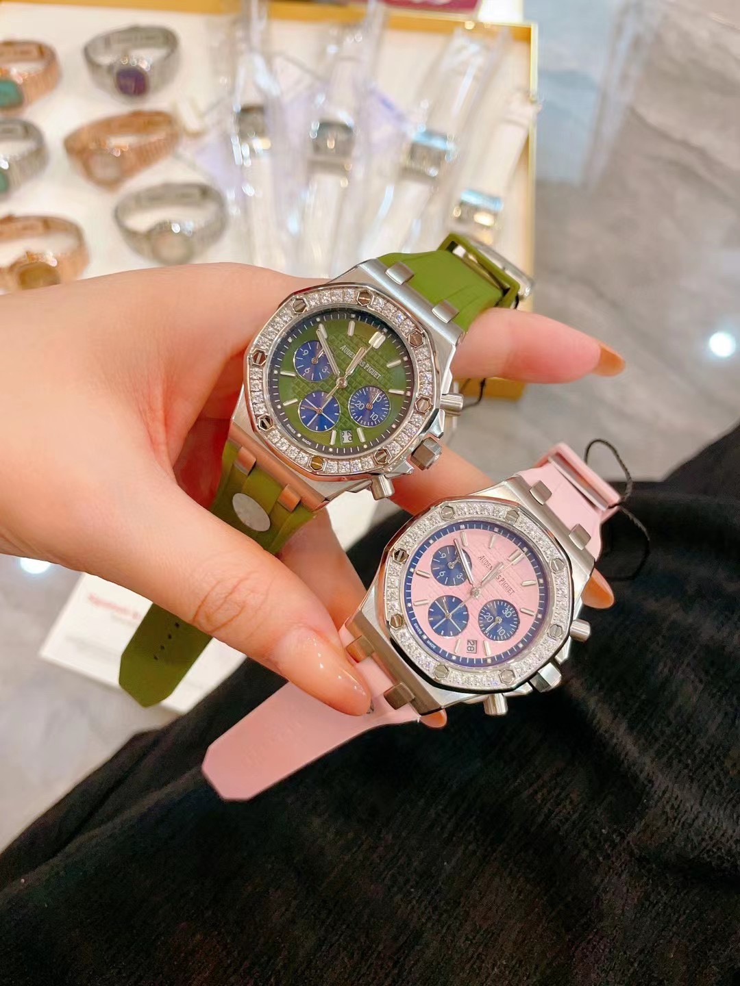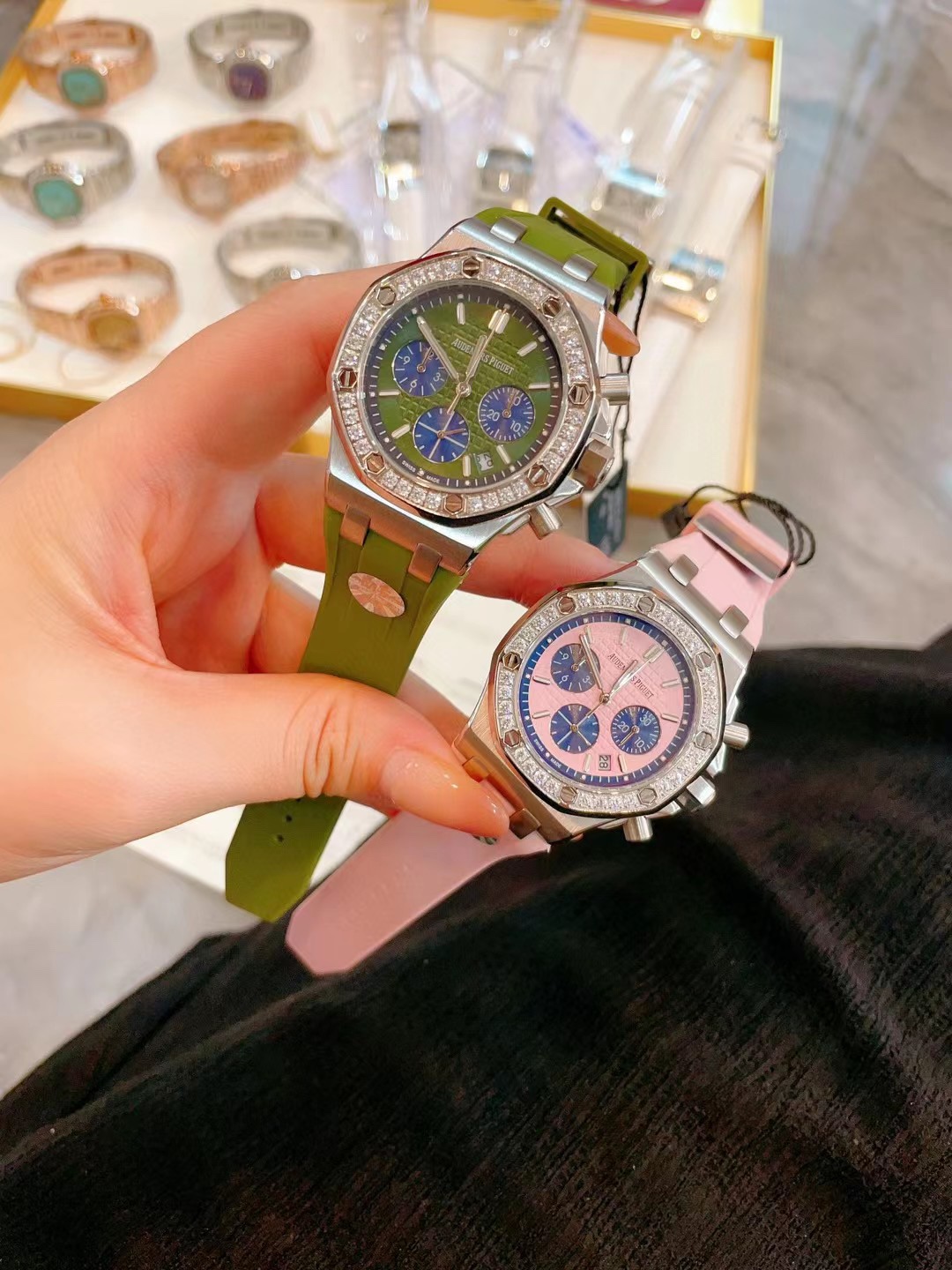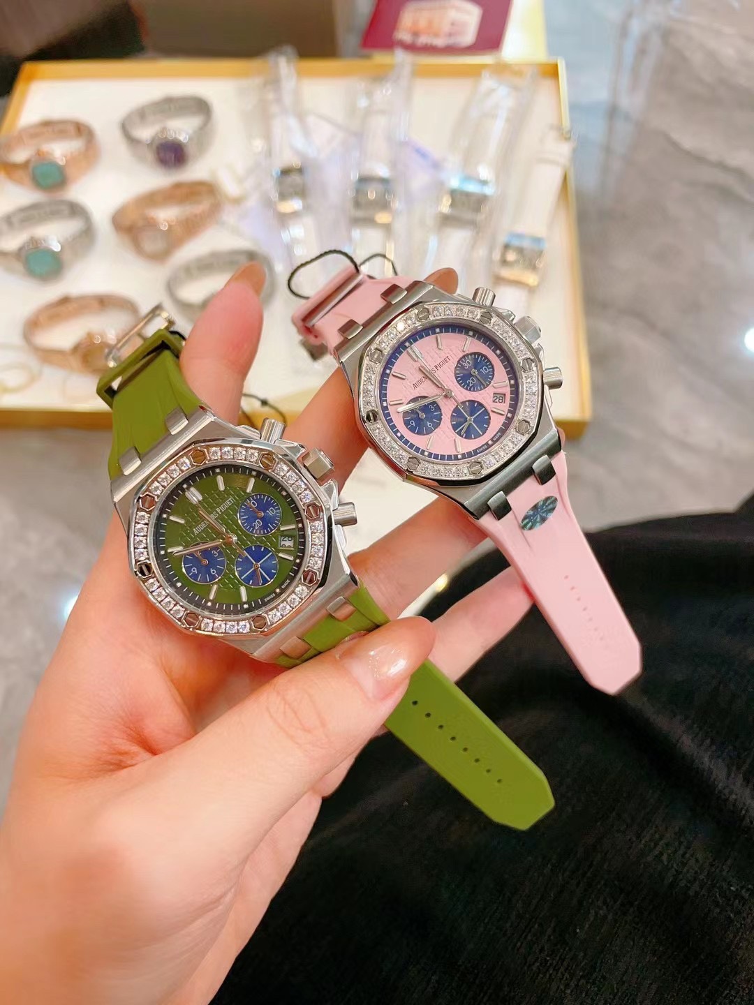 With box - Internet-famous hot style AP Audemars Piguet Royal Oak series, almost every beauty has one! Stainless steel case set with diamonds, octagonal diamond bezel design, imported Japanese multi-function quartz movement, stable with chronograph function, sapphire crystal scratch-resistant glass, uses food-grade safe rubber strap, skin-friendly and non-toxic, versatile size 37mm suitable for any woman's wrist, MF factory high version worth having.