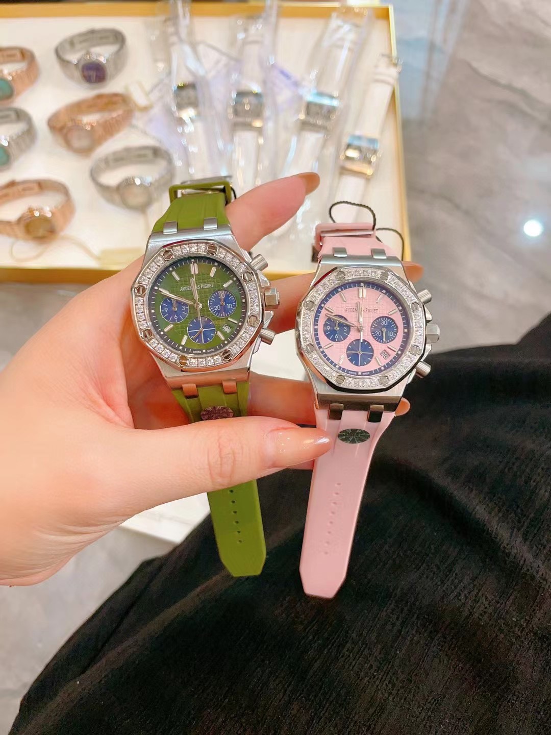 Matching Box - Popular AP Royal Oak Series for Women. Stainless steel case with diamond bezel, Japanese multi-function quartz movement, sapphire crystal, food-grade rubber strap, 37mm universal size. High-quality MF factory version.