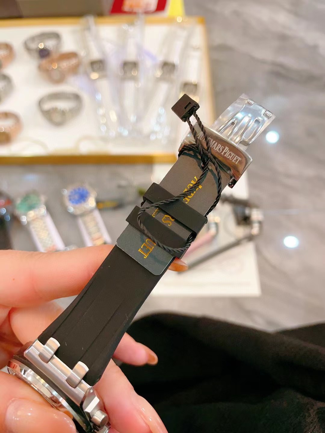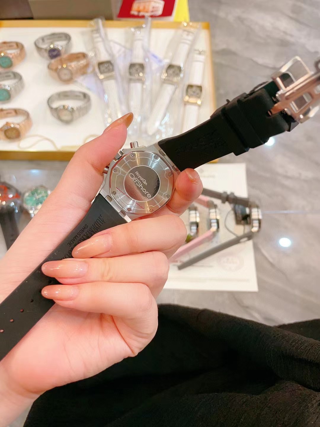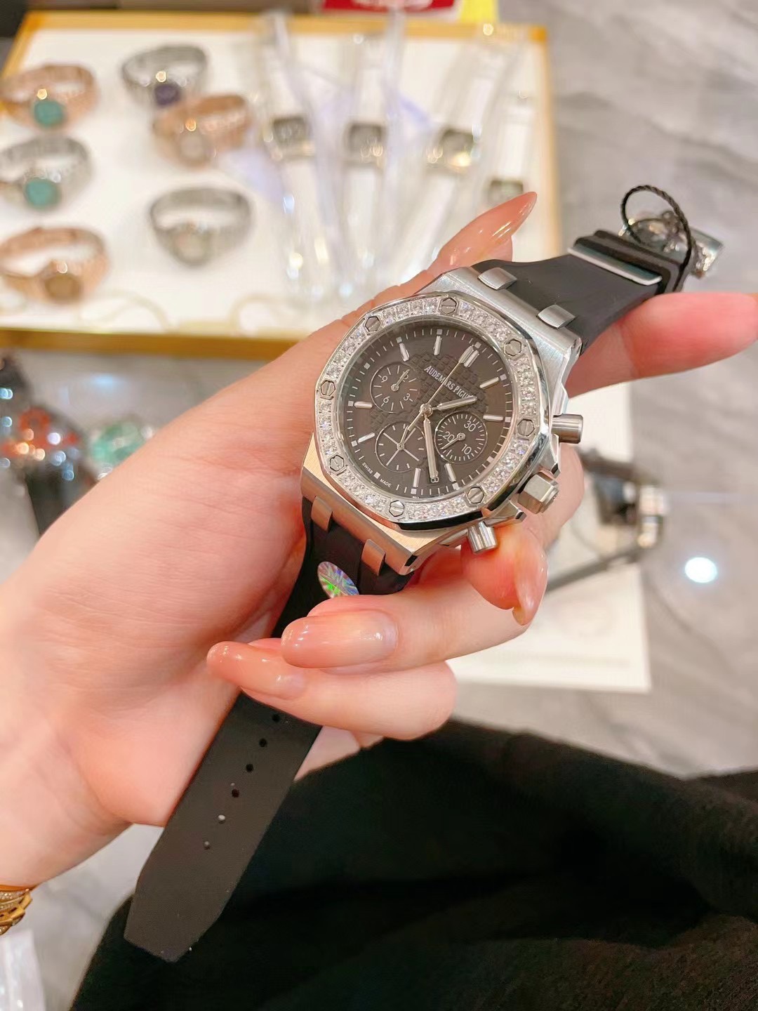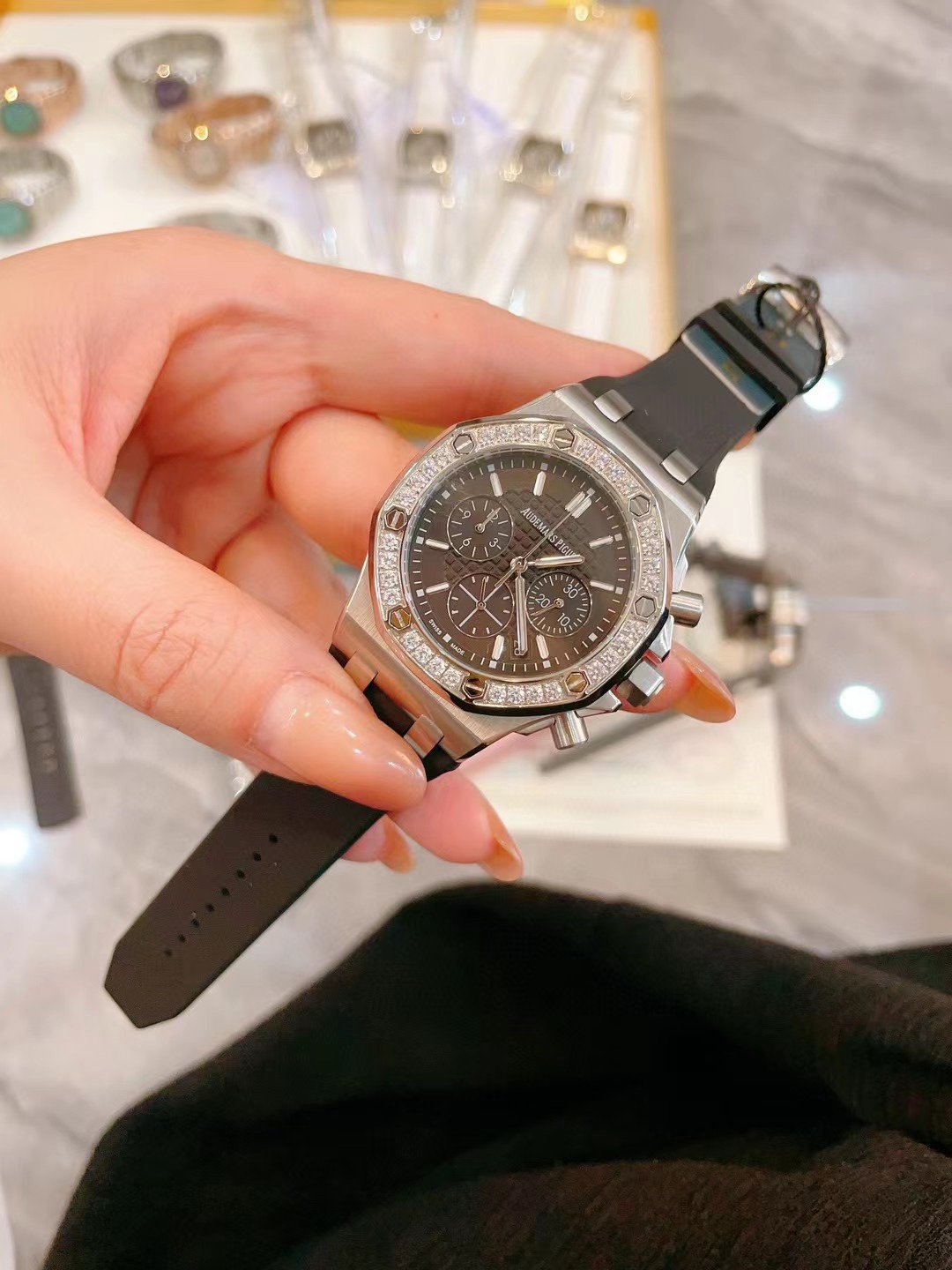 With box - Internet-famous hot style AP Audemars Piguet Royal Oak series, almost every beauty has one! Stainless steel case with diamond-set octagonal diamond bezel design, imported Japanese multi-function quartz movement, stable with chronograph function, sapphire crystal scratch-resistant glass, uses food-grade safe rubber strap, skin-friendly and non-toxic. Versatile size 37mm, suitable for any lady's wrist. MF factory high version, worth having.