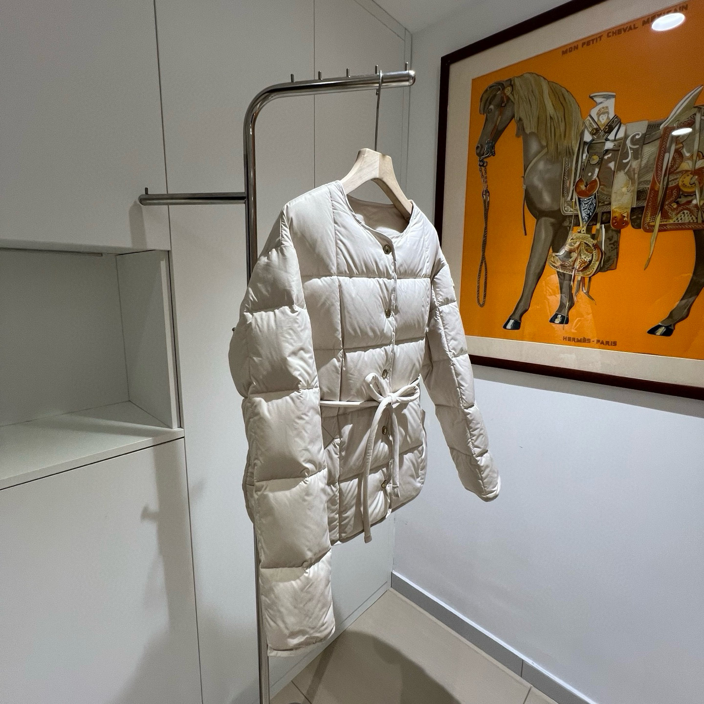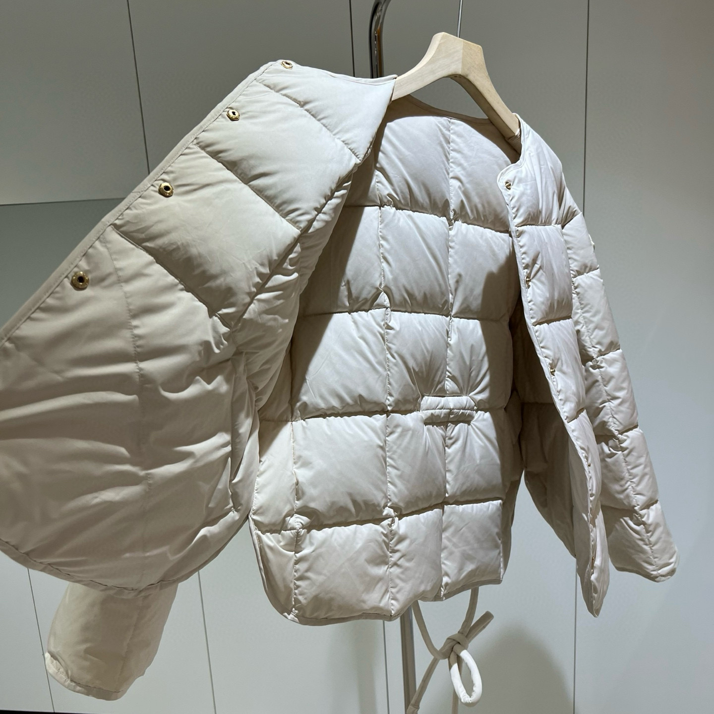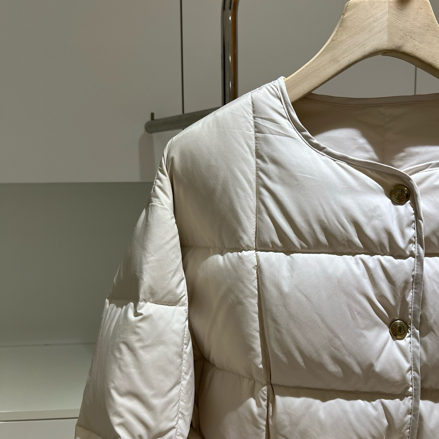 · Minimalist details: The round neck design neatly fits the neckline, paired with metallic gold buttons, interpreting understated luxury through the collision of cold metal and soft down.