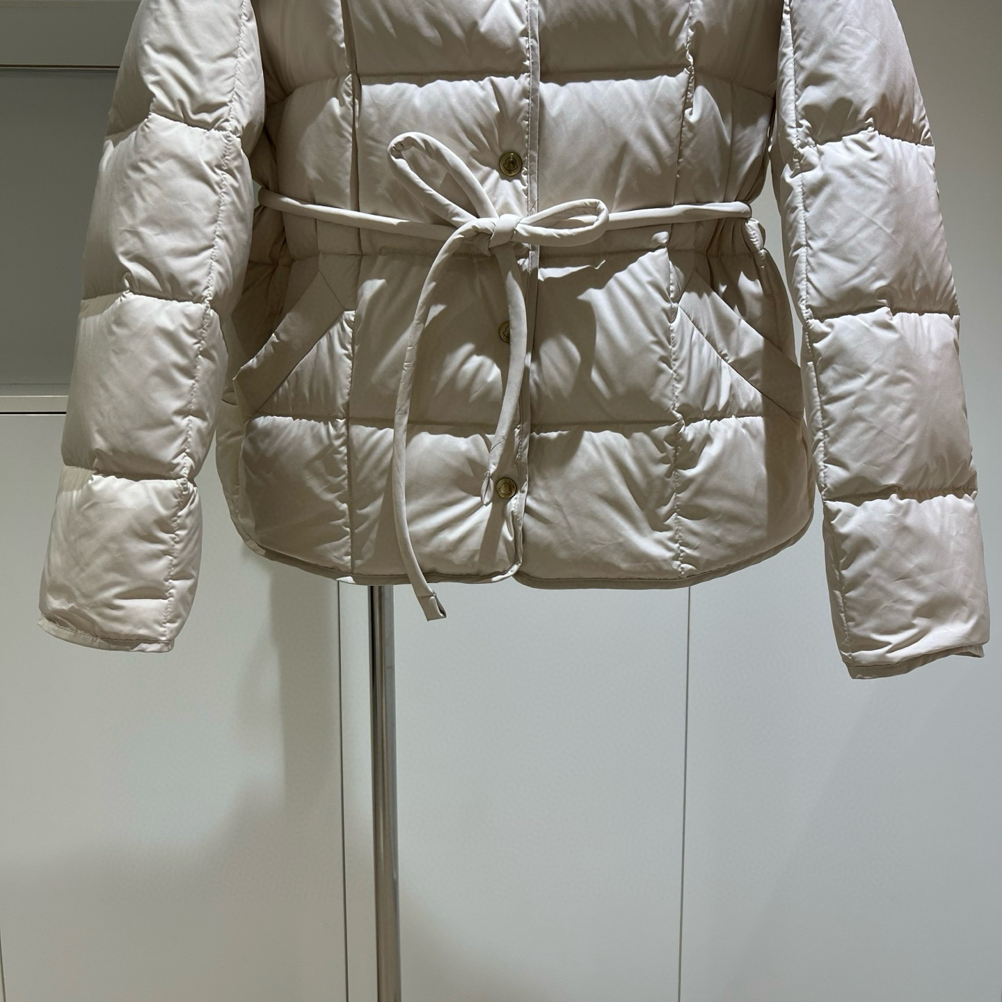 Moncler Caramagne women's short puffer jacket with adjustable belt. Loose boxy cut, horizontal quilting. Colors: Beige, Black. Sizes: 0-1-2.