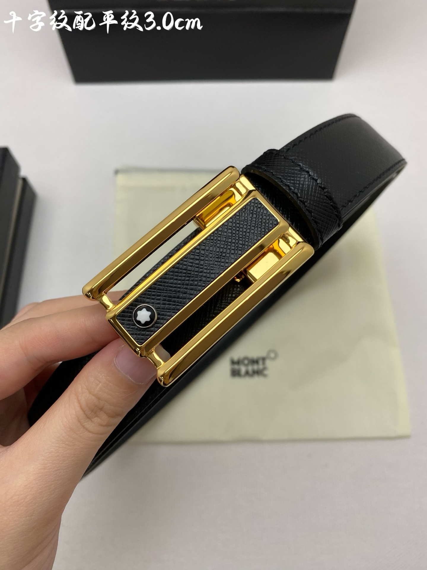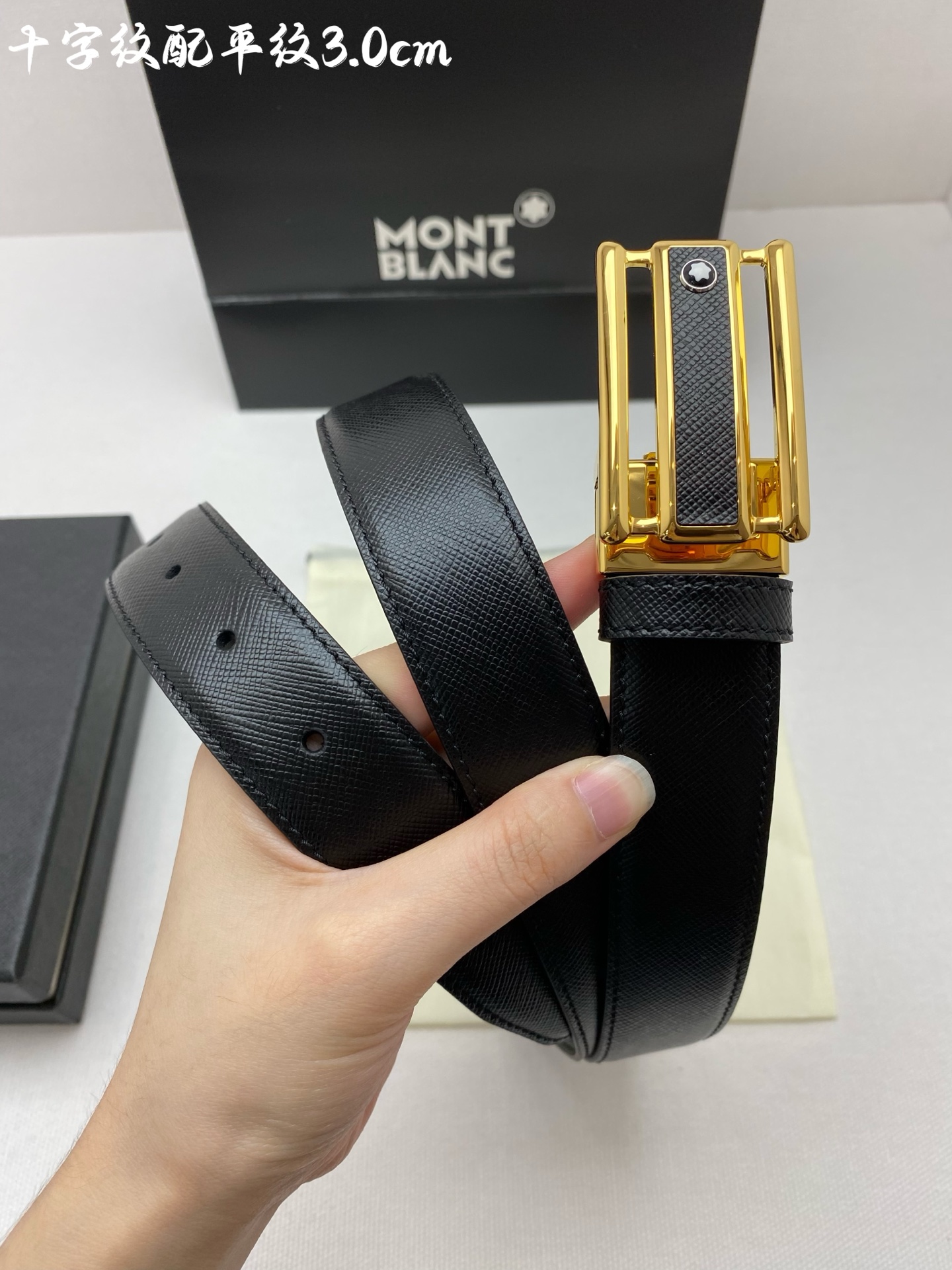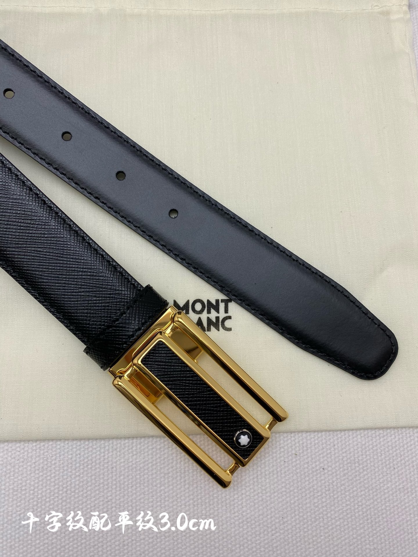 Montblanc 3.0cm wide imported leather belt with pin buckle, adjustable for business casual wear.