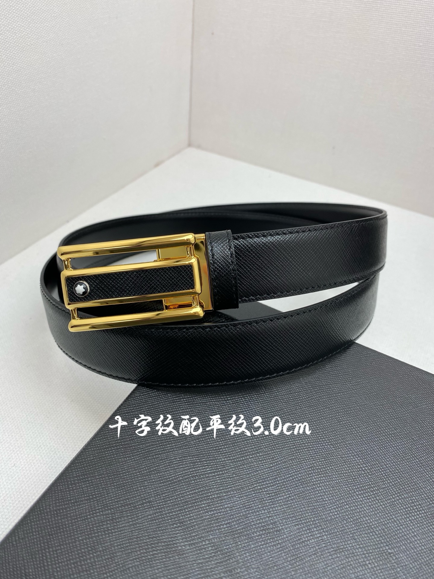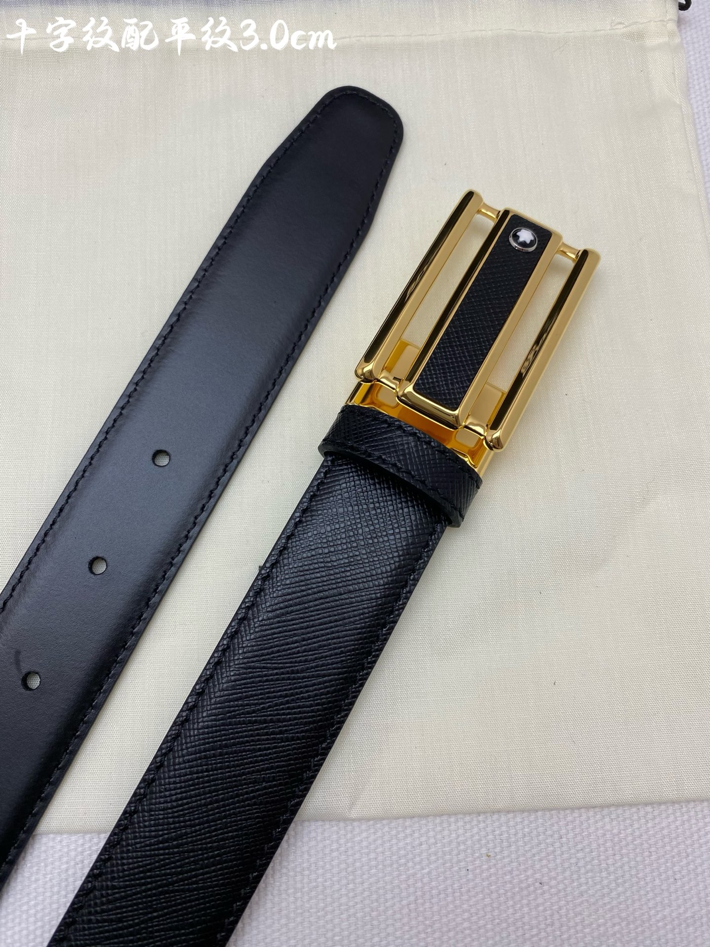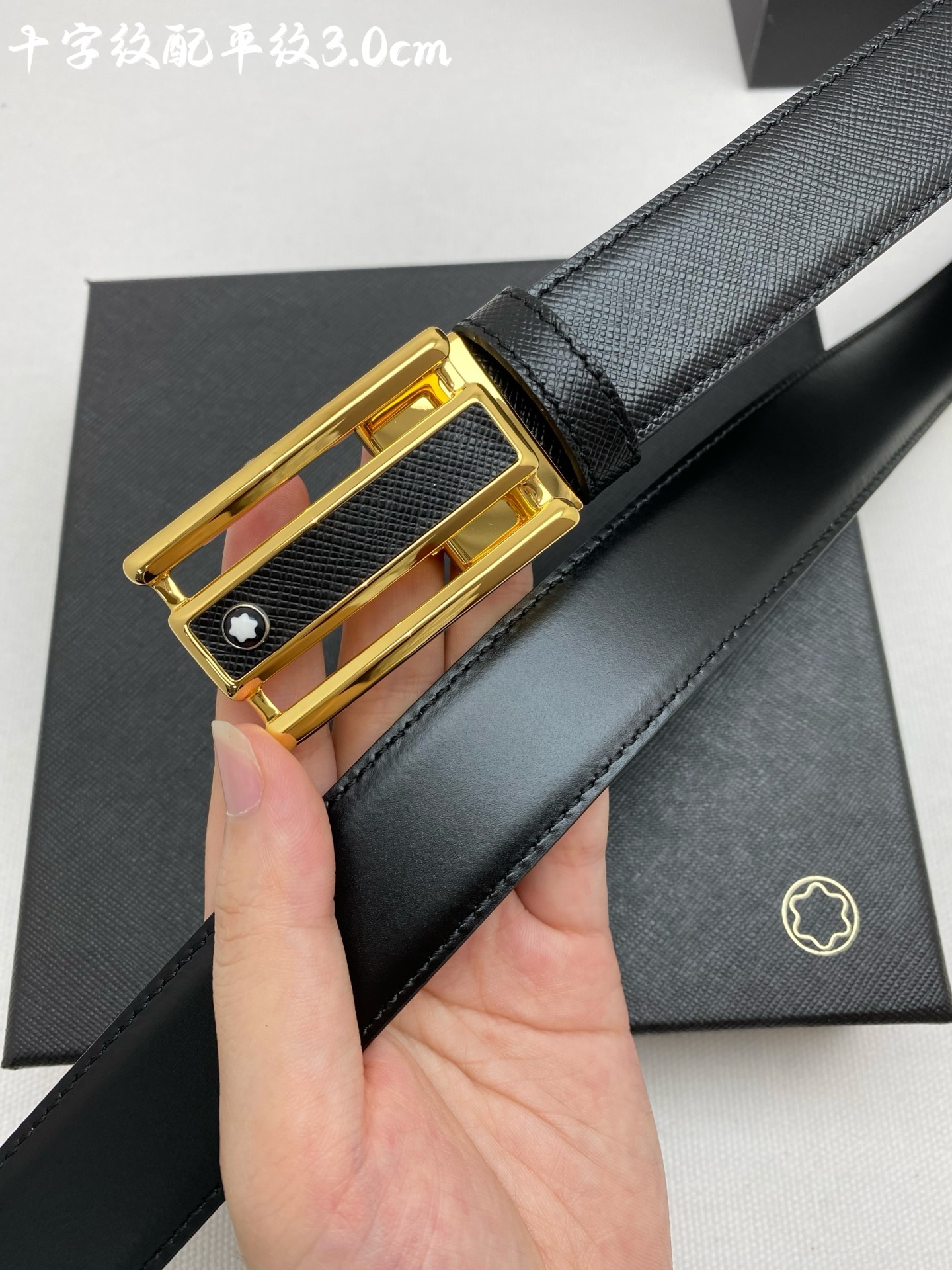 Montblanc 3.0cm wide imported leather belt with pin buckle, adjustable for business casual wear.