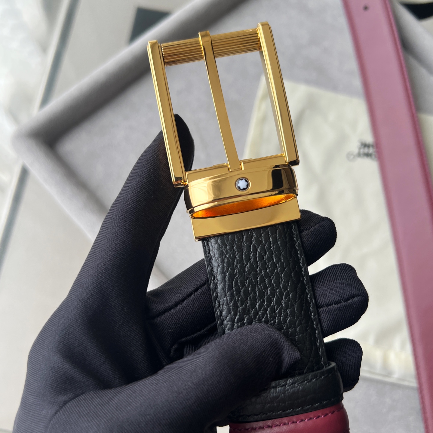 This double-sided belt is a versatile companion for multiple occasions, offering a unique combination of colors and textures. One side of the 35mm belt is made of blue grained leather, while the other side is made of smooth black leather, fastened together by a pin buckle adorned with the Montblanc hexagonal white star brand logo.