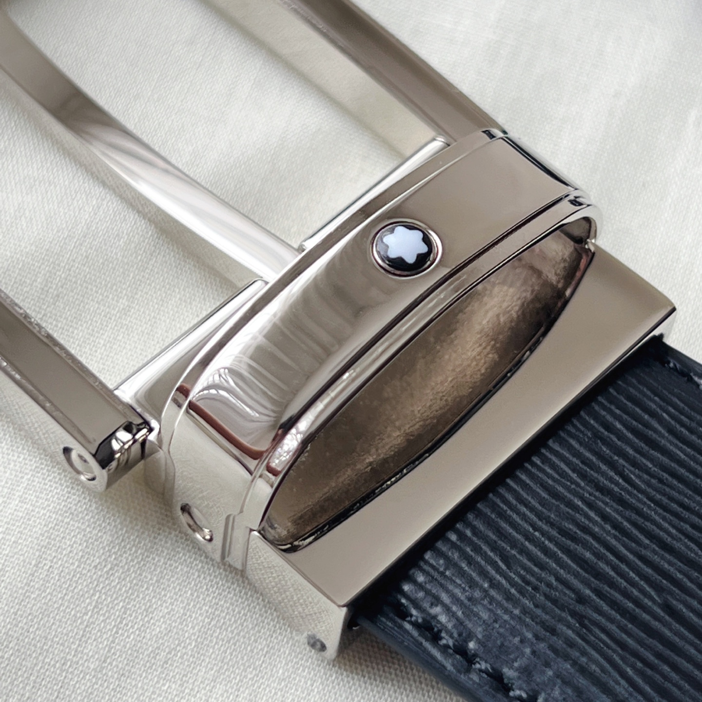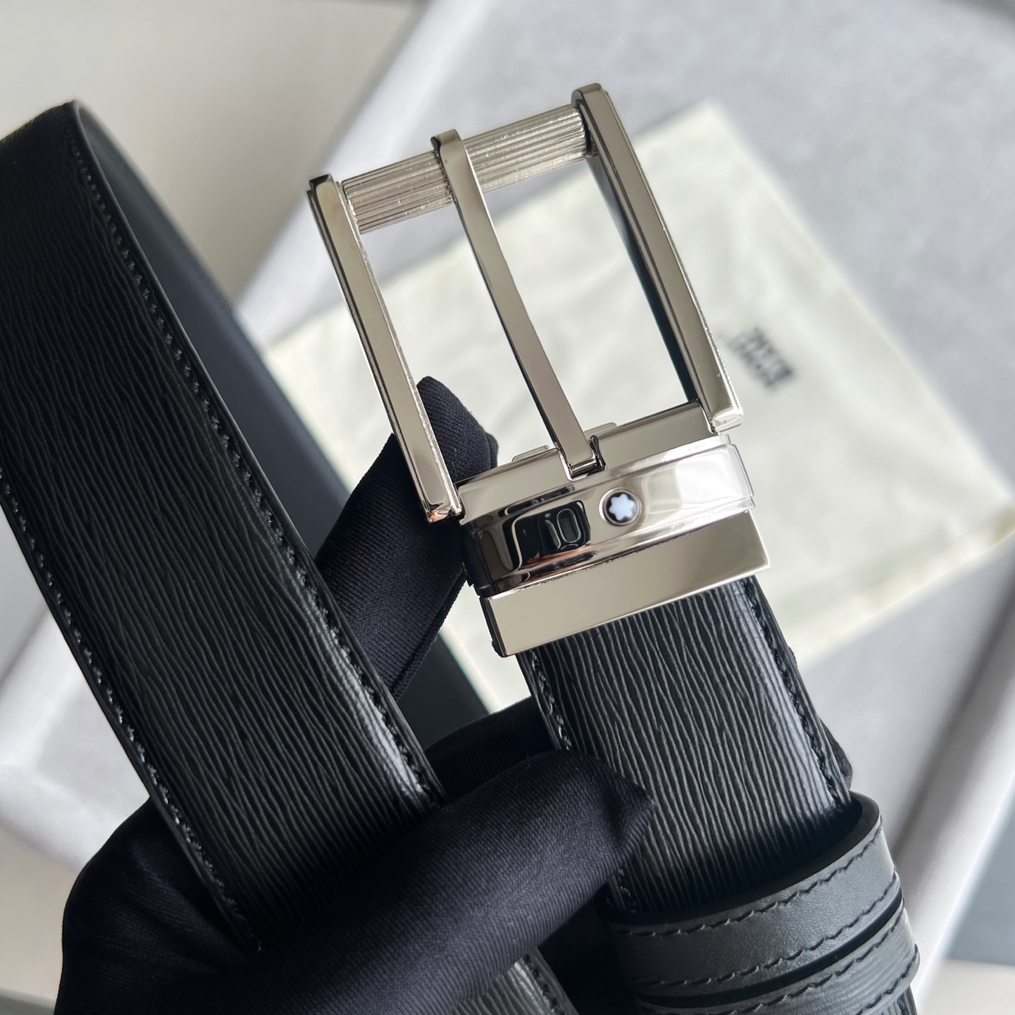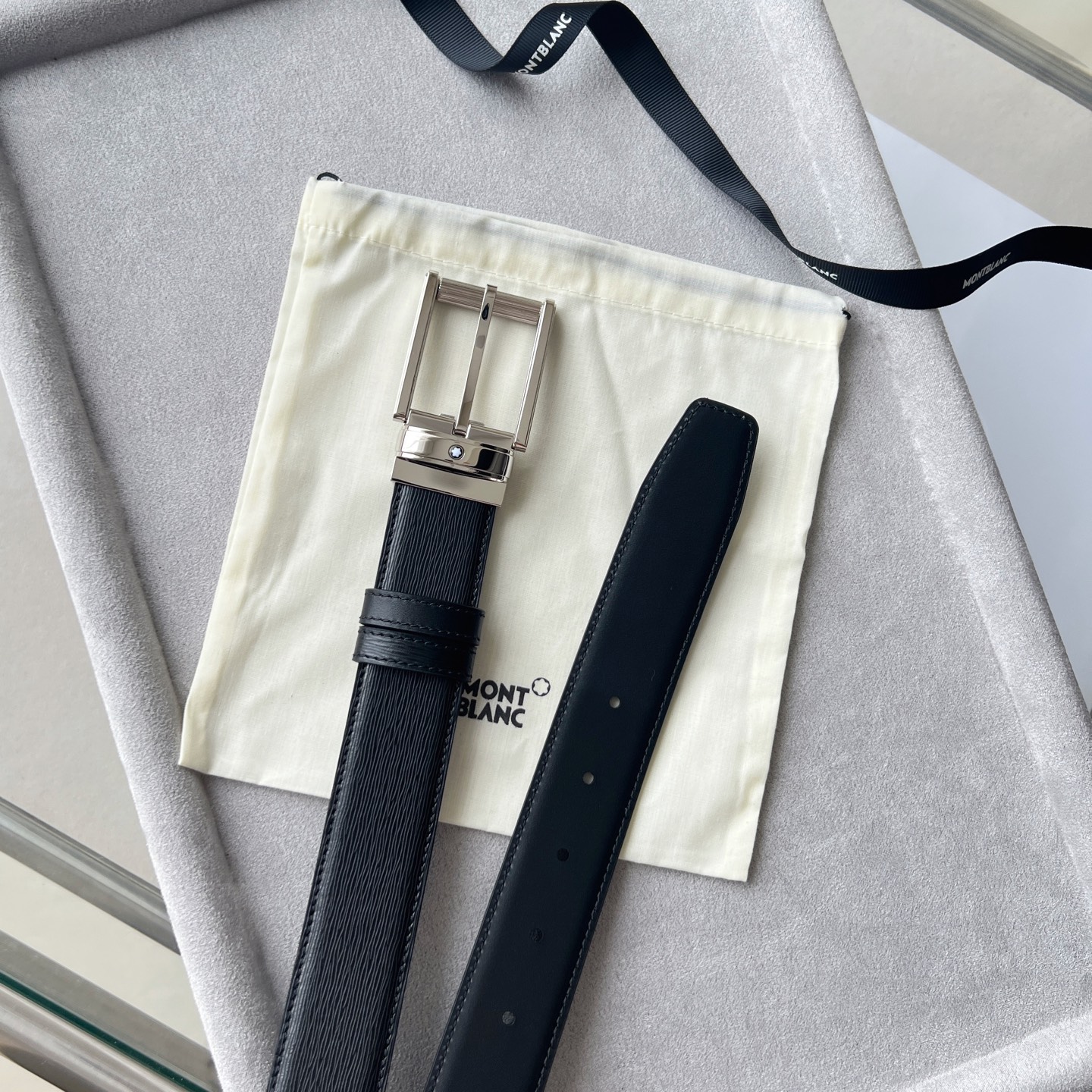 This double-sided belt is a versatile companion for multiple occasions, offering a unique combination of colors and textures. One side of the 35mm belt is made of blue grained leather, while the other side is made of smooth black leather, fastened together by a pin buckle adorned with the Montblanc hexagonal white star brand logo.