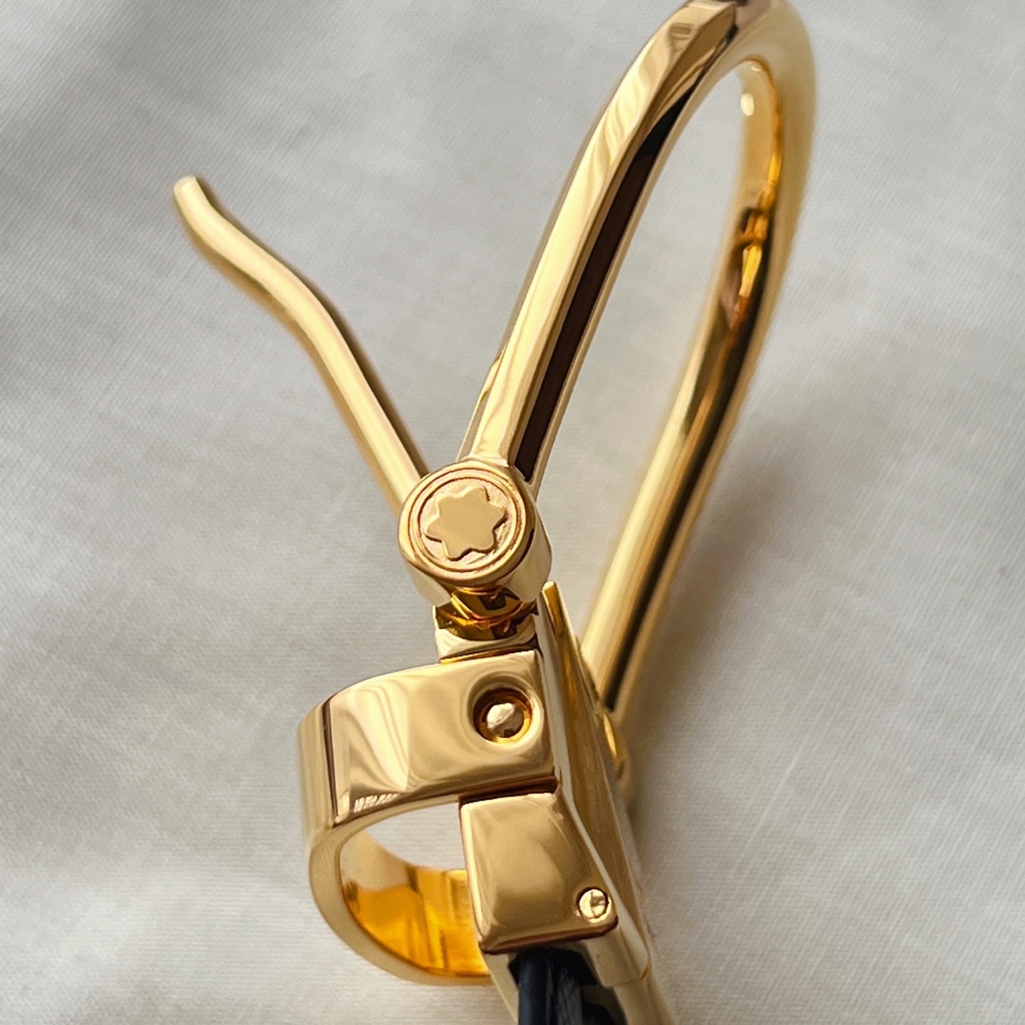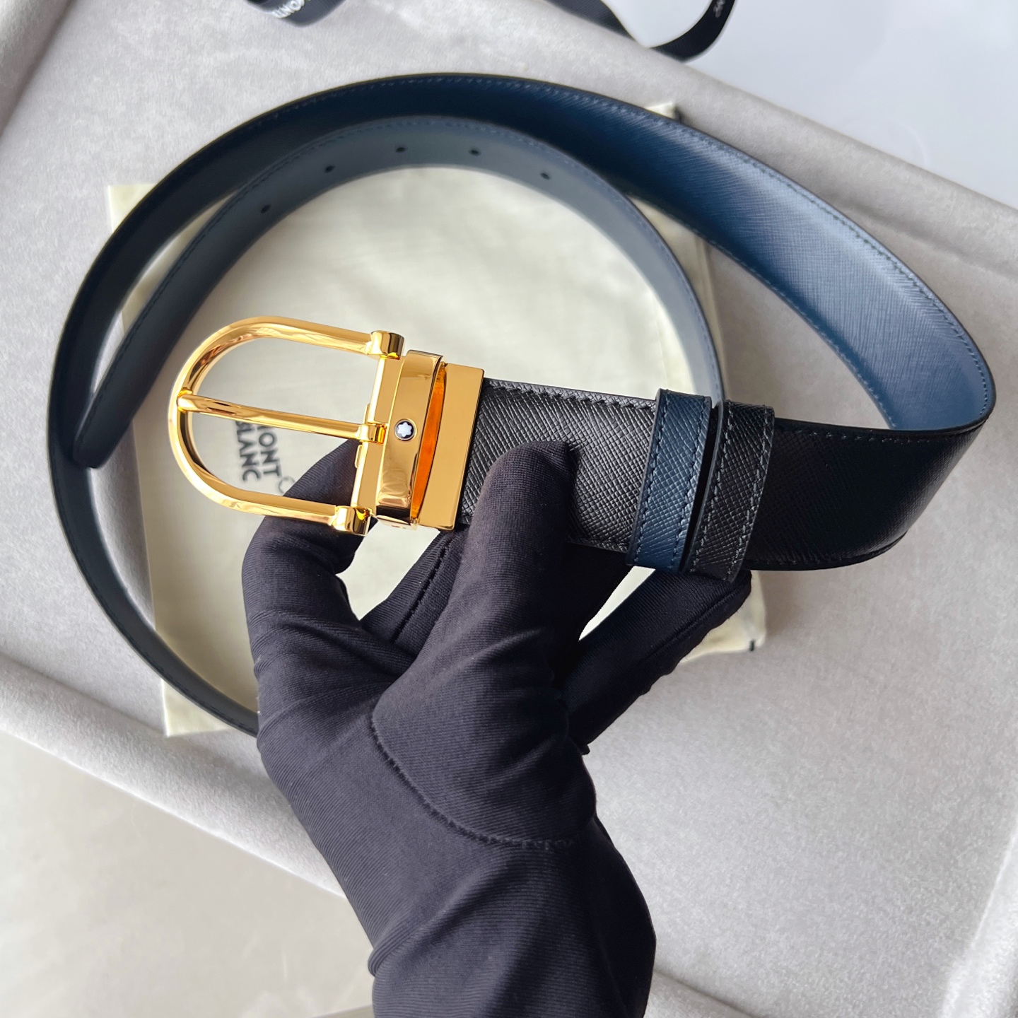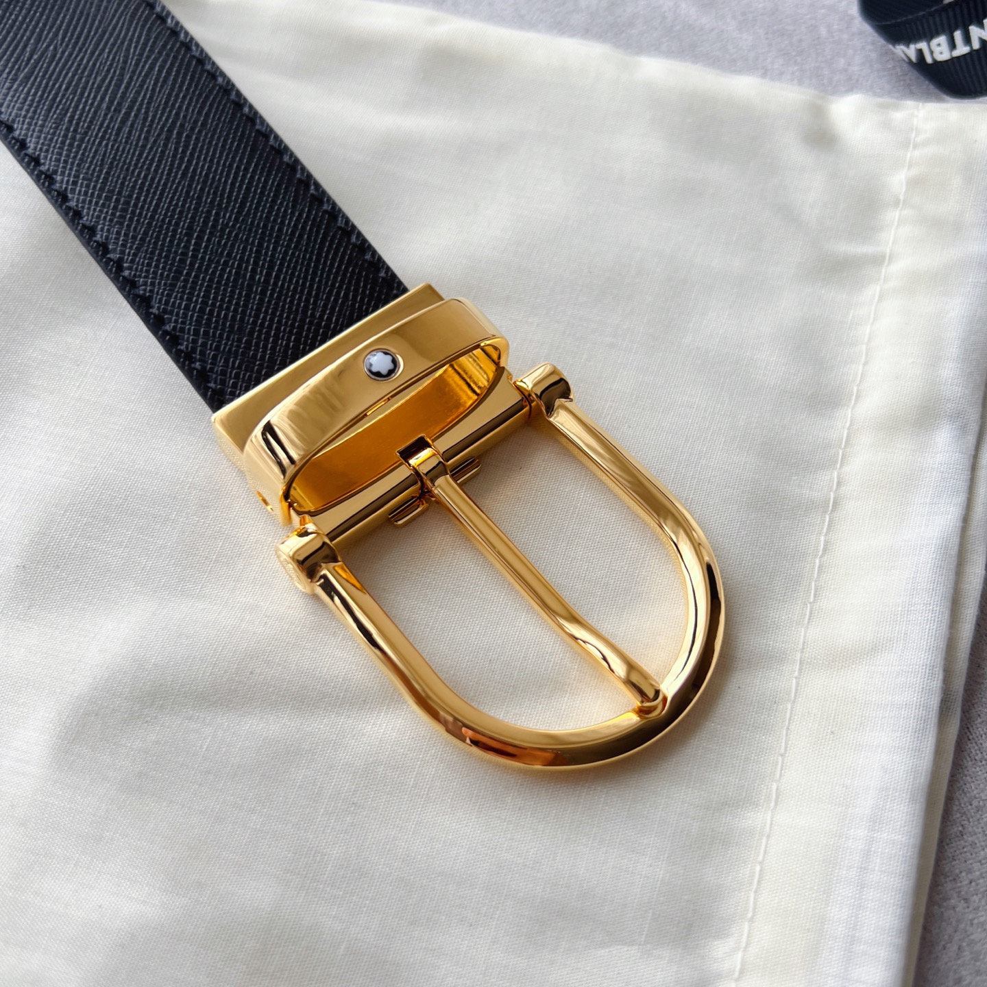 Montblanc Rectangular Buckle Black Belt (35mm) Rectangular stainless steel pin buckle. Adjustable length, 3.5 cm x 120 cm, black grained leather strap. This belt can handle both business occasions and modern fashion styling.
