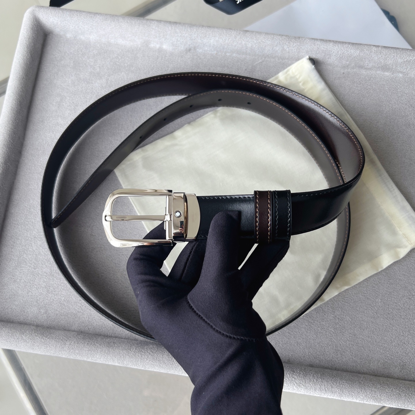 Montblanc Rectangular Buckle Black Belt (35mm) Rectangular stainless steel pin buckle. Adjustable length, 3.5 cm x 120 cm, black grained leather strap. This belt is suitable for both business occasions and modern fashion styles.