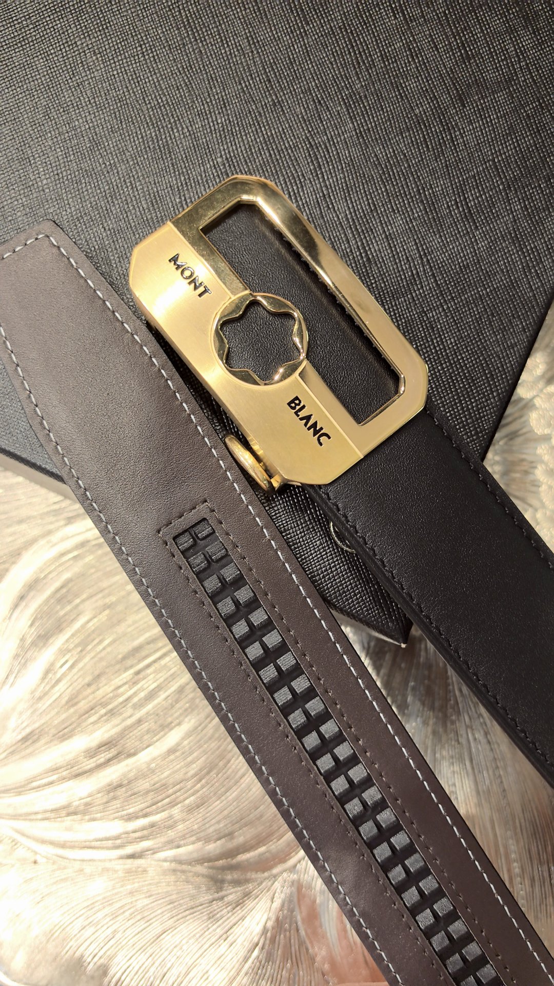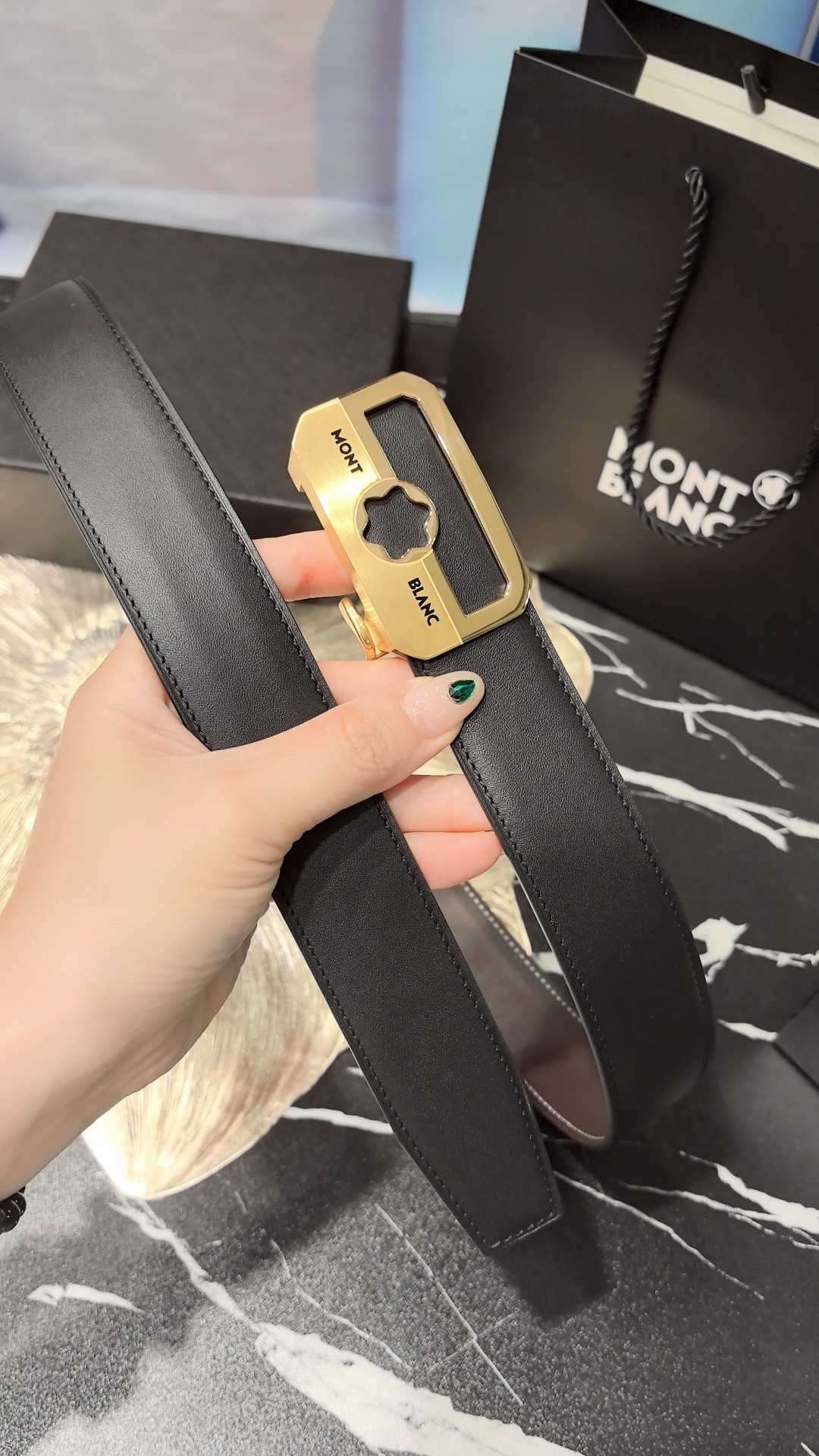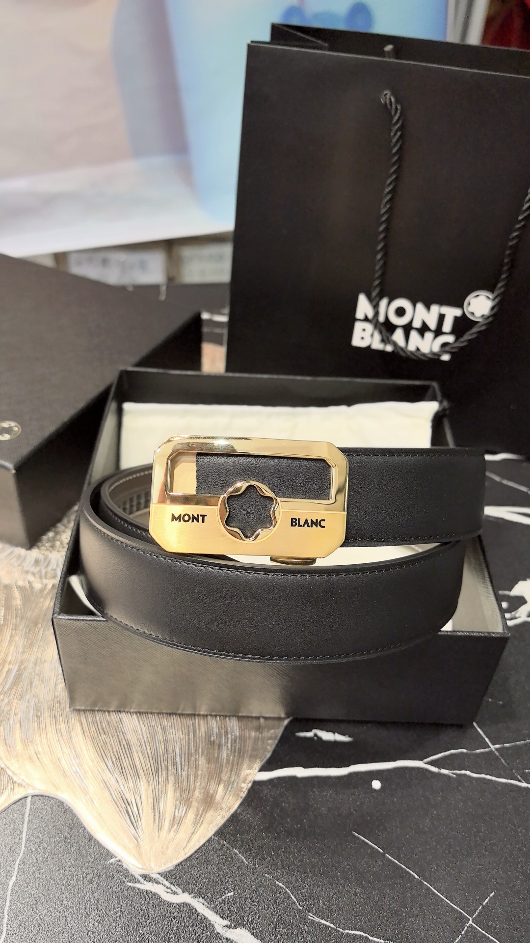 Montblanc original high-end quality, width 3.5 exquisite automatic steel buckle, Italian double-sided imported top-layer calfskin, original black and khaki, excellent feel, great on-body effect, men's favorite, business casual.