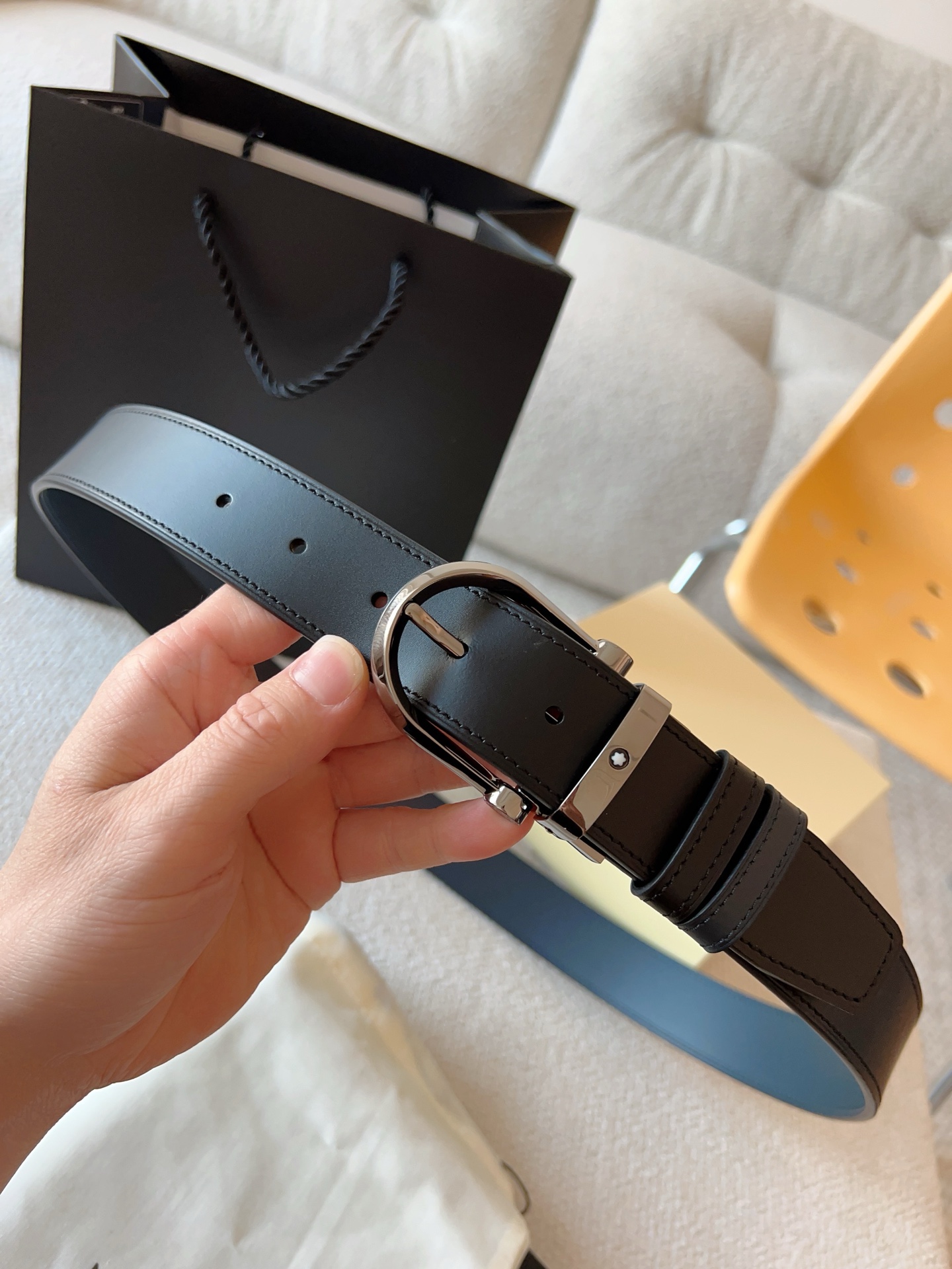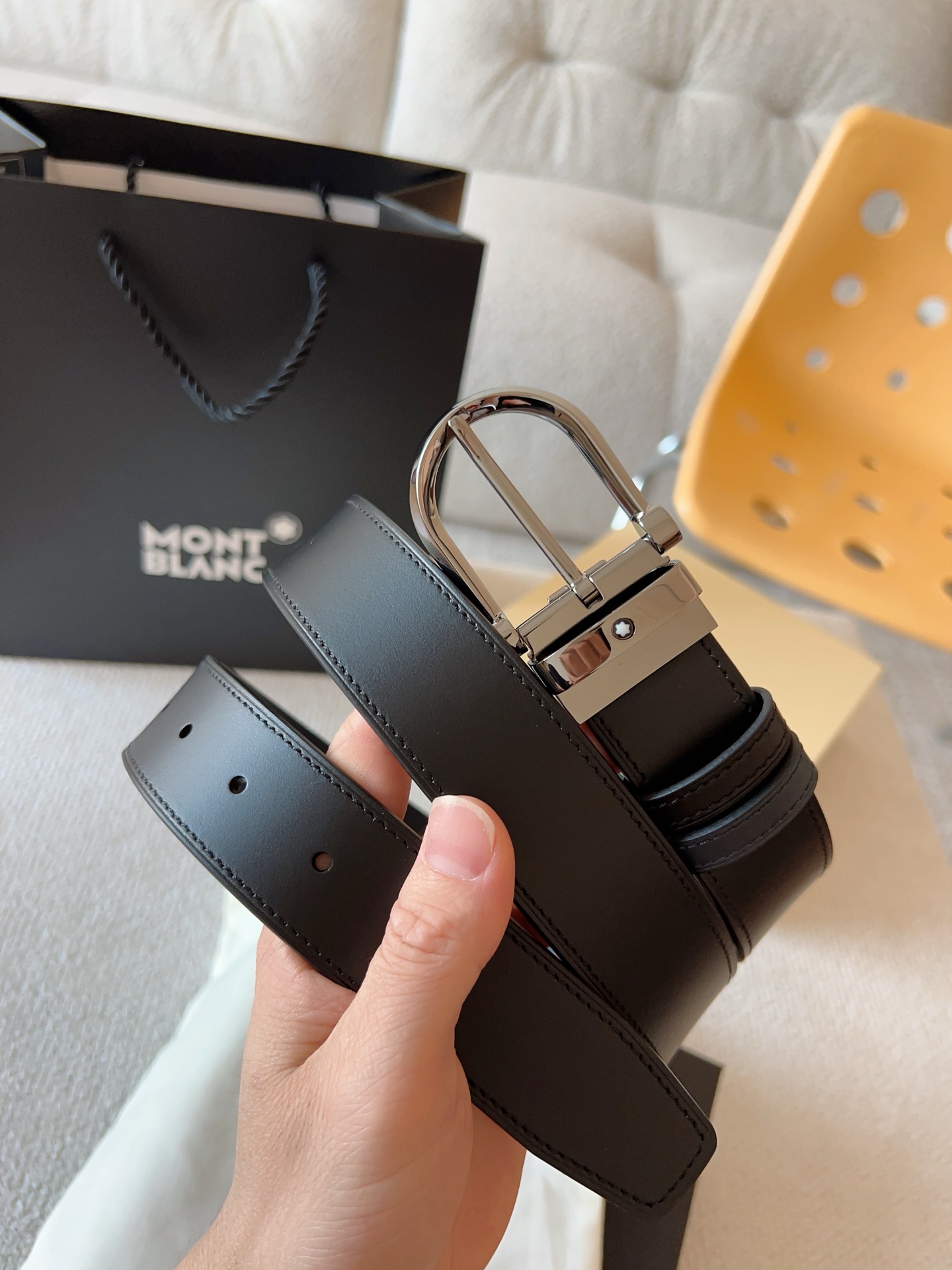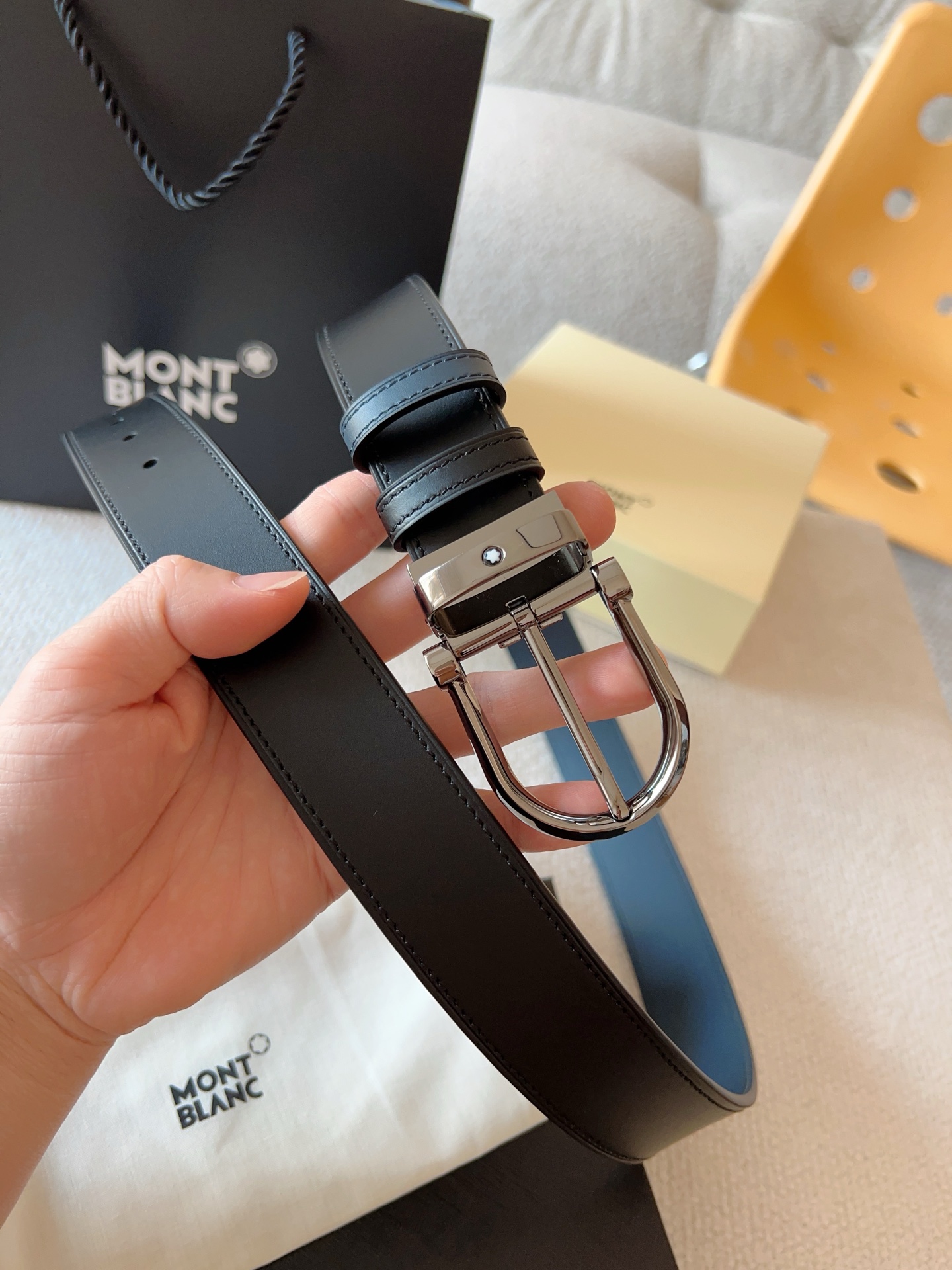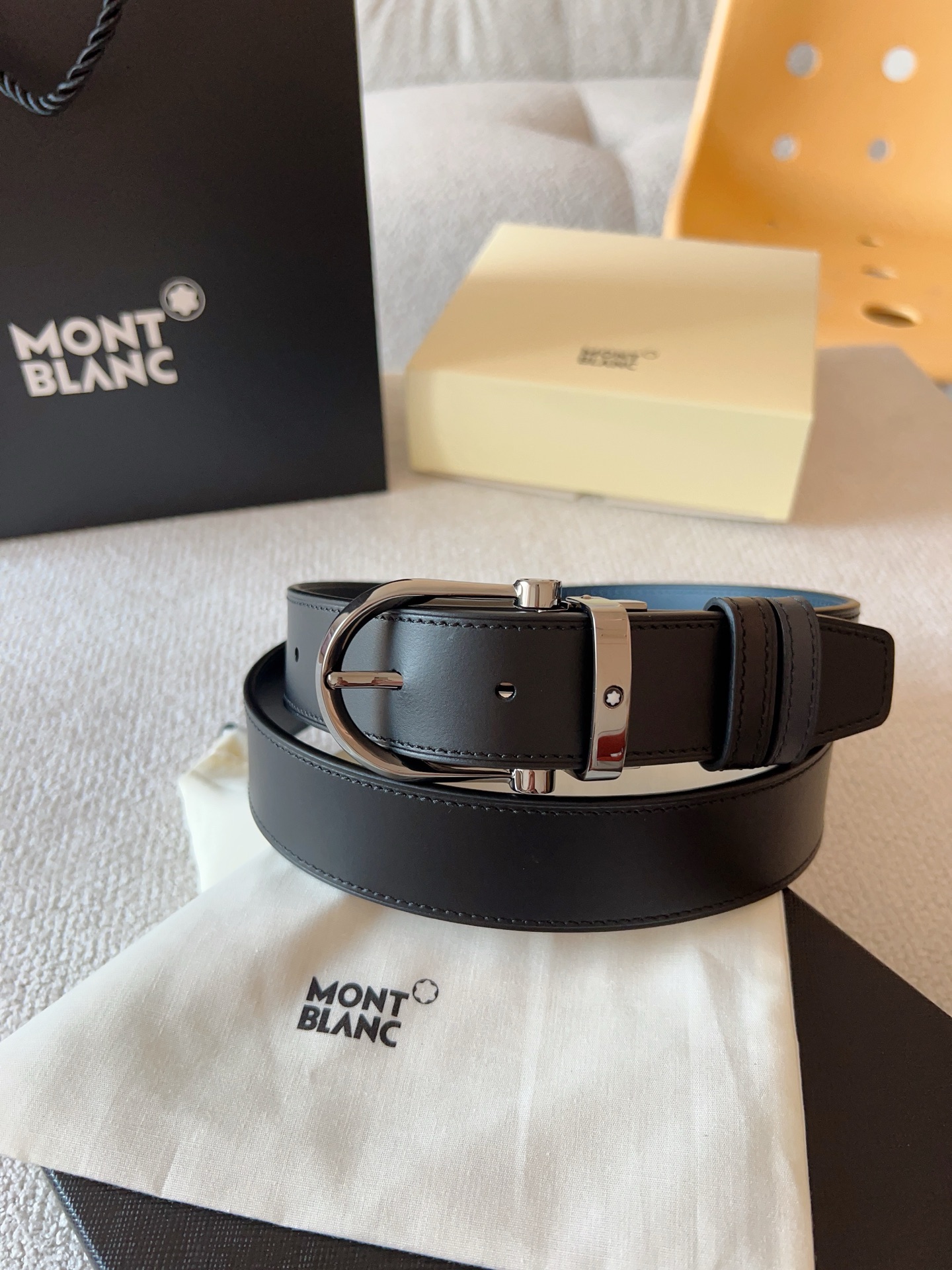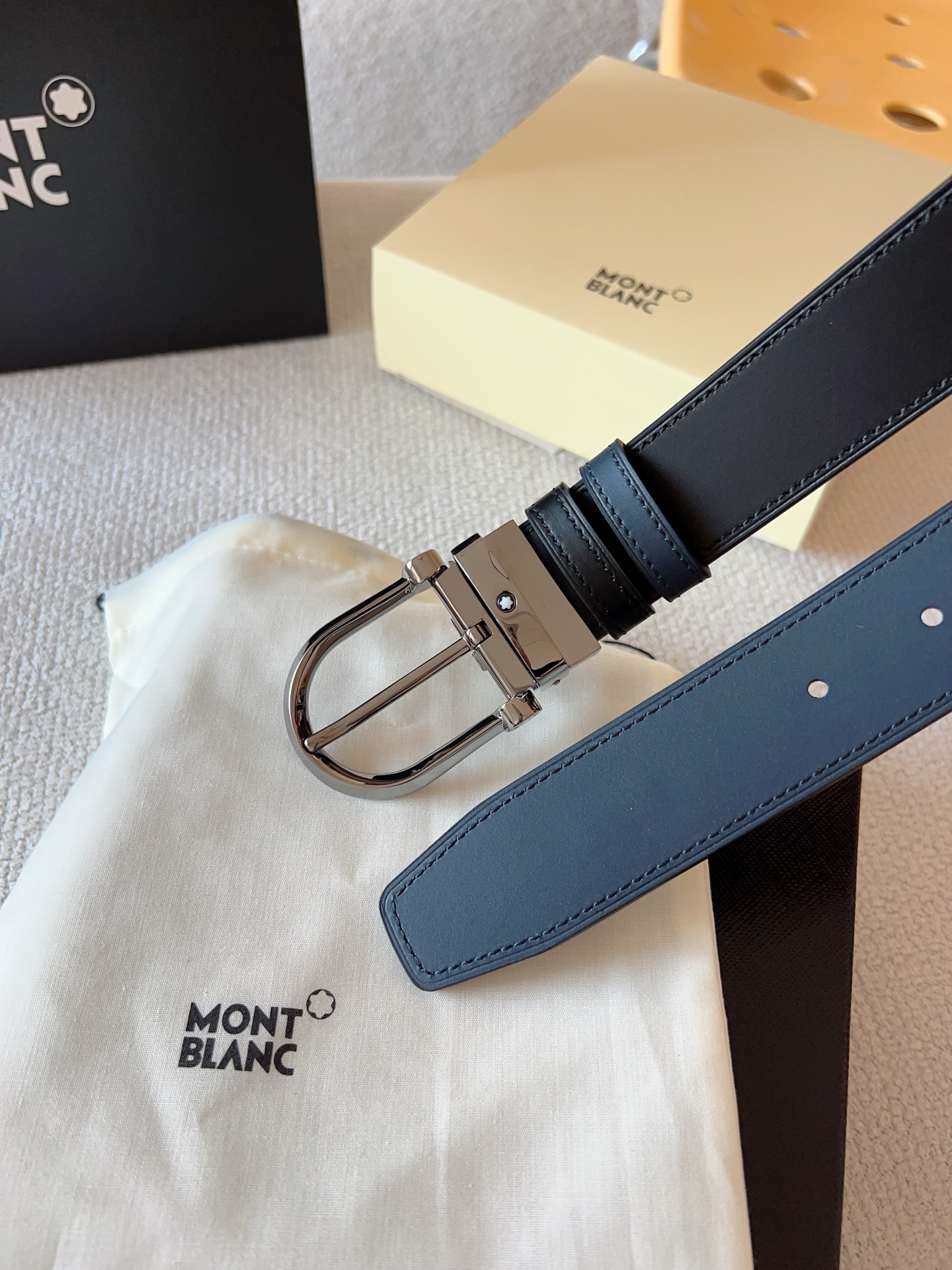 Montblanc, (New Model) Horseshoe-shaped Shiny Pin Buckle. The belt buckle features three-dimensional浮雕 craftsmanship, meticulously crafted with exquisite techniques and high-quality leather, presenting a unique charm; the belt length is adjustable, double-sided belt. Casual and elegant, refined and典雅; it is a must-have item for a men's wardrobe. Belt width: 35mm