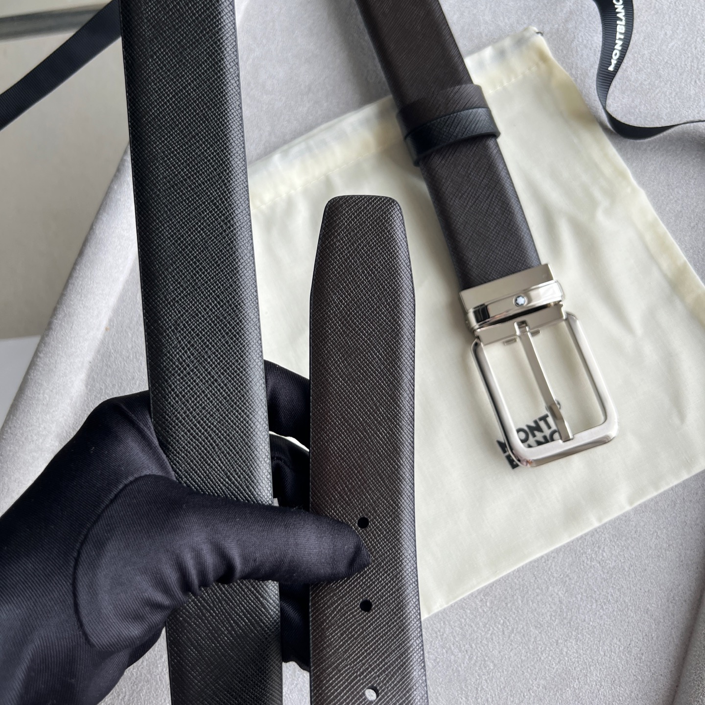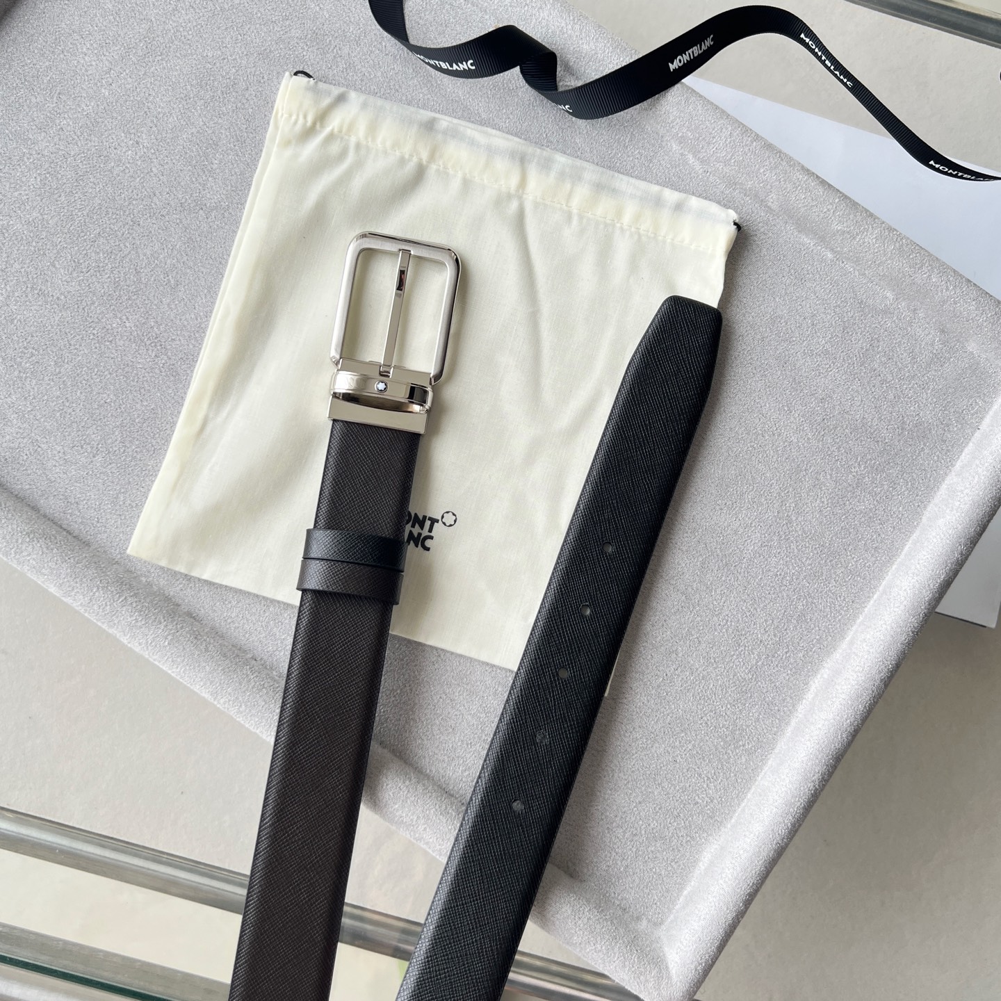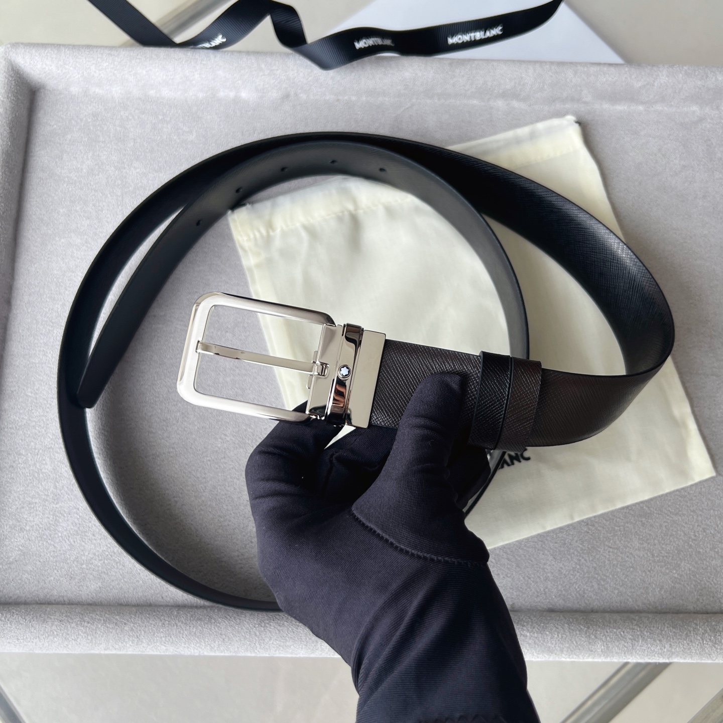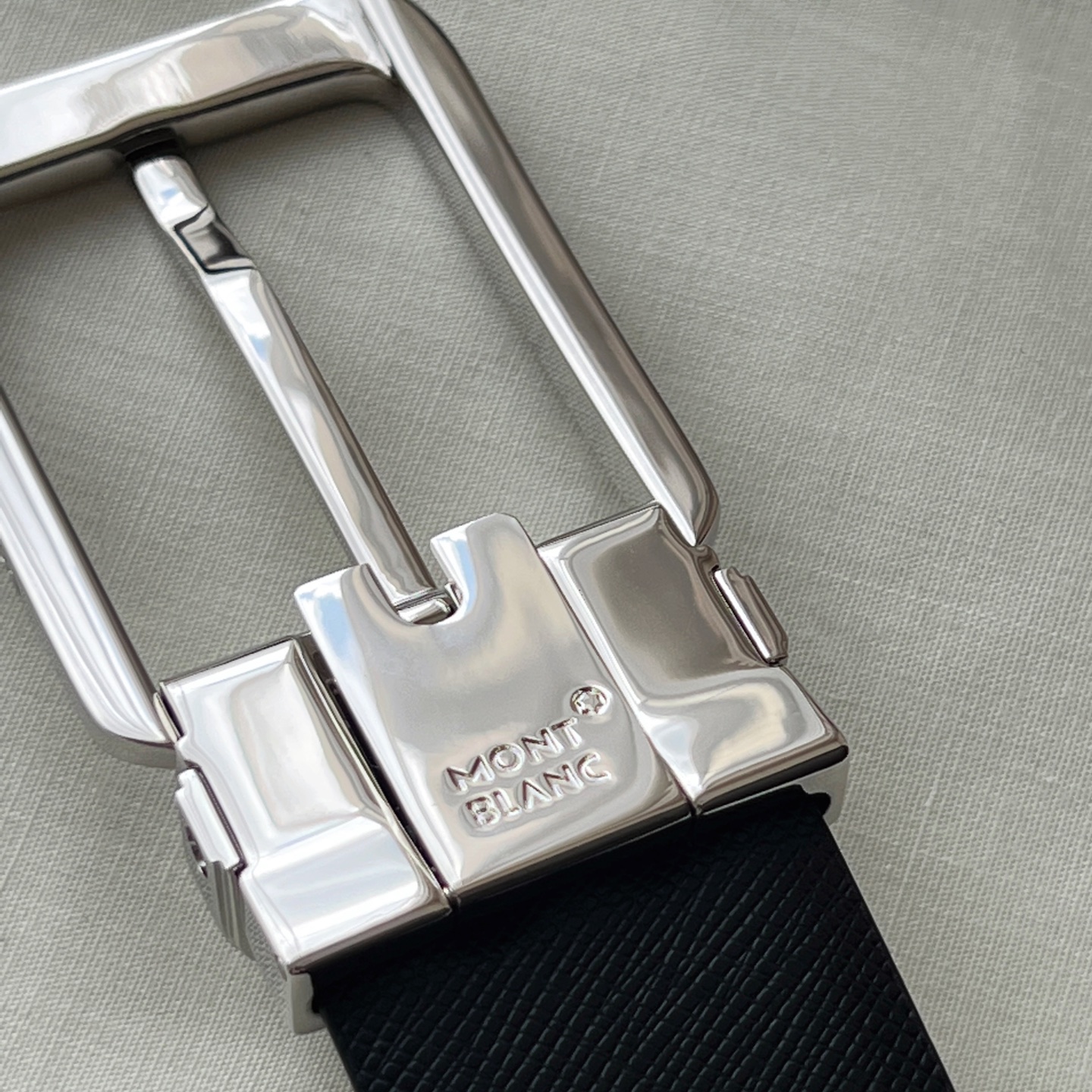 Montblanc Rectangular Buckle Black Belt (35mm) Rectangular stainless steel pin buckle. Adjustable length, 3.5 cm x 120 cm, black and gray grained leather strap. This belt is suitable for both business occasions and modern fashion styling.